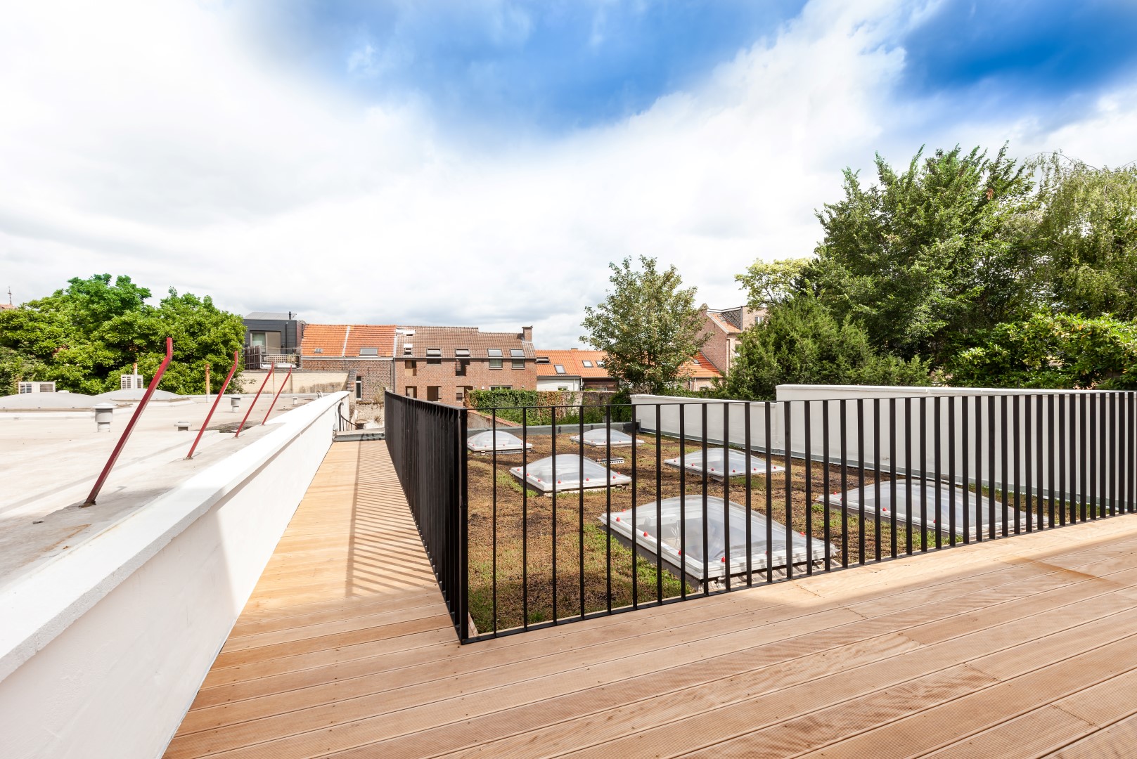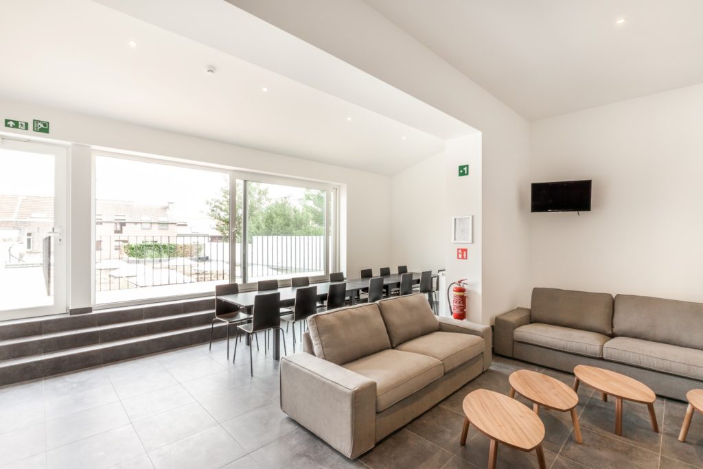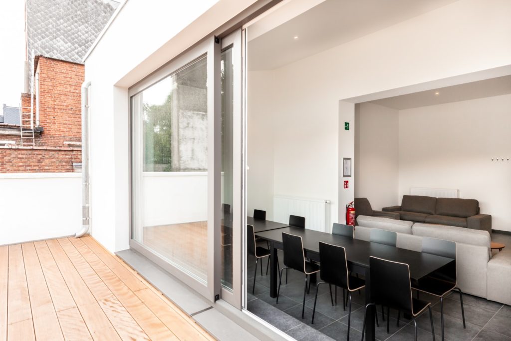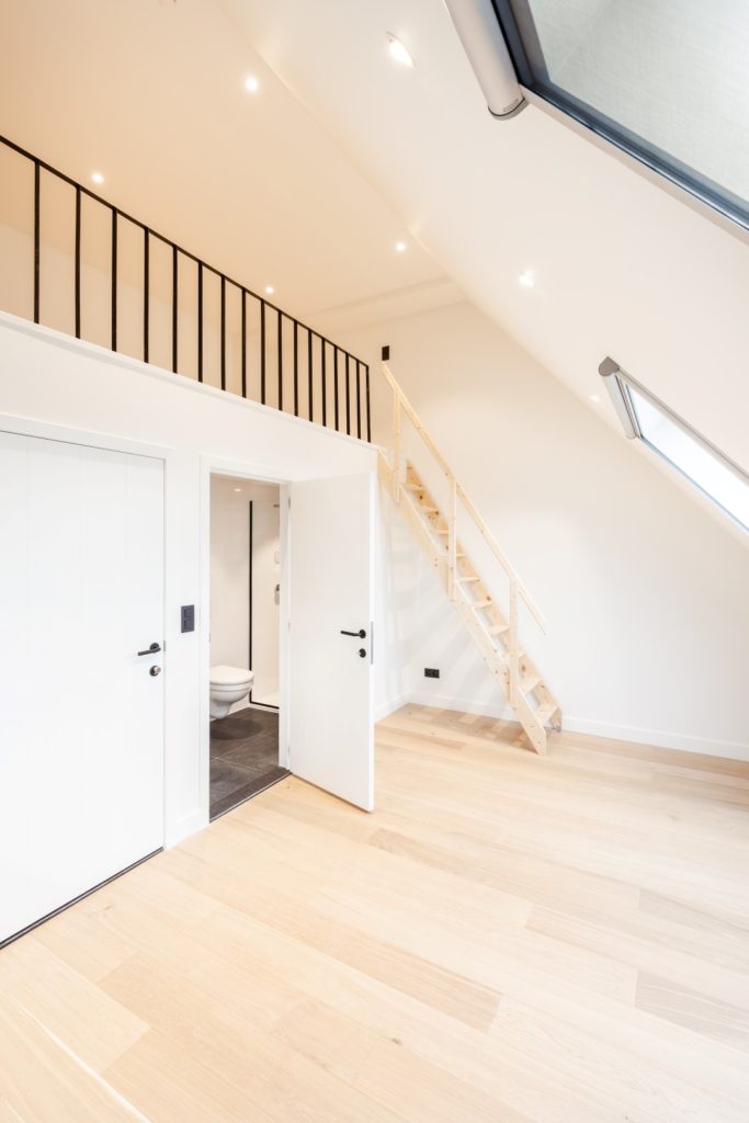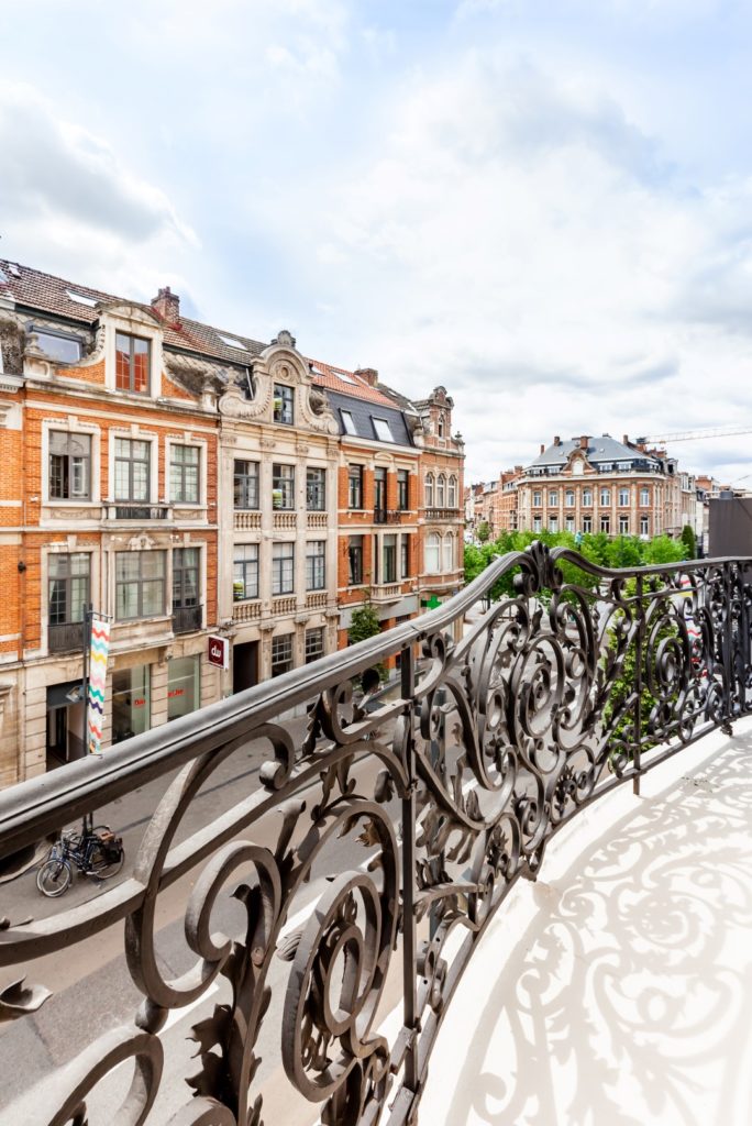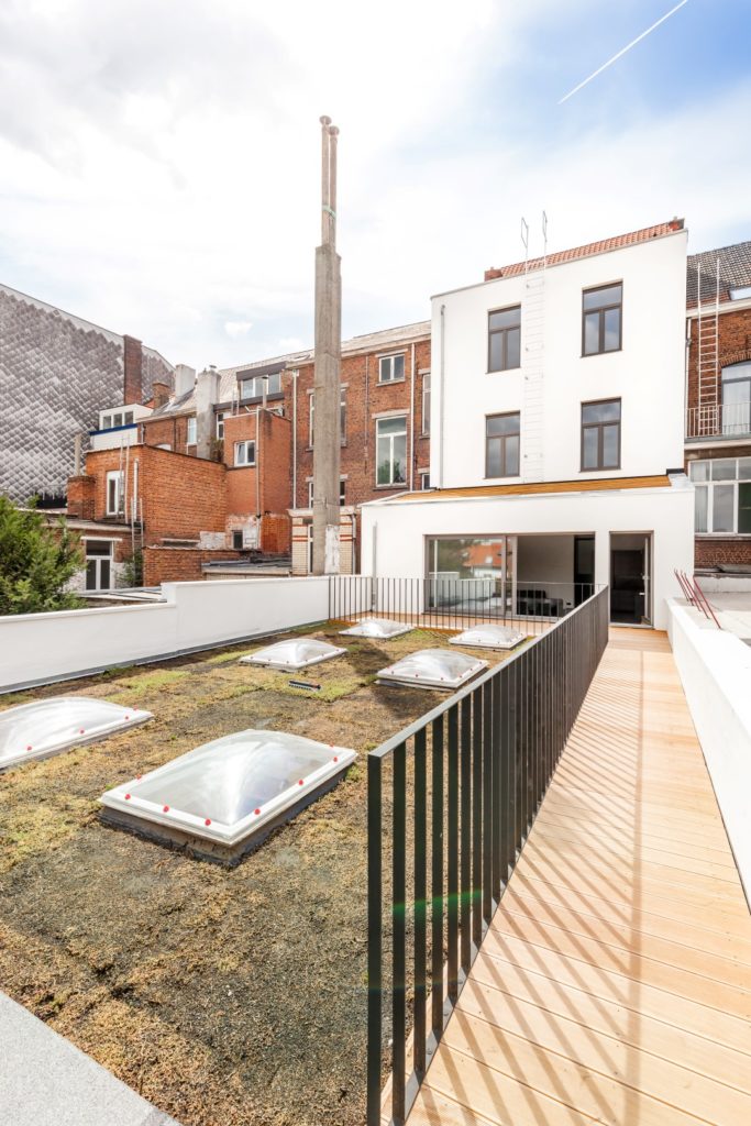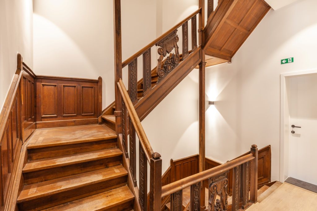 Het pand werd verbouwd in overleg met monumentenbeleid en met respect voor de erfgoedwaarde. Bij de realisatie van de zolderverdieping op het originele plat dak, werd het zenitaal licht behouden. Zo geven de woongelegenheden uit op een mooi verlichte centrale traphall waarin de oorspronkelijke majestueuze ‘kasteeltrap’ behouden en gerestaureerd werd.