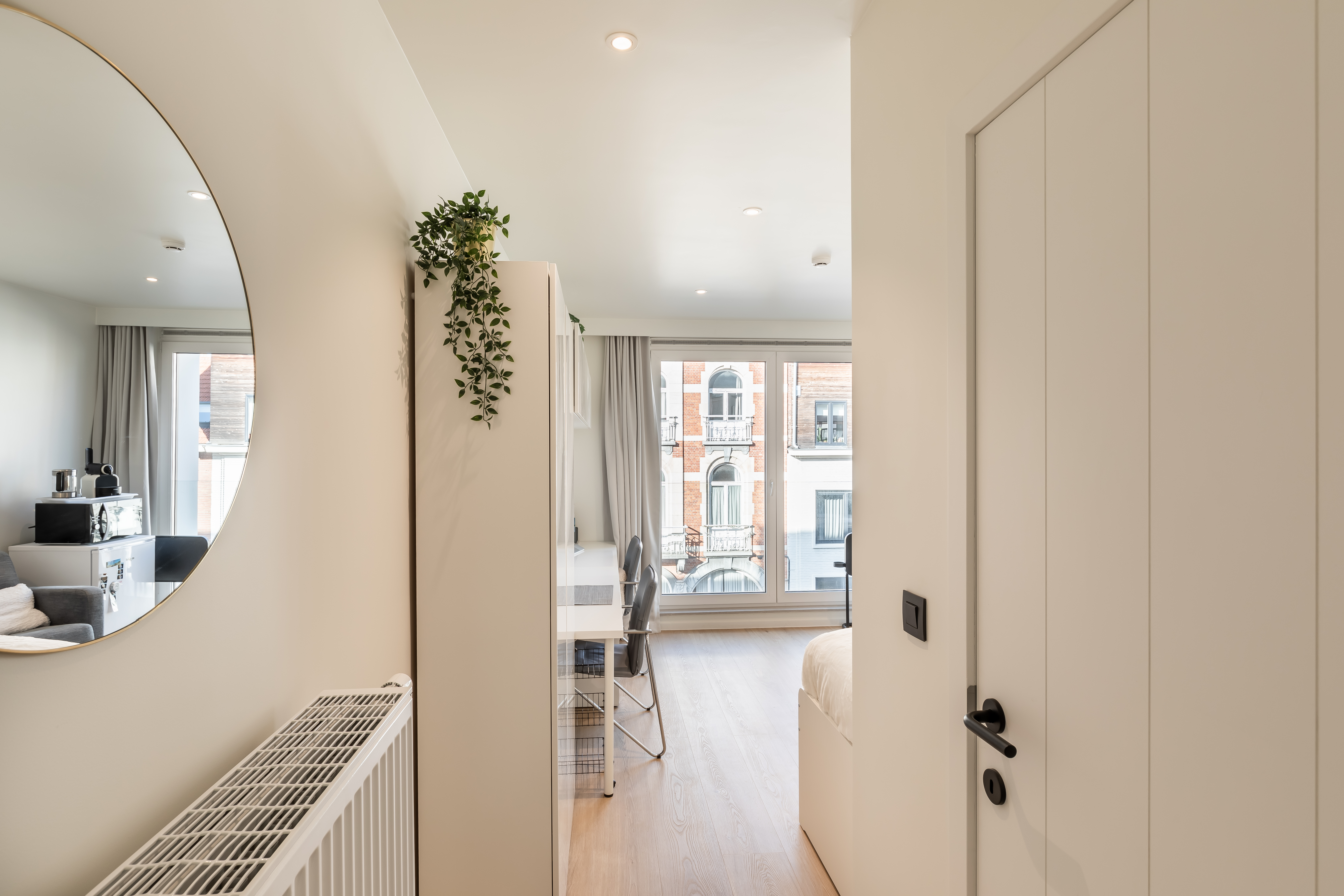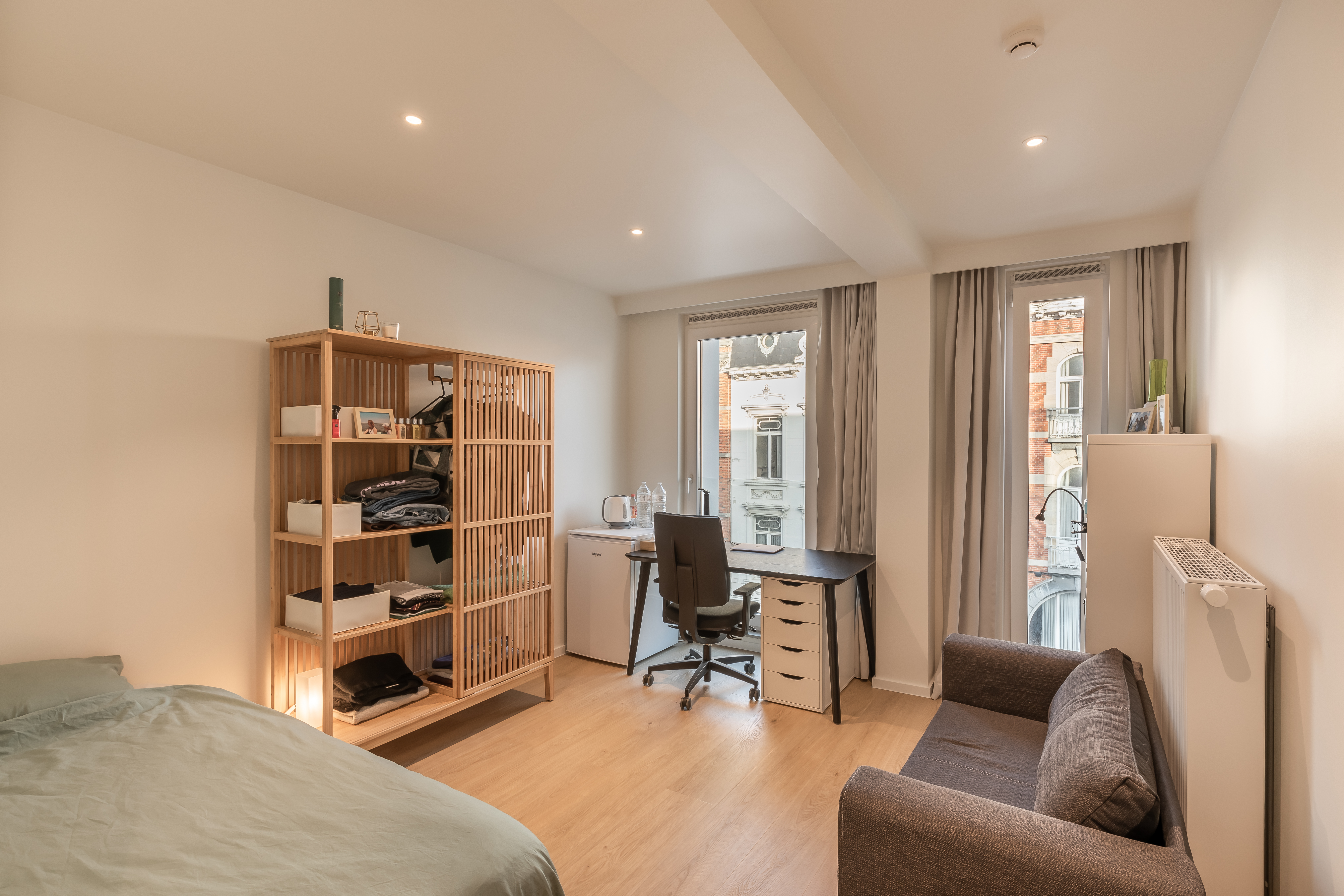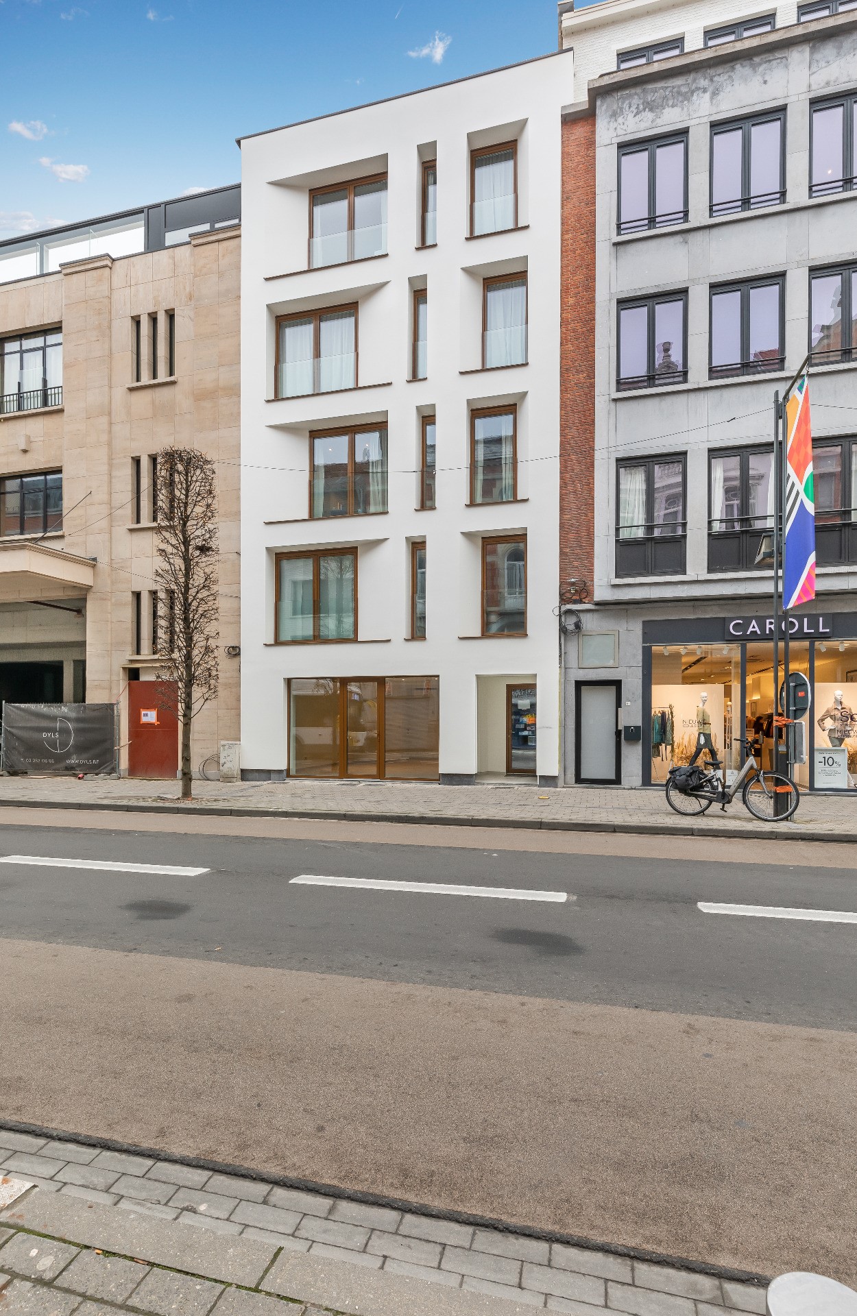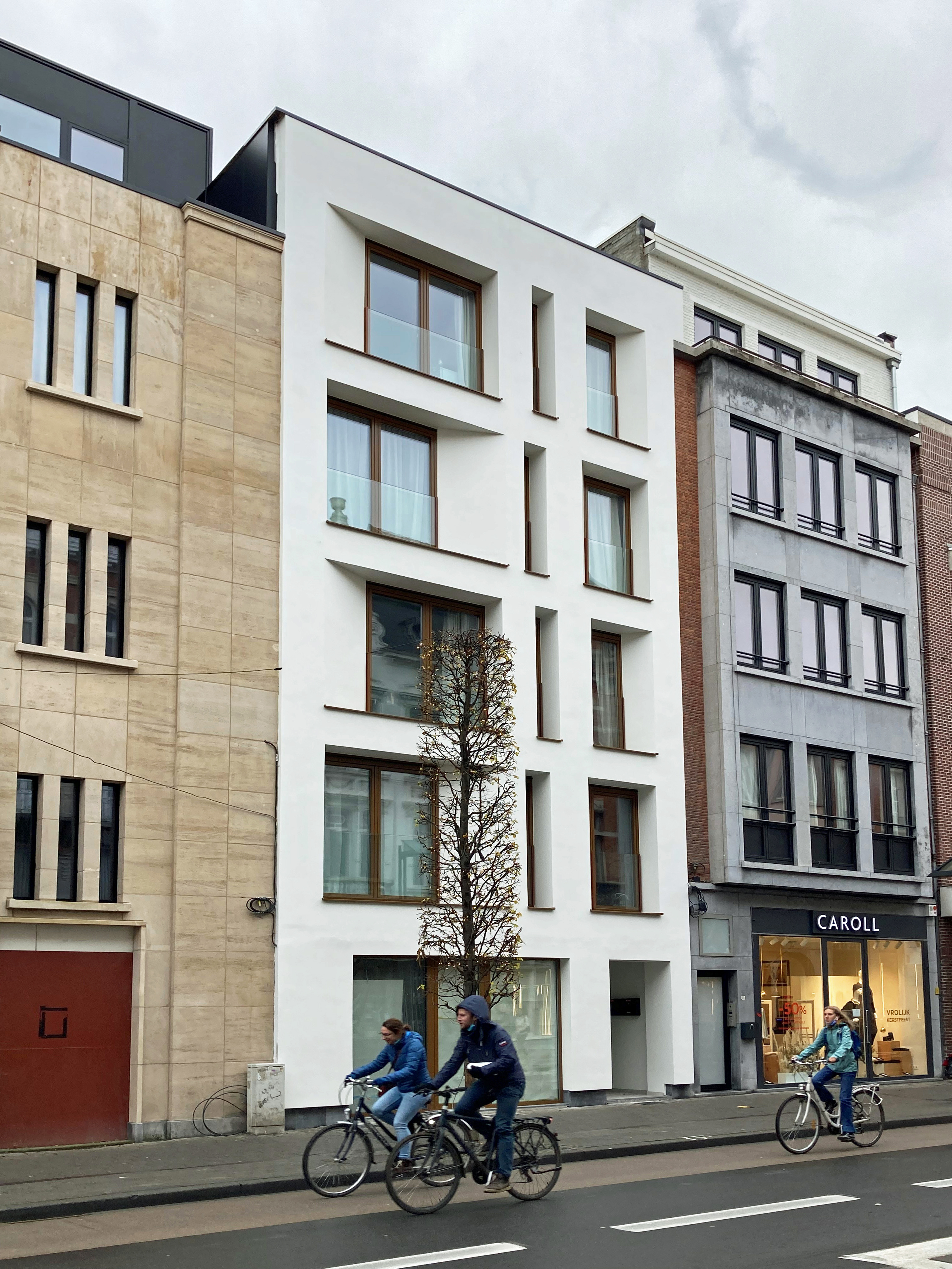 Door met dieper liggende ramen te werken en dagkanten af te schuinen, ontstaat er schaduwwerking met een speels effect. De gevel tracht zo op een discrete maar met een eigentijdse vormgeving een plaats te krijgen tussen de façades van de historiserende wederopbouwpanden.