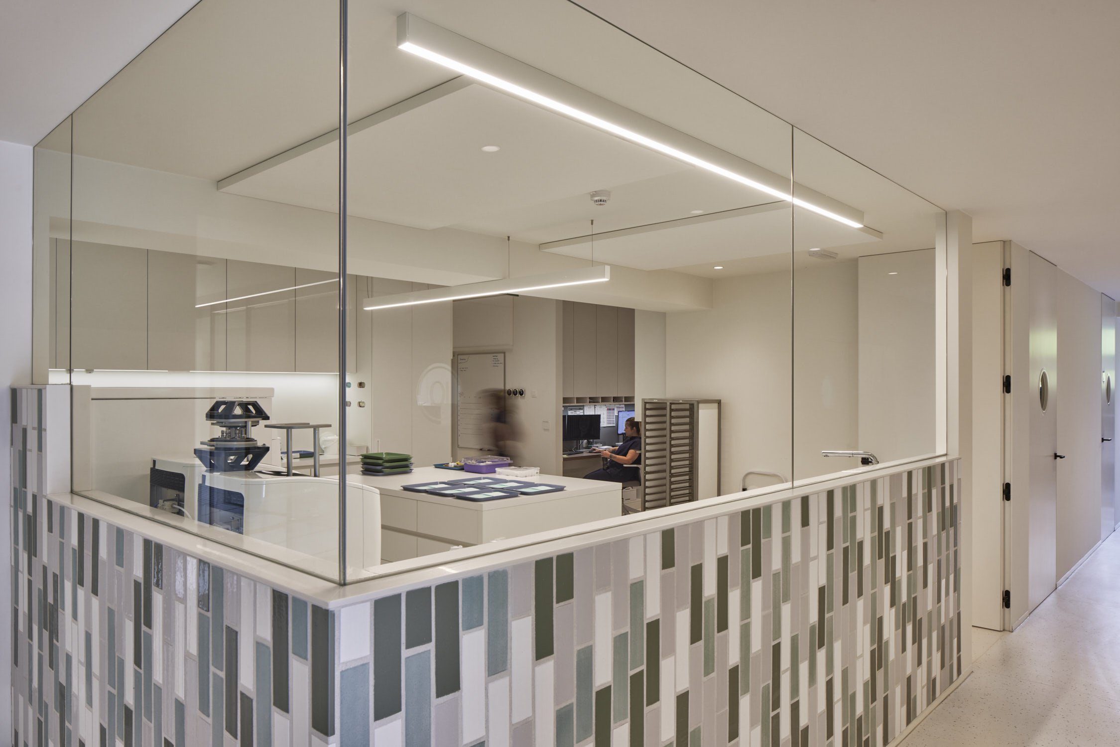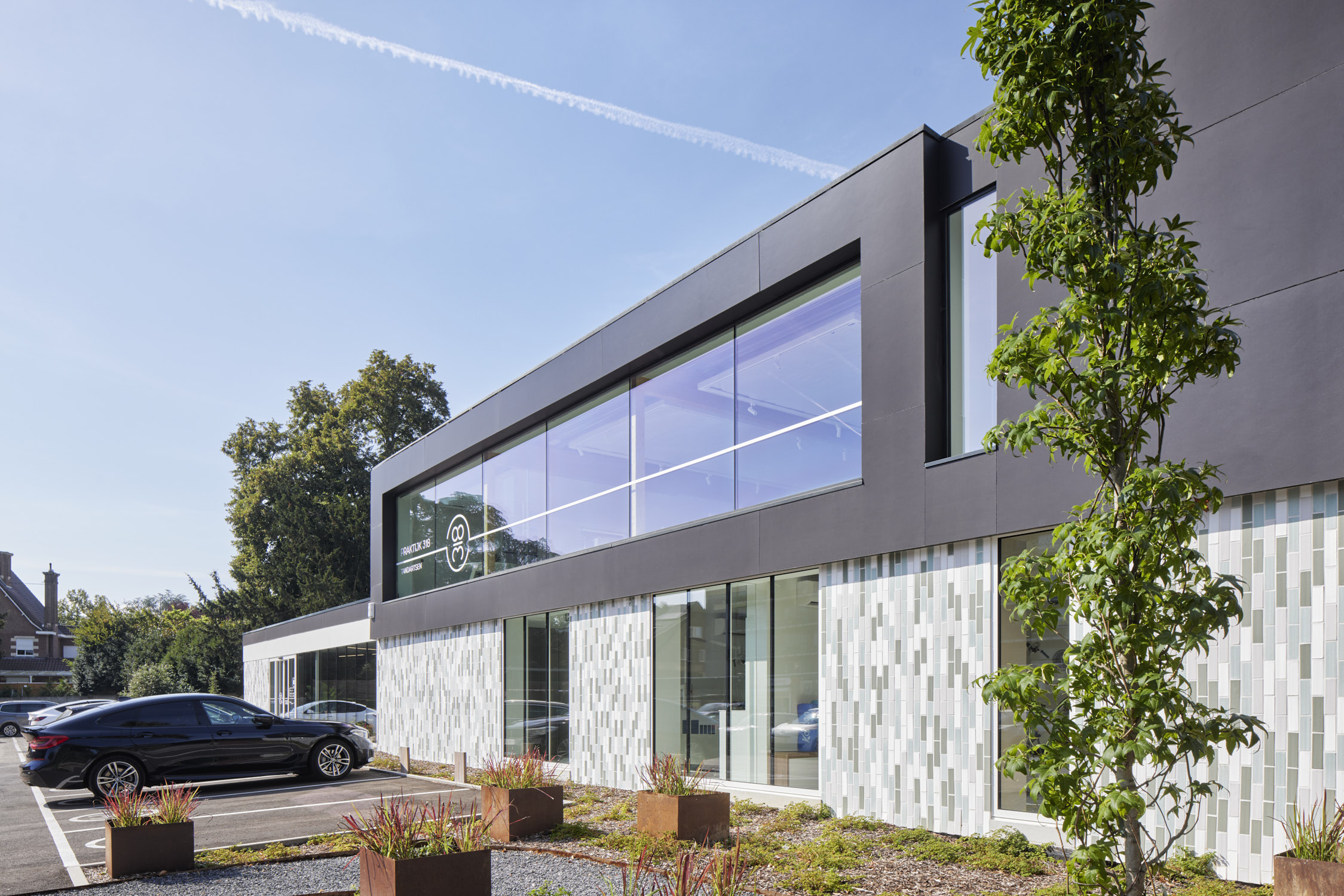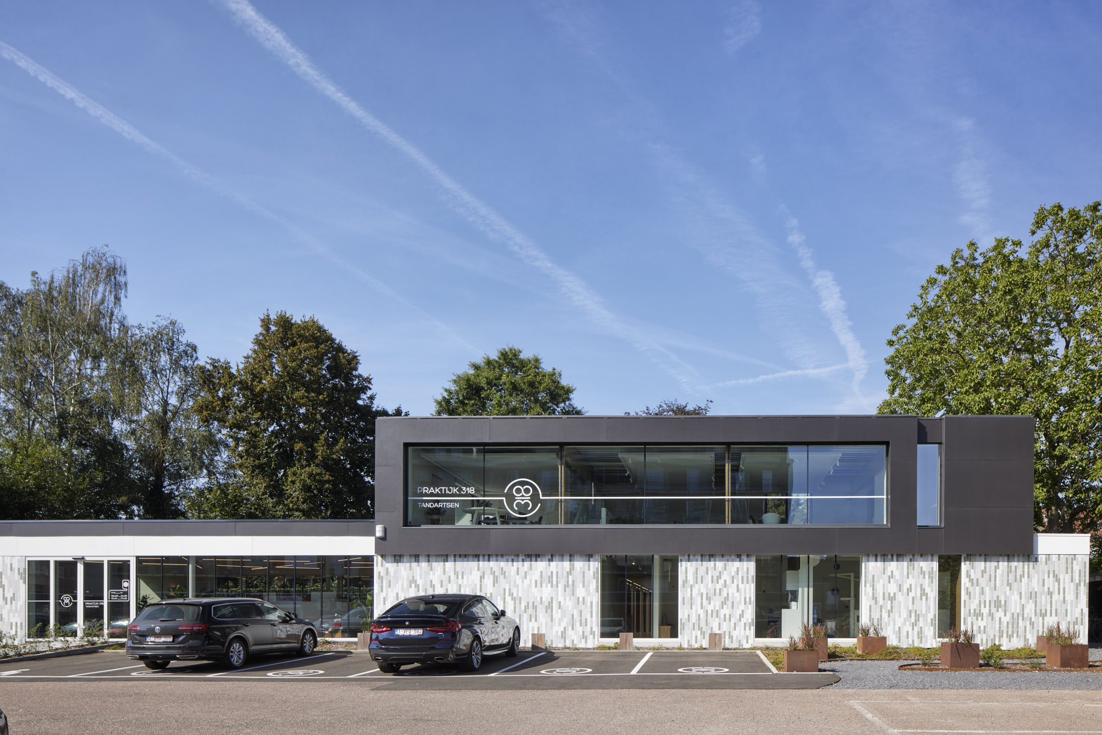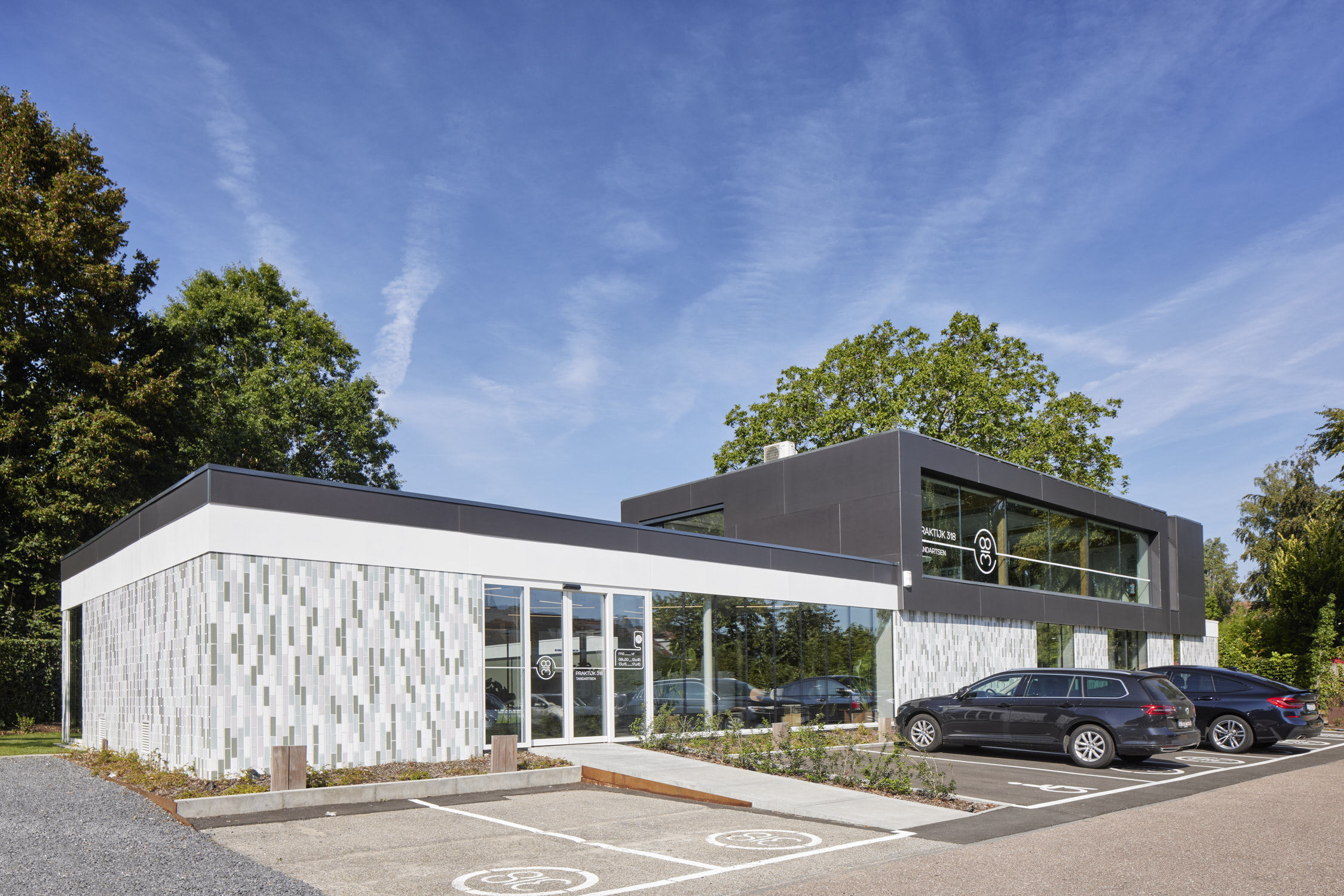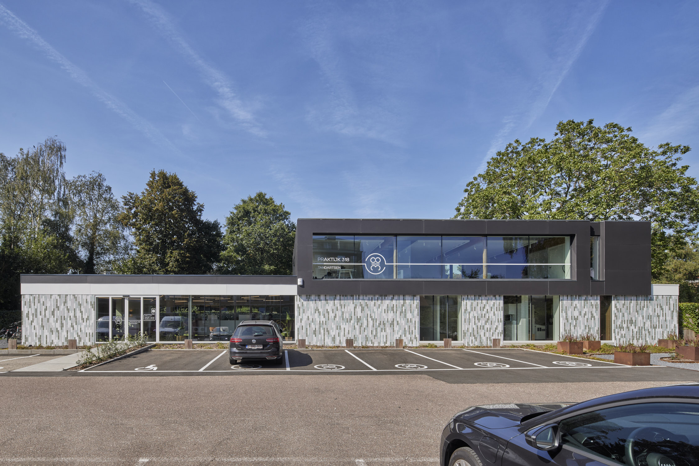 De glaspanelen hebben een vaste maat en zijn verticaal geplaatst zodat er een ritmische gevel ontstaat. De gesloten geveldelen zijn afgewerkt met verticaal geplaatste glazuurtegels in wit-grijs-groen genuanceerde tinten. De witte glazuurtegels verwijzen naar tandglazuur, de groene hebben een medische connotatie. Maar voor de geboren en getogen Leuvenaars zullen de tegels het beeld van het oude zwembad oproepen, dat overigens nog steeds onder de kabinetten ligt.