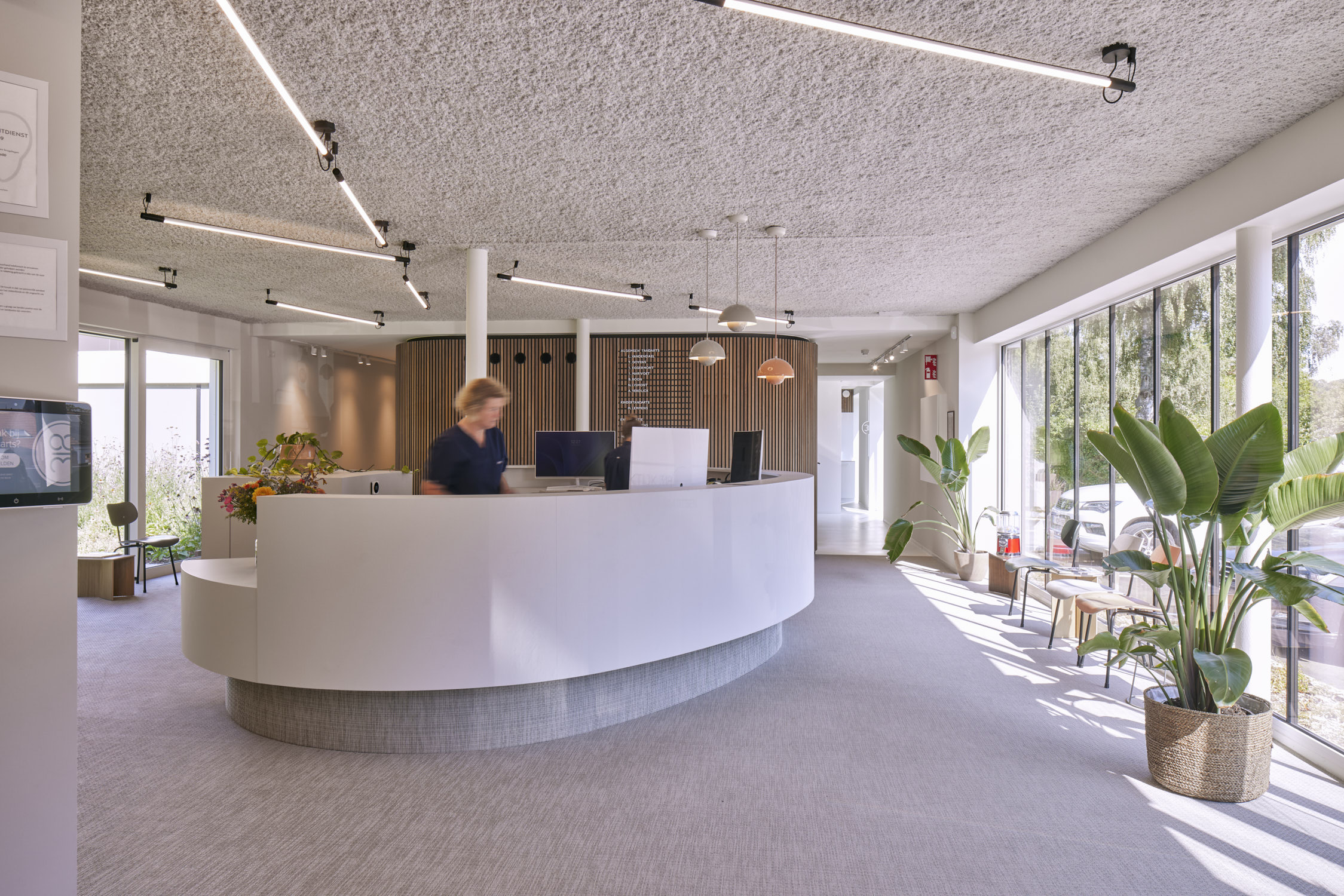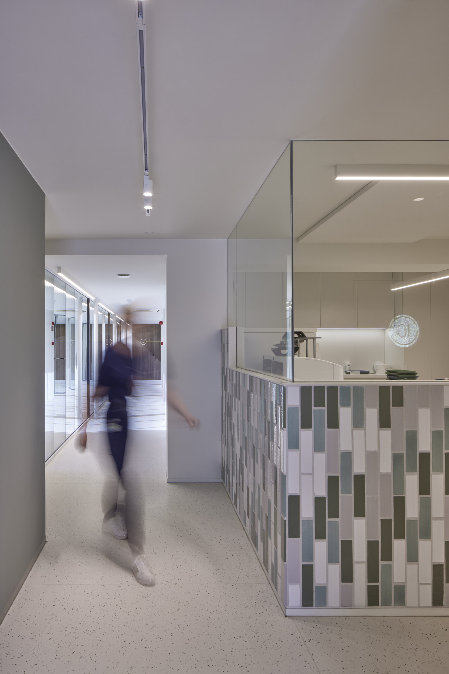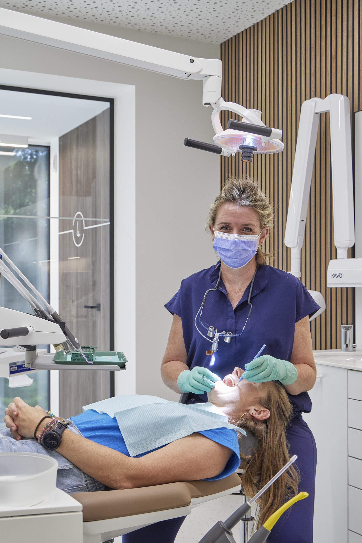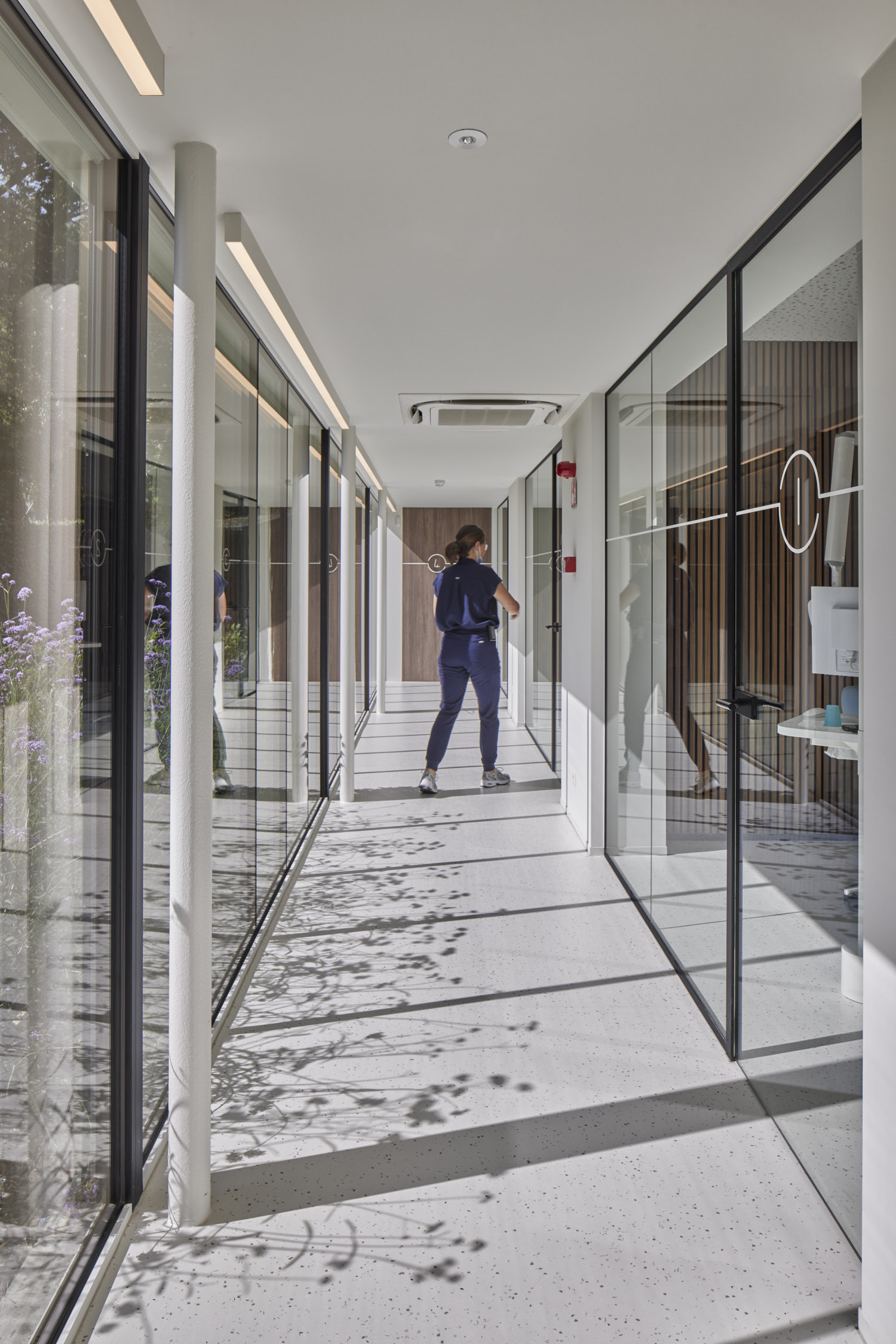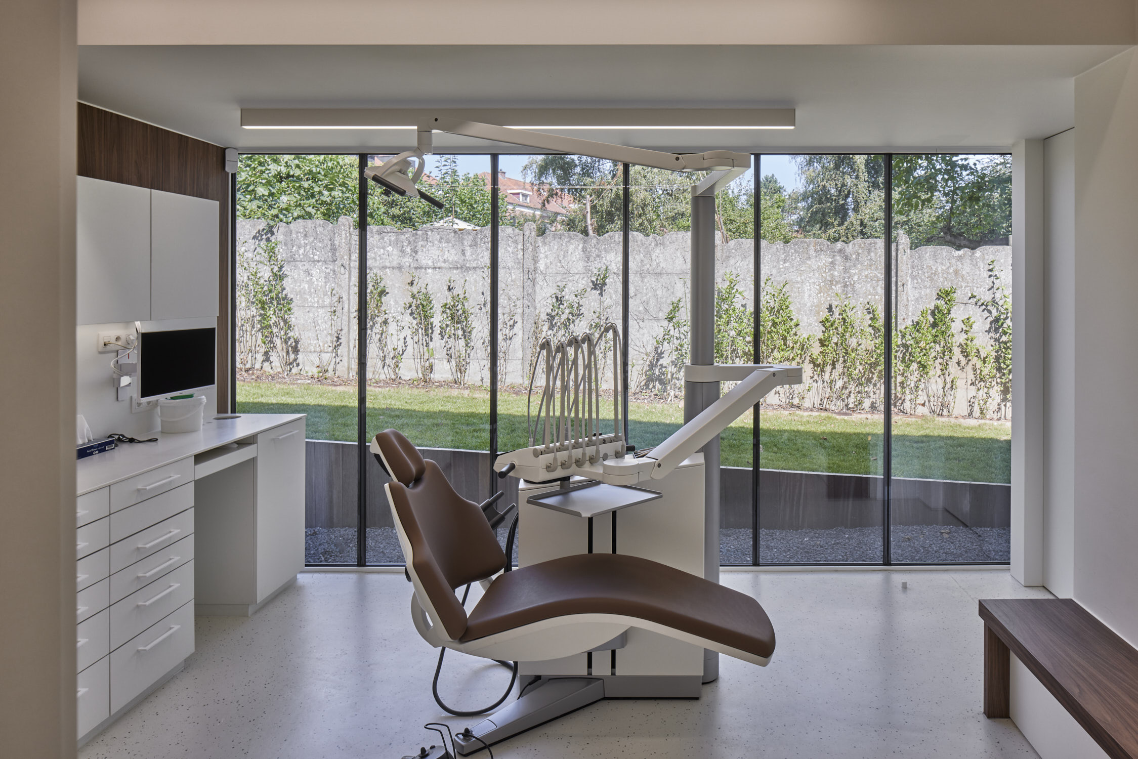 De glaspanelen hebben een vaste maat en zijn verticaal geplaatst zodat er een ritmische gevel ontstaat. De gesloten geveldelen zijn afgewerkt met verticaal geplaatste glazuurtegels in wit-grijs-groen genuanceerde tinten. De witte glazuurtegels verwijzen naar tandglazuur, de groene hebben een medische connotatie. Maar voor de geboren en getogen Leuvenaars zullen de tegels het beeld van het oude zwembad oproepen, dat overigens nog steeds onder de kabinetten ligt.