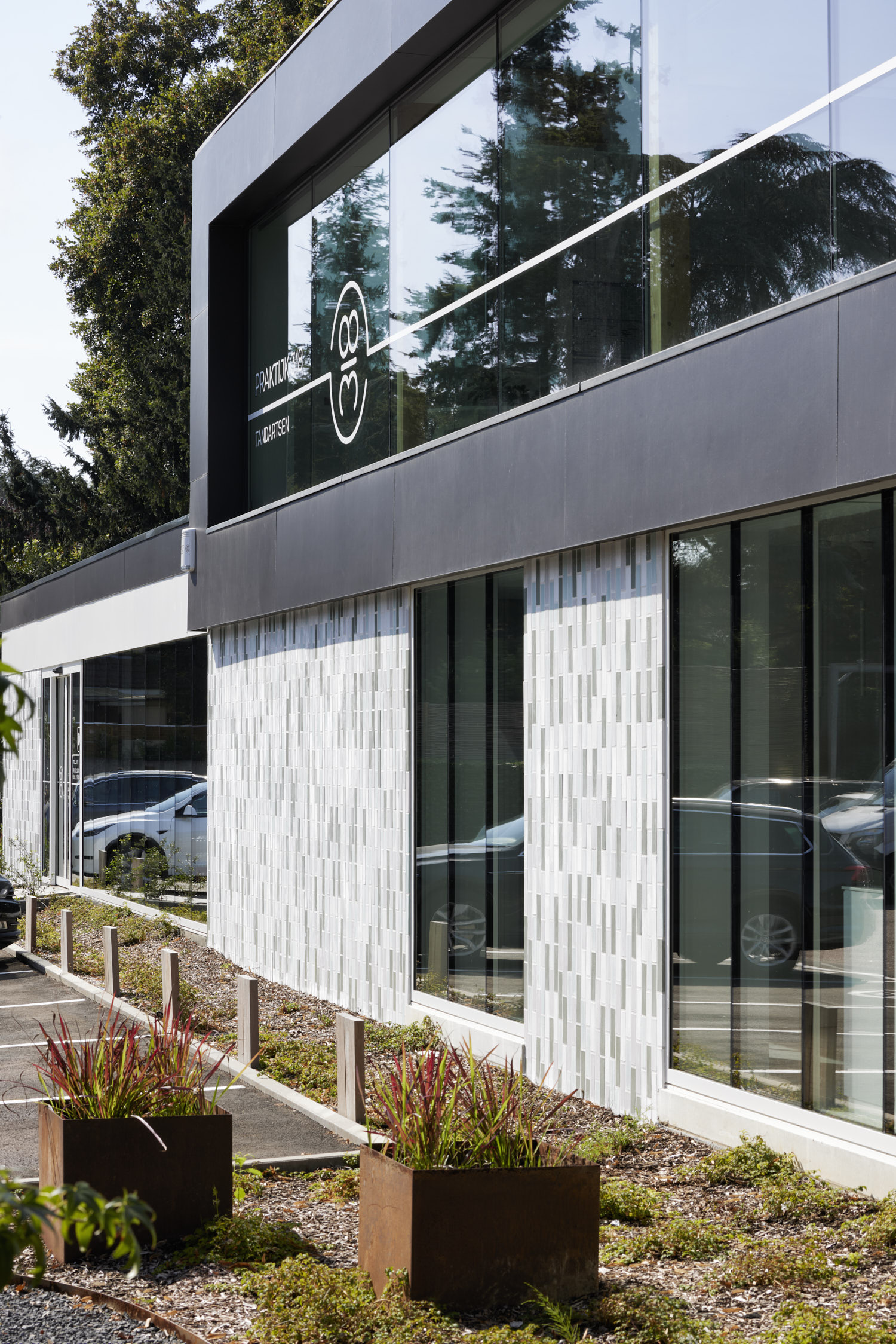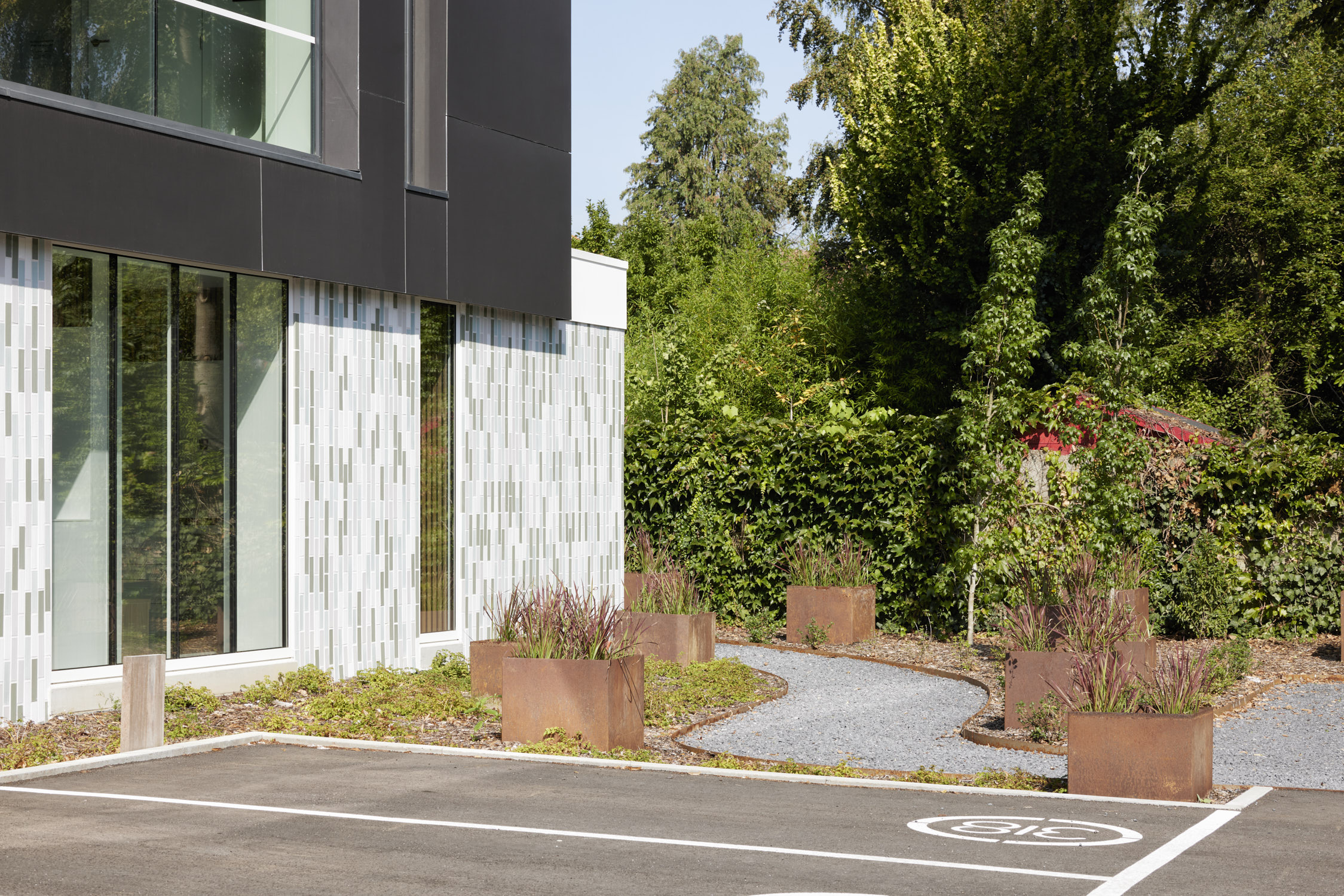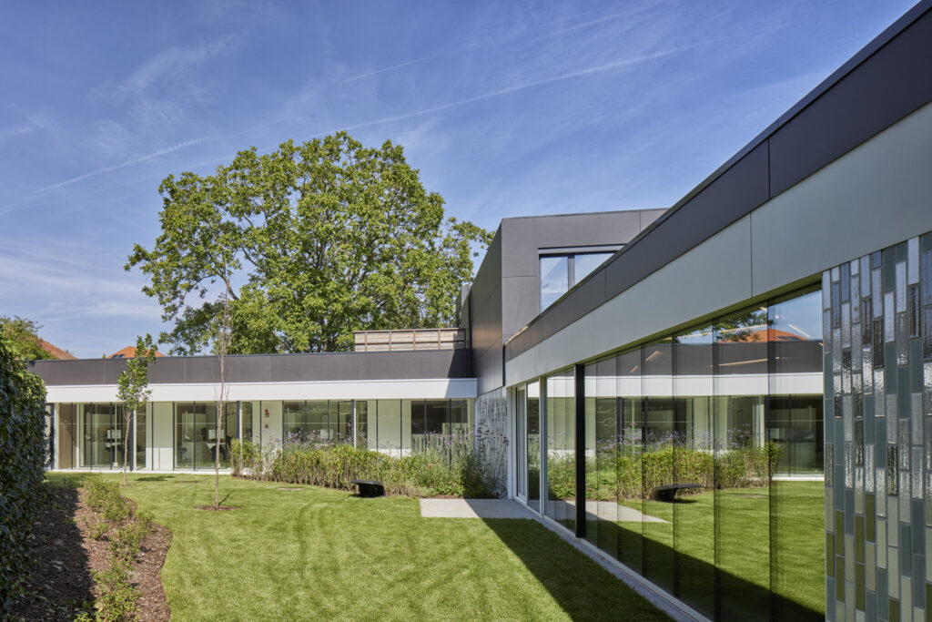 Het beperken van de gevelmaterialen tot glas en glazuurtegels, zorgt voor een rustig maar krachtig beeld. De band van glazuur en glas die als een vlies rond de bebouwing ligt, reflecteert het aangelegde omliggende groen.