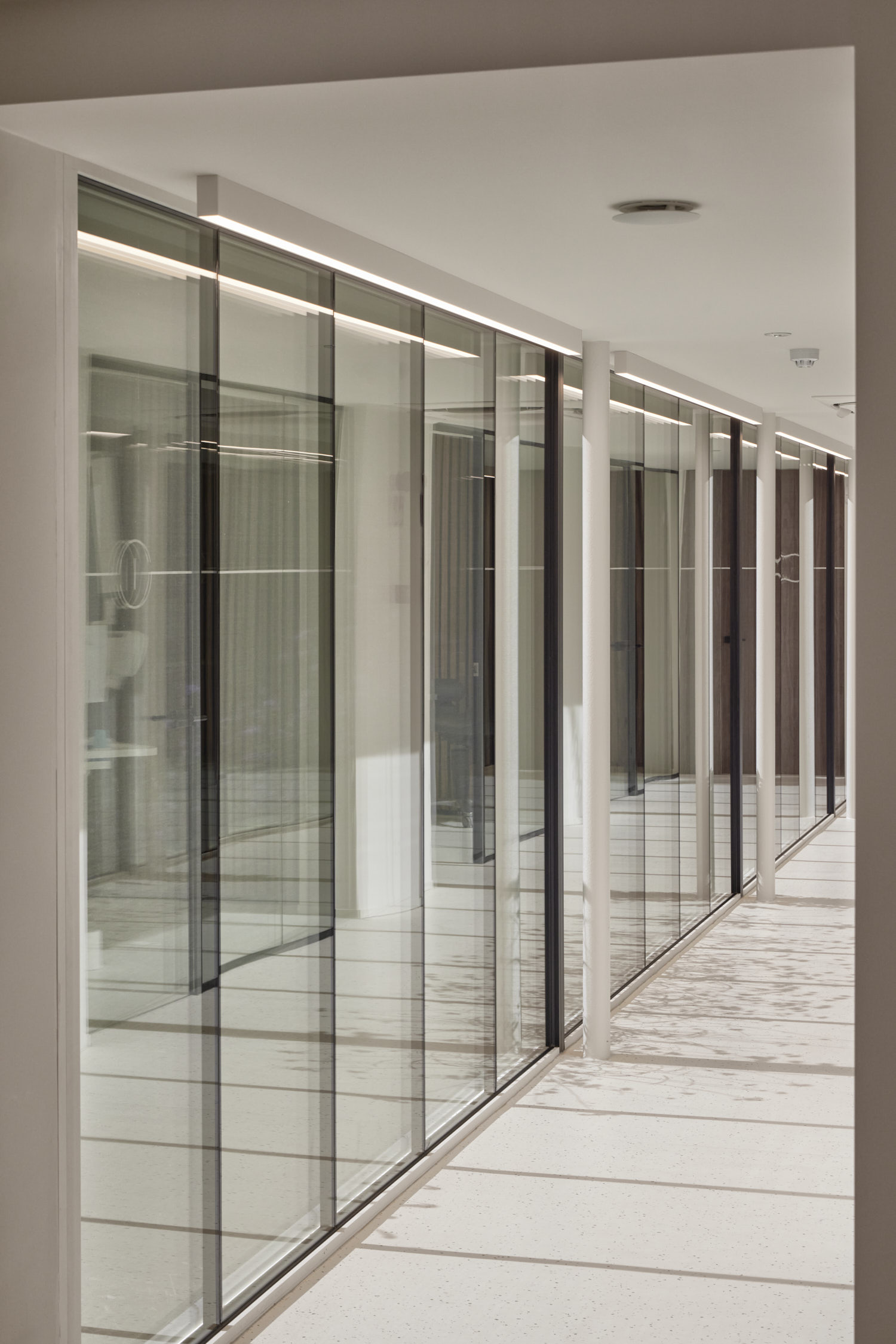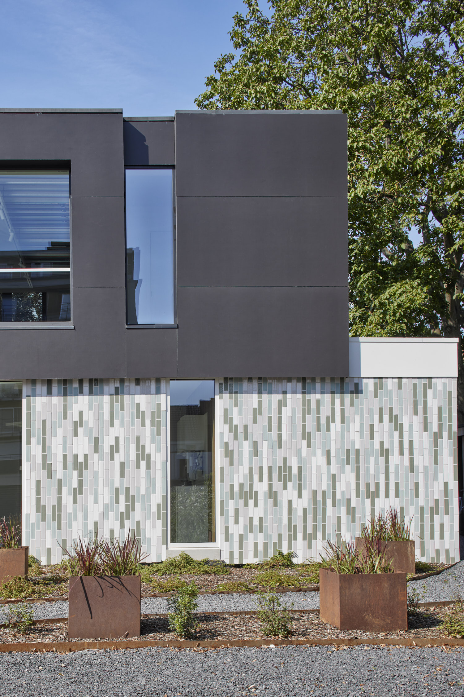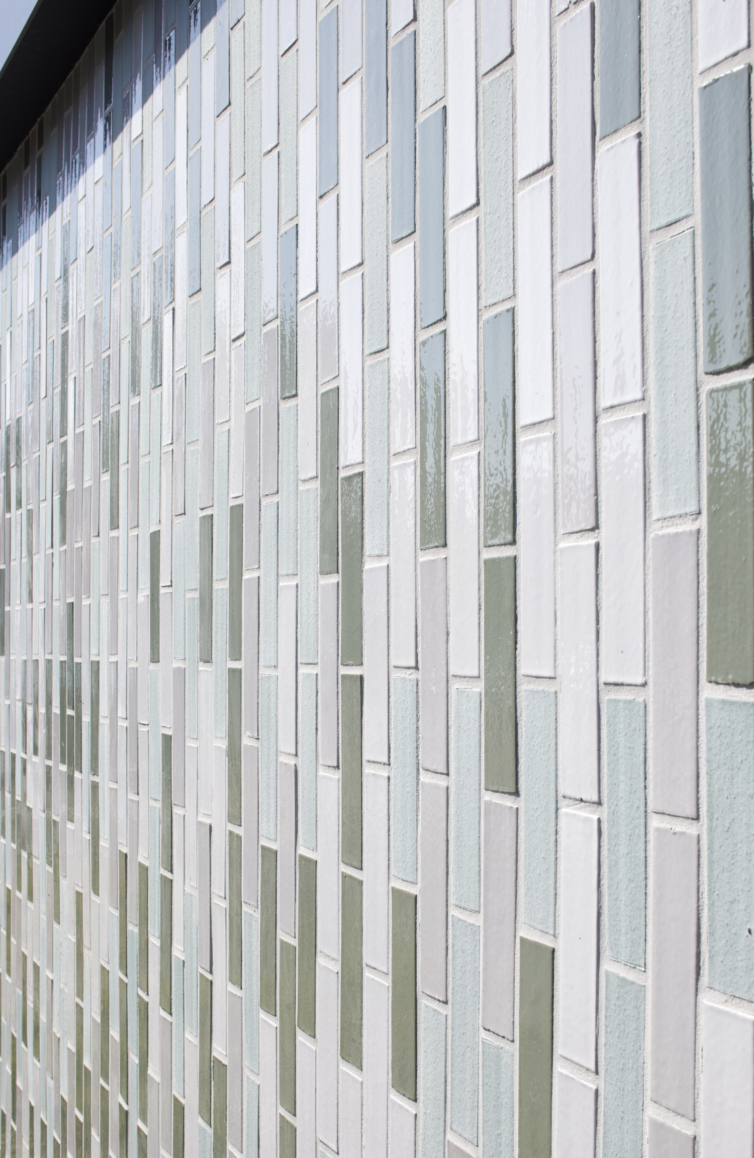 Het beperken van de gevelmaterialen tot glas en glazuurtegels, zorgt voor een rustig maar krachtig beeld. De band van glazuur en glas die als een vlies rond de bebouwing ligt, reflecteert het aangelegde omliggende groen.