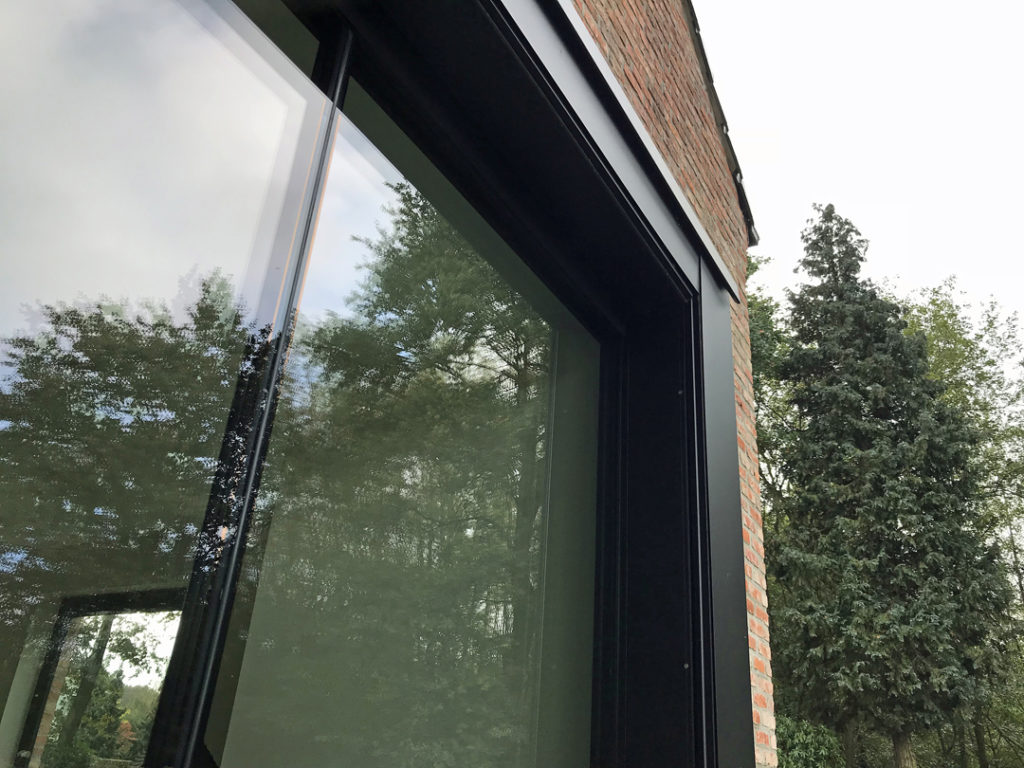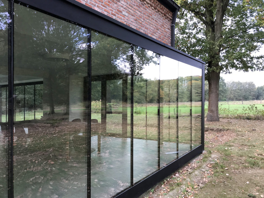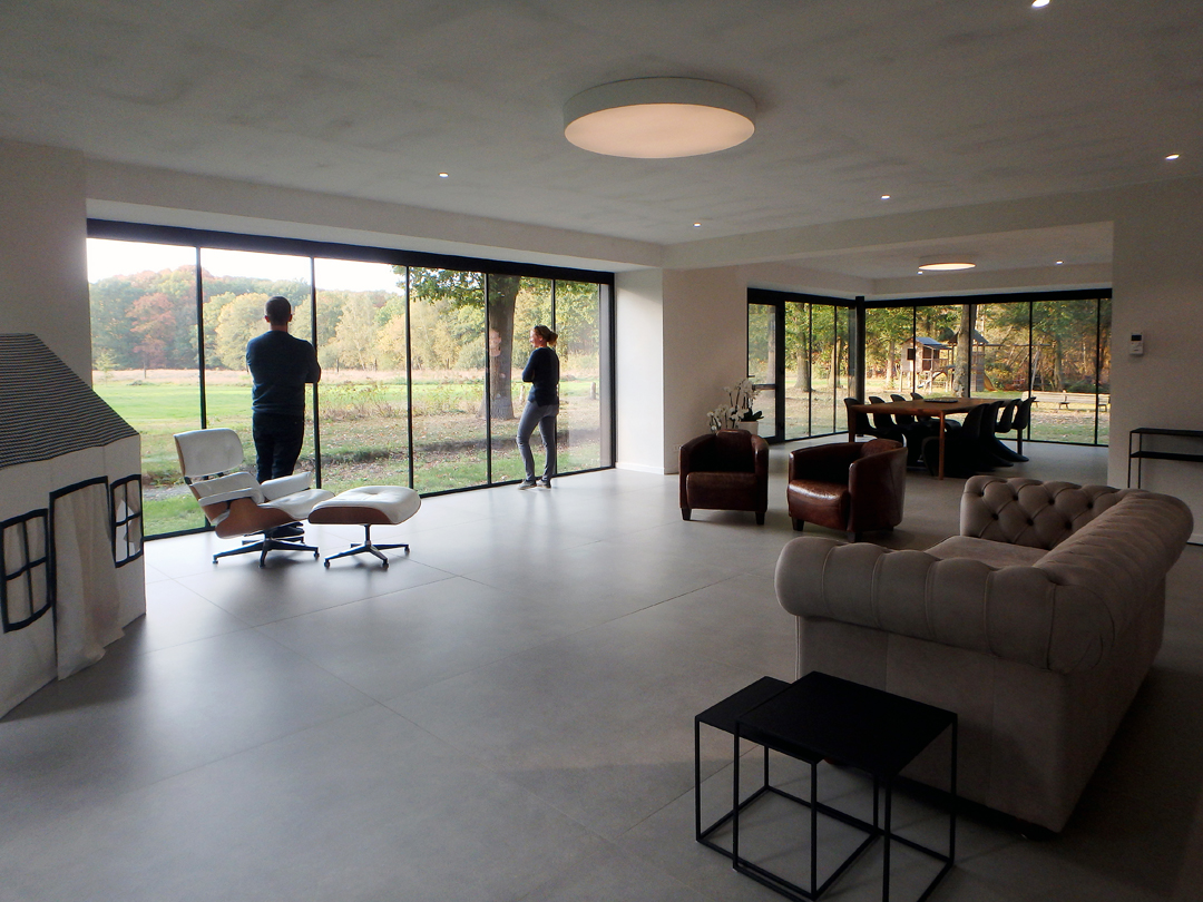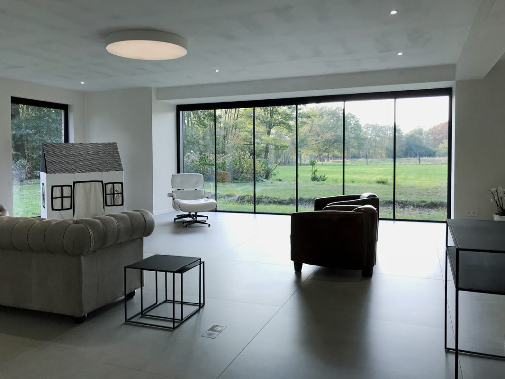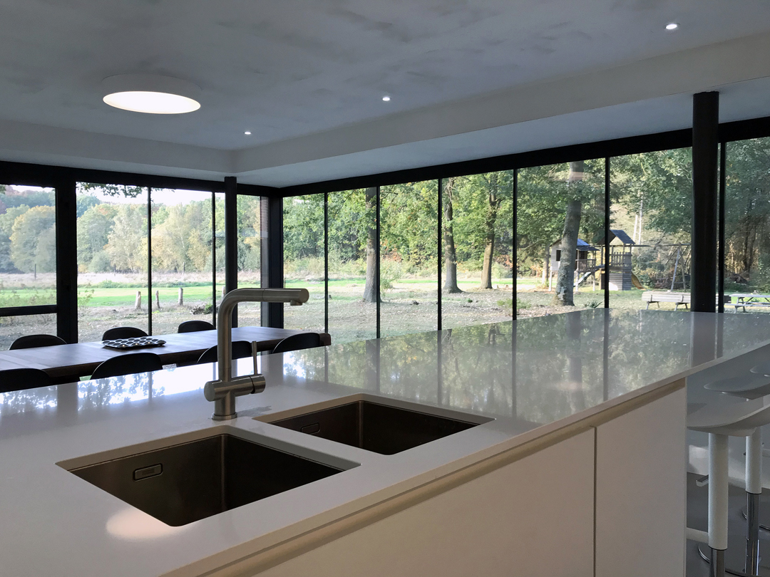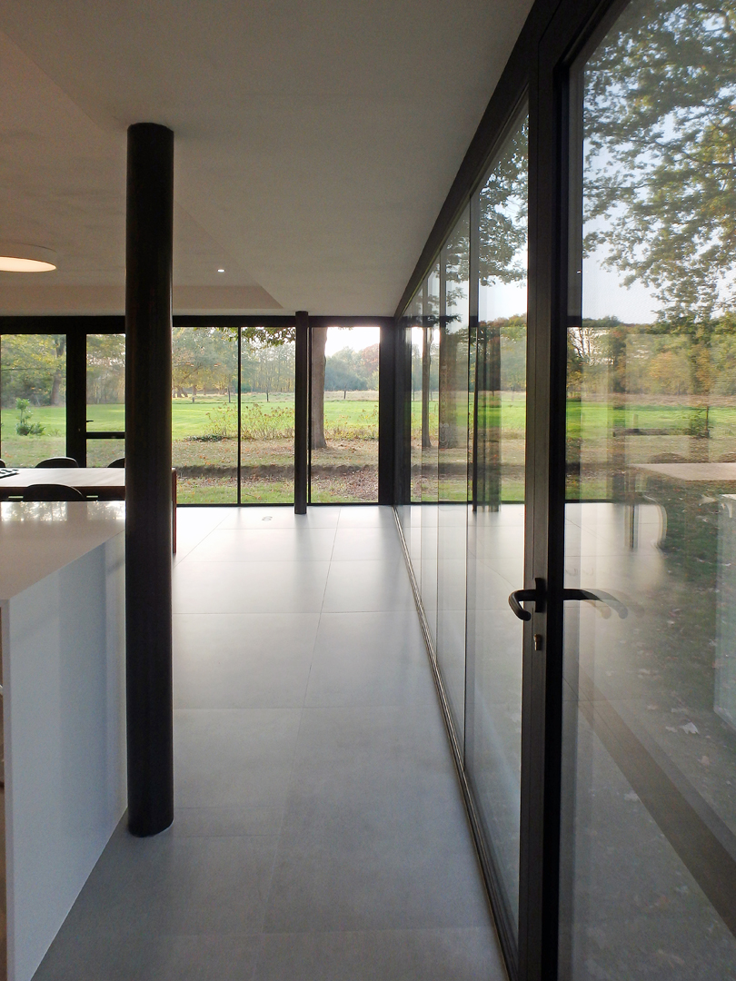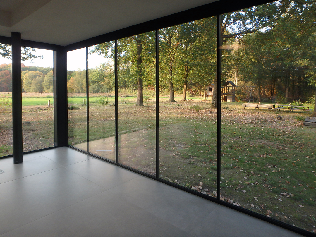 Door binnenmuren te slopen en de gevel open te breken ontstaat er een uniek zicht op het omliggende groen.