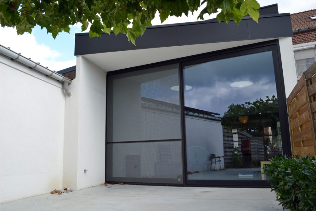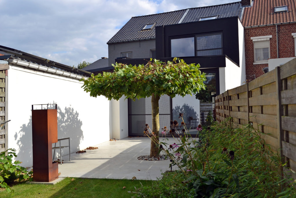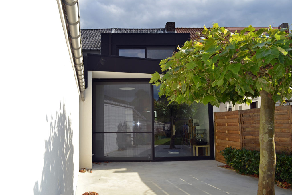 Verbouwen en uitbreiden van een rijwoning. De aanbouwen werden weggesneden. Een nieuwe uitbouw over 2 verdiepingen brengt ruimte en licht in de woning.