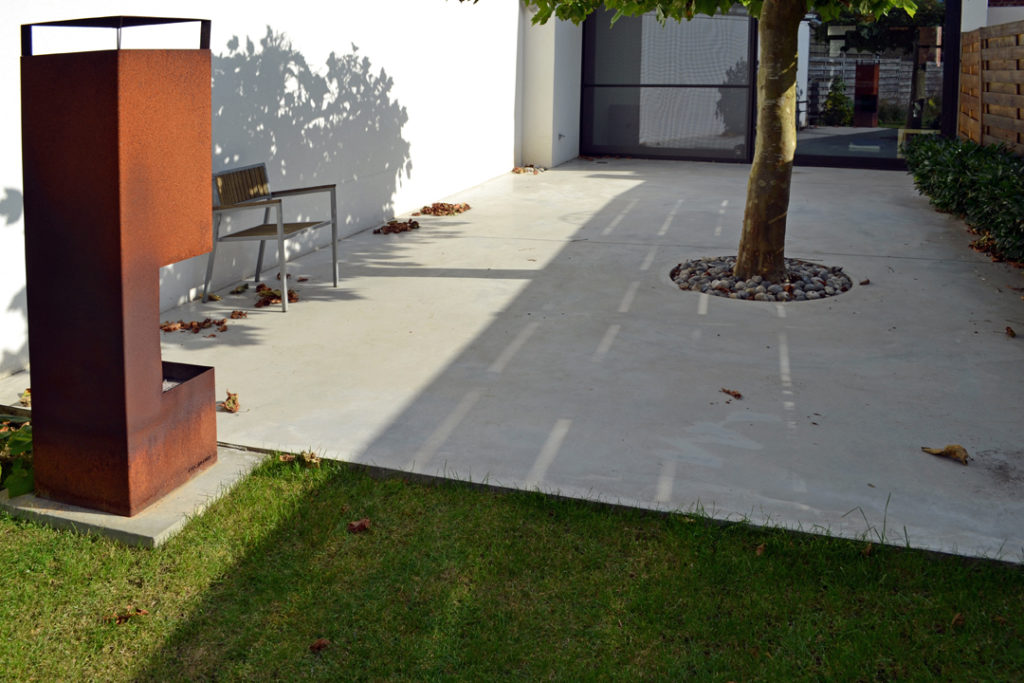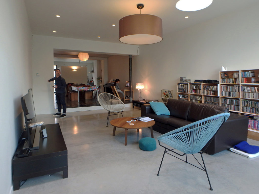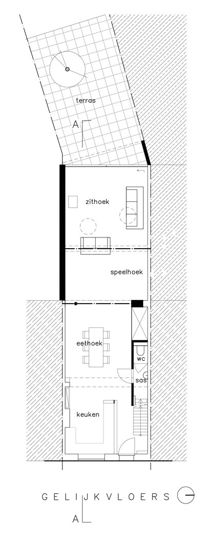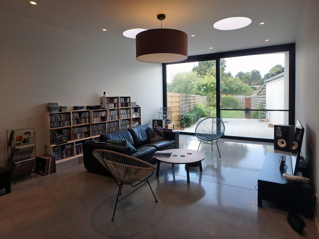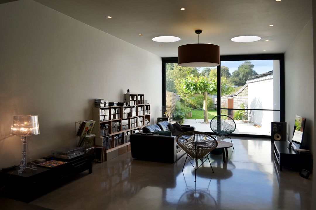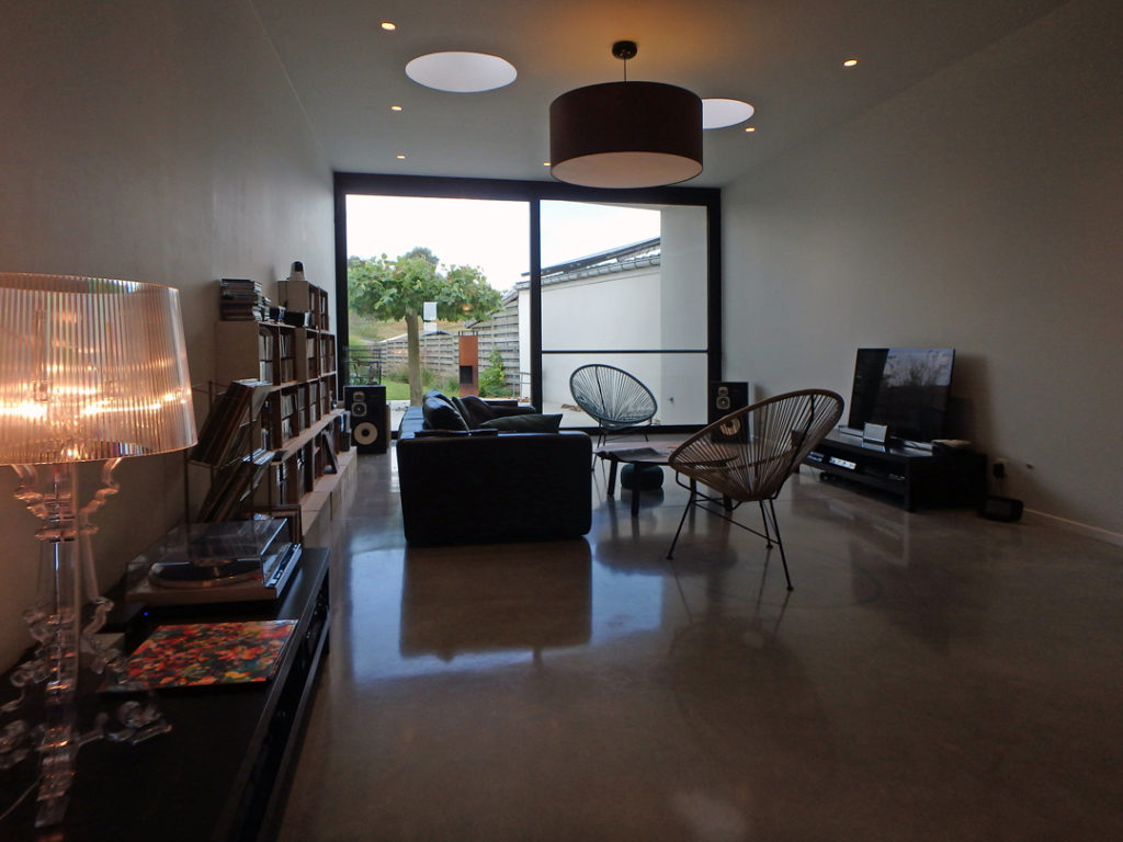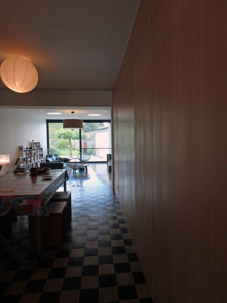 Bergingen, technieken, wc en toegang naar de kelder zijn weggewerkt in een kastenwand in grijze olm. Een gepolierde betonvloer verbindt interieur met exterieur. Het schuifraam is naar binnen geplaatst en creĆ«ert zo een overdekte ’tussenruimte’, een overgang tussen leefruimte en tuin.