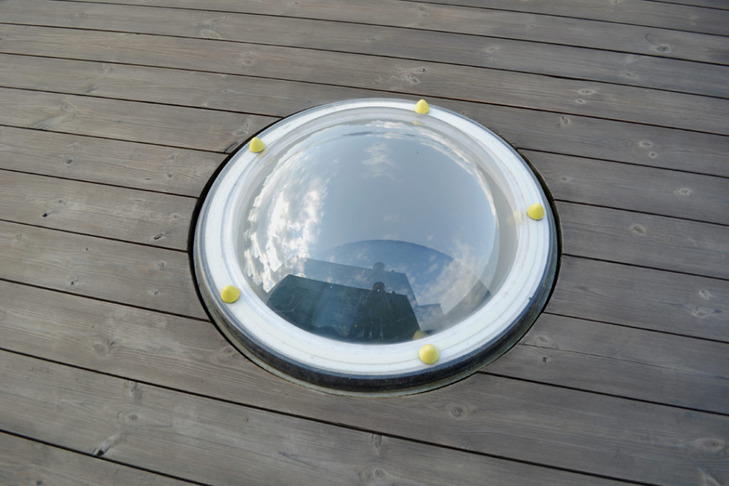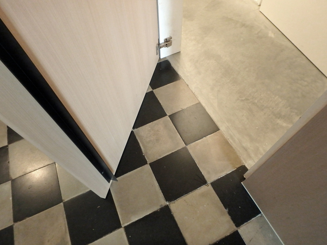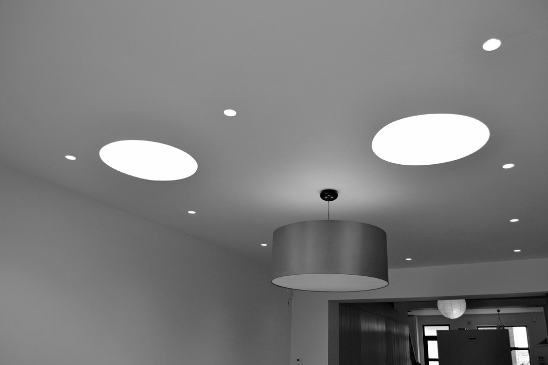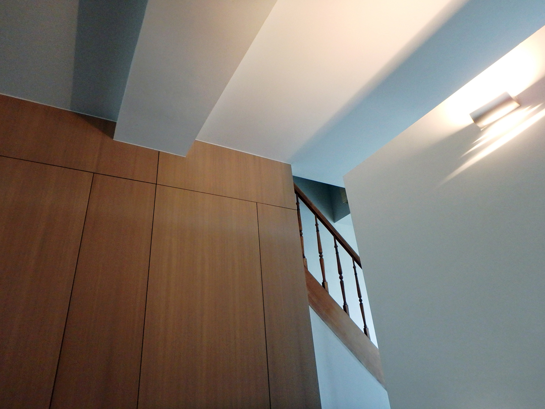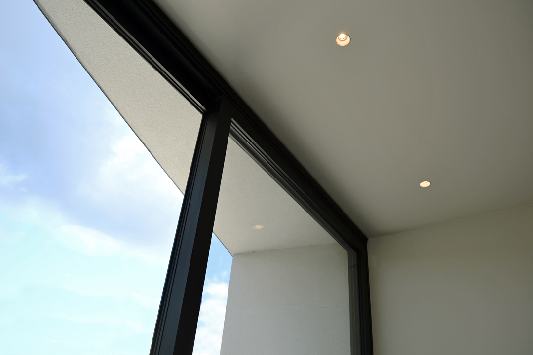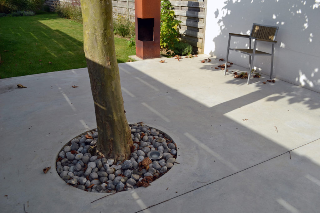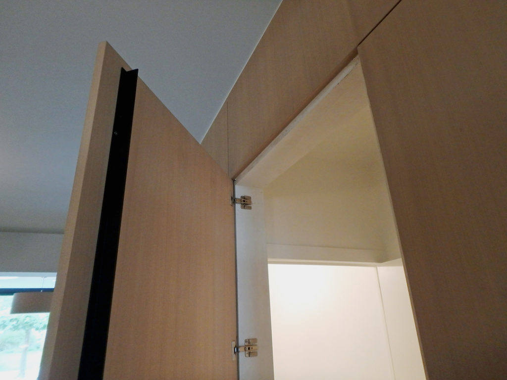 Bergingen, technieken, wc en toegang naar de kelder zijn weggewerkt in een kastenwand in grijze olm. Een gepolierde betonvloer verbindt interieur met exterieur. Het schuifraam is naar binnen geplaatst en creĆ«ert zo een overdekte ’tussenruimte’, een overgang tussen leefruimte en tuin.