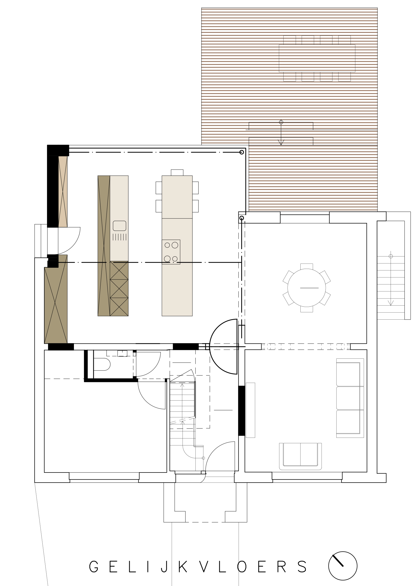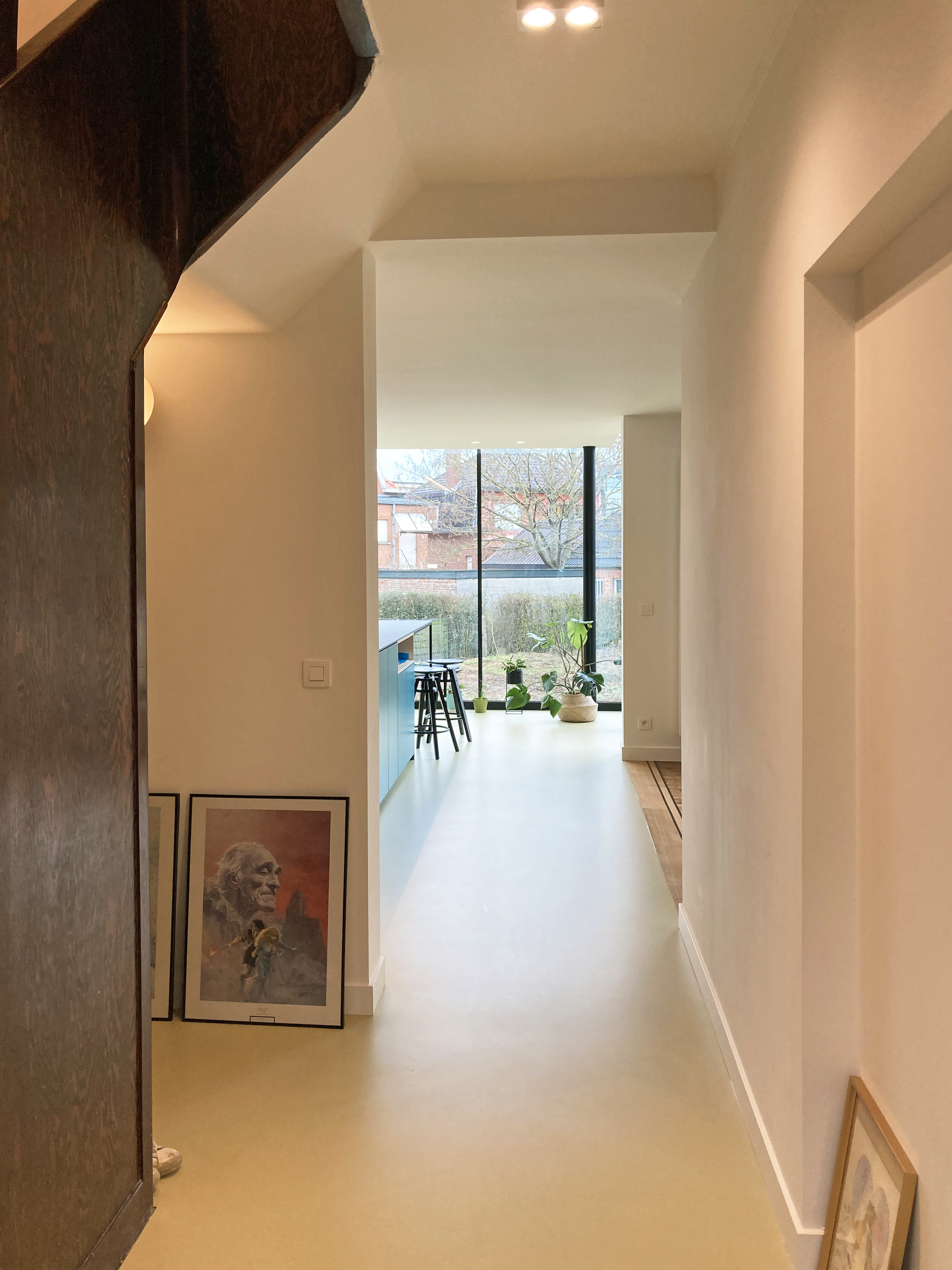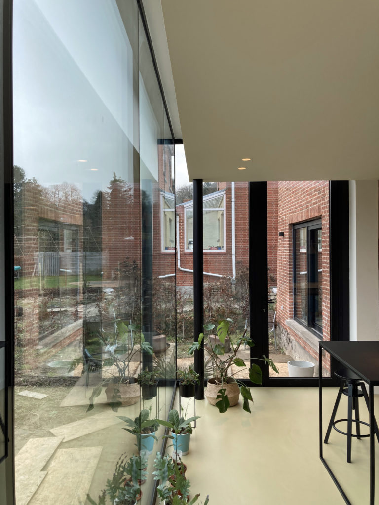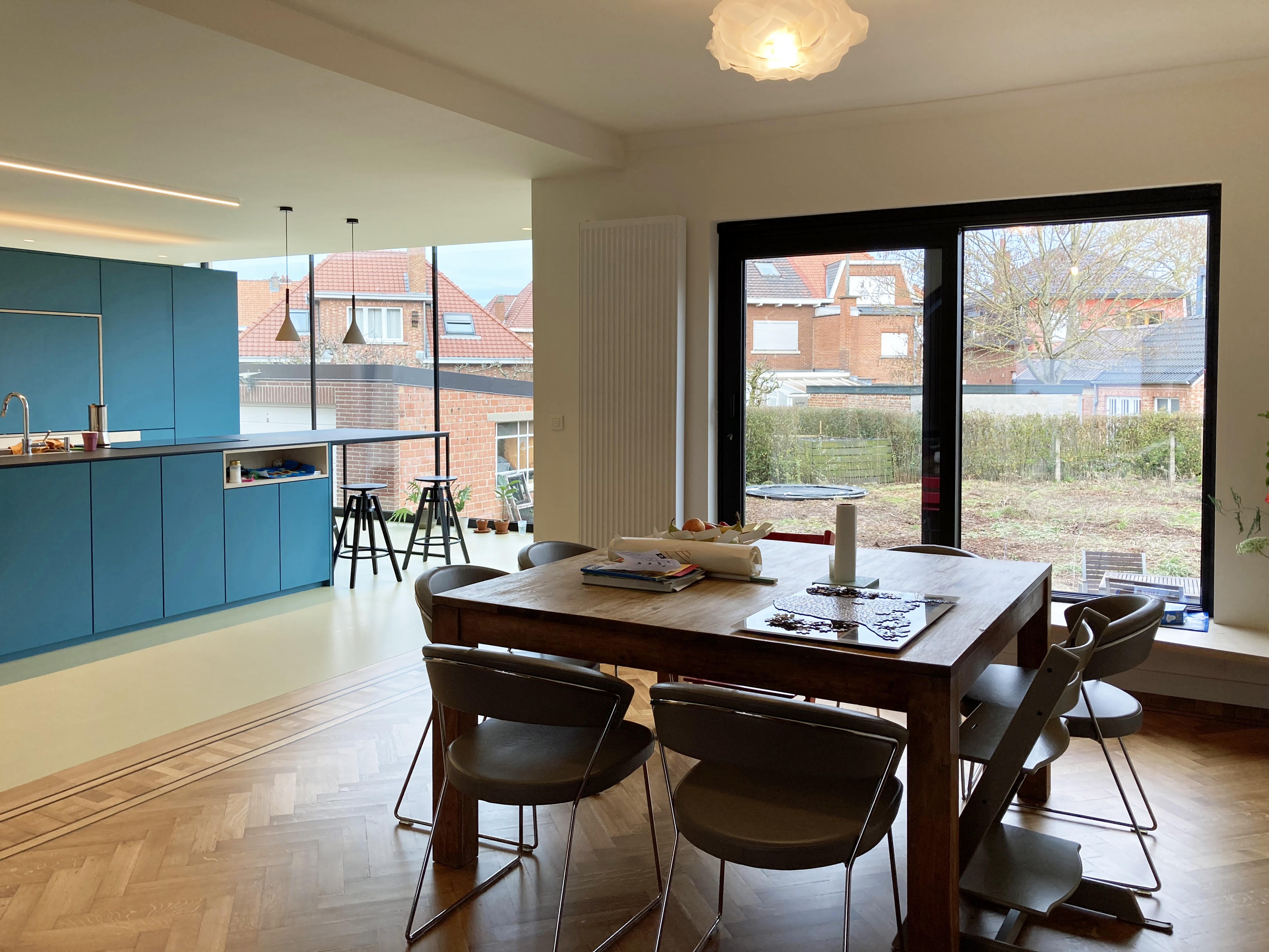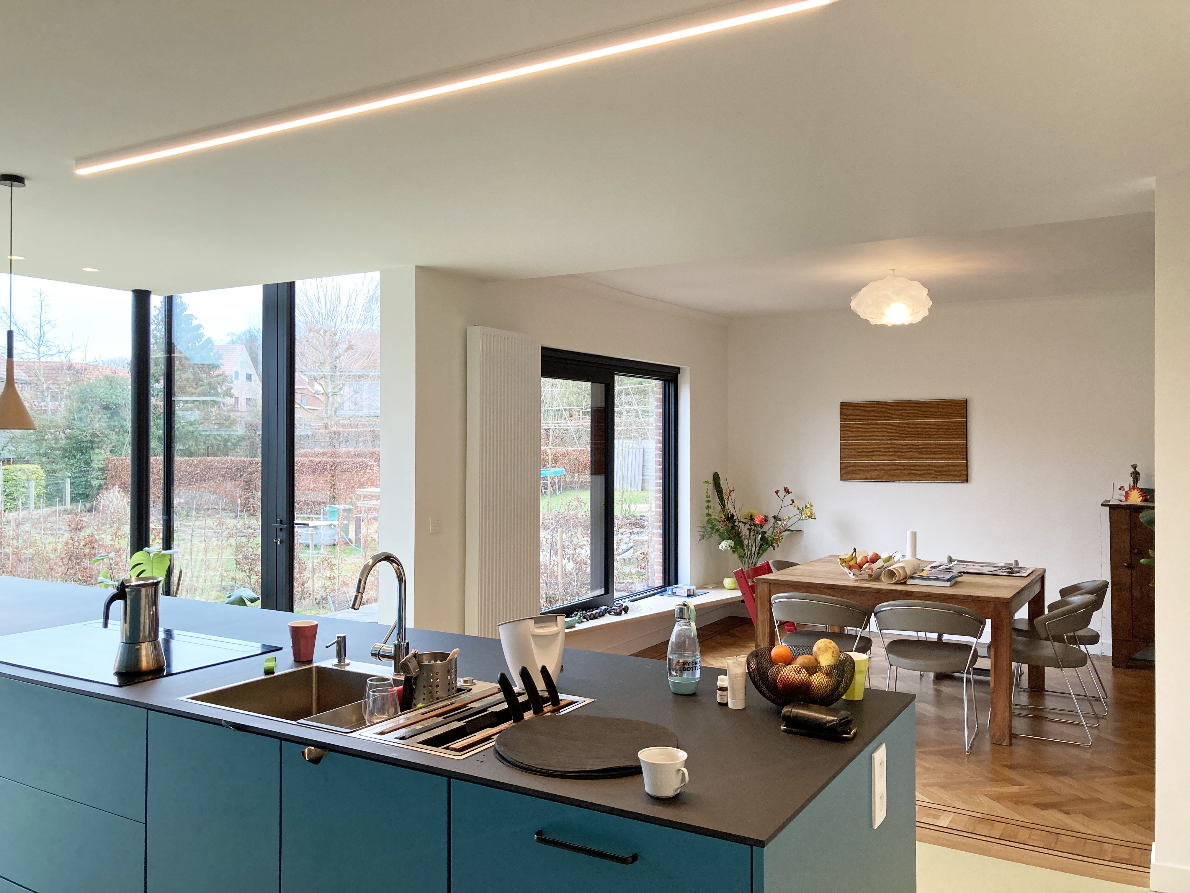 De wc en keldertrap zijn weggebroken om een centrale as te bekomen in het verlengde van de voordeur. Een kleine maar brede en volledig beglaasde uitbouw brengt licht, groen en ruimte in de nieuwe leefkeuken. Heel wat binnenmuren gaan er aan zodat keuken en ‘salon’ één vormen. De grote L-vormige woonruimte verenigt oud en nieuw, donker en licht, stemmig hout en gewaagd kleurrijk met het groen van de tuin als verbindend element.