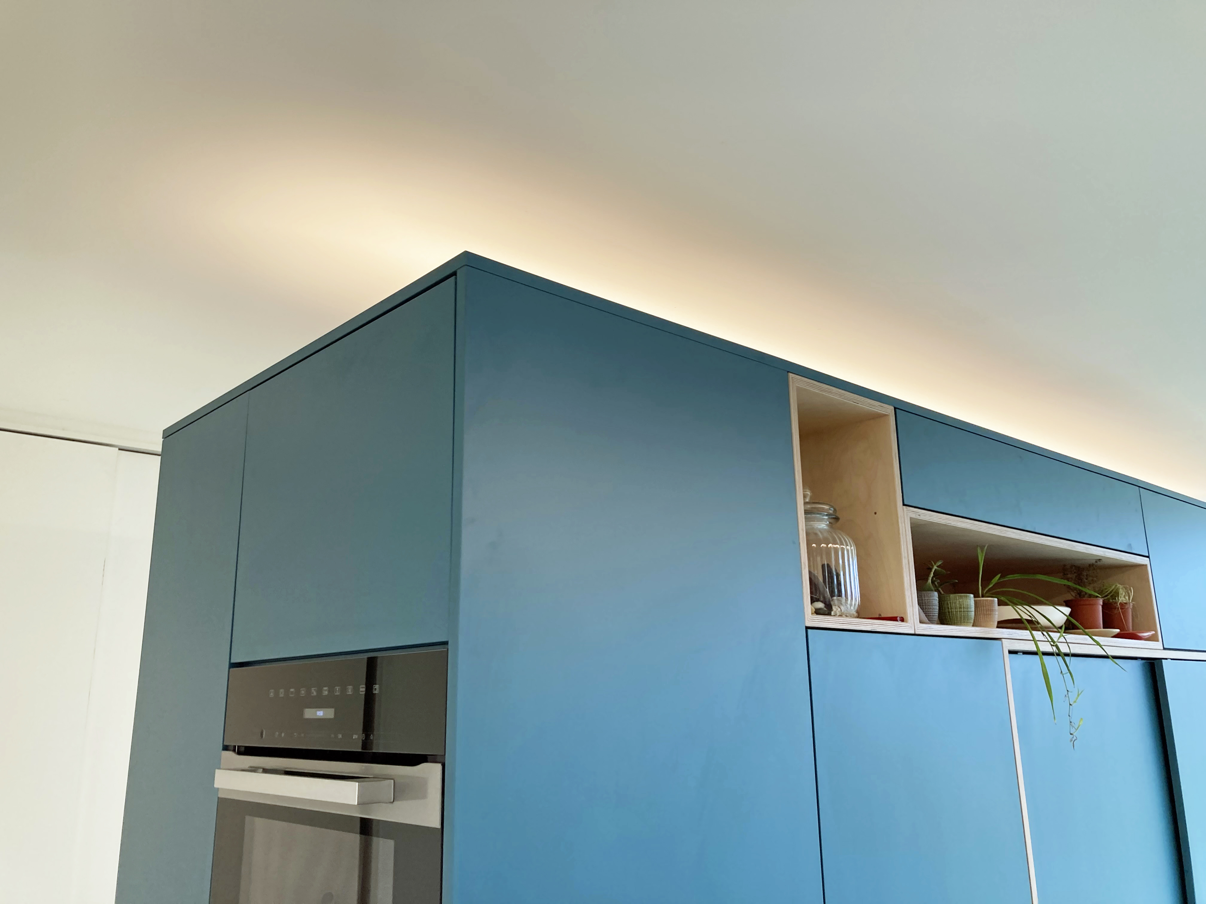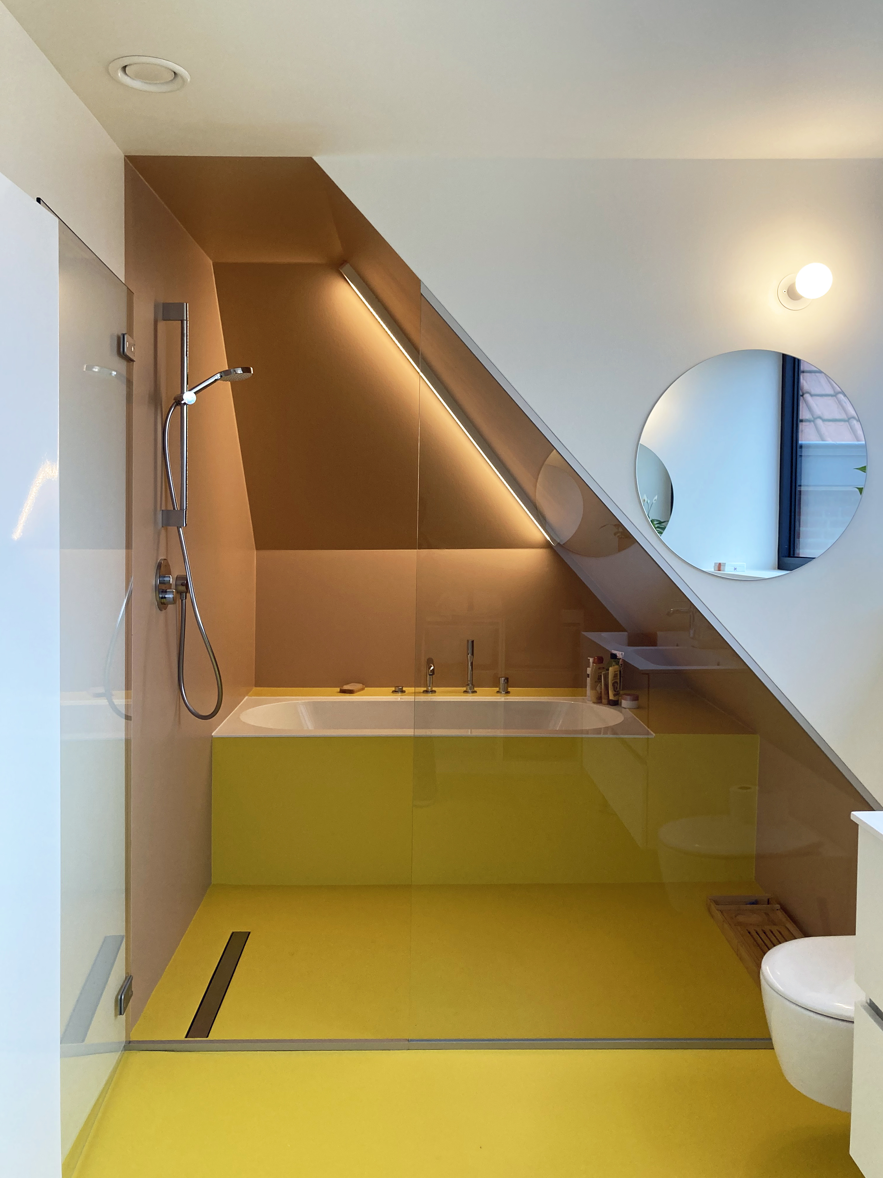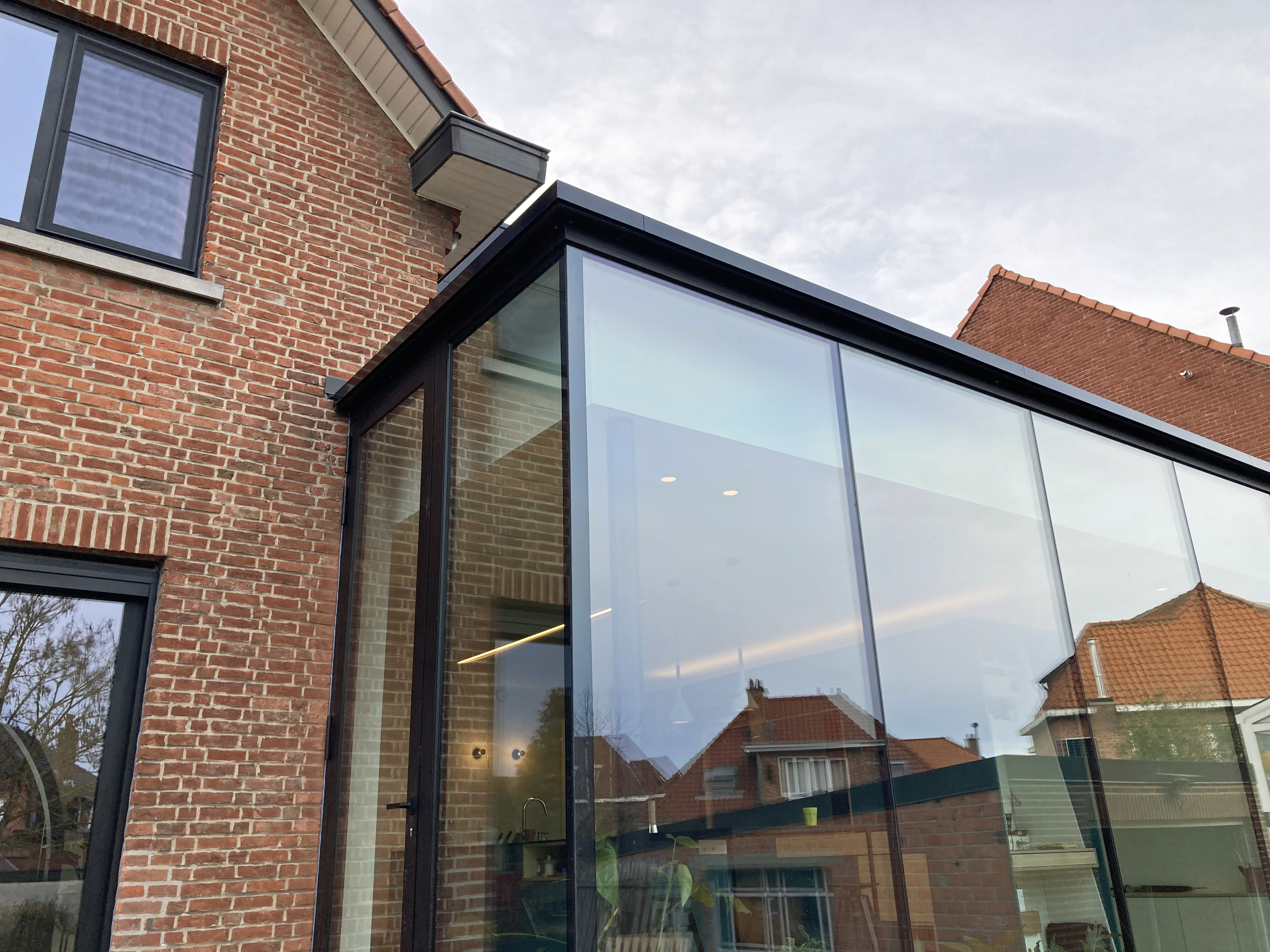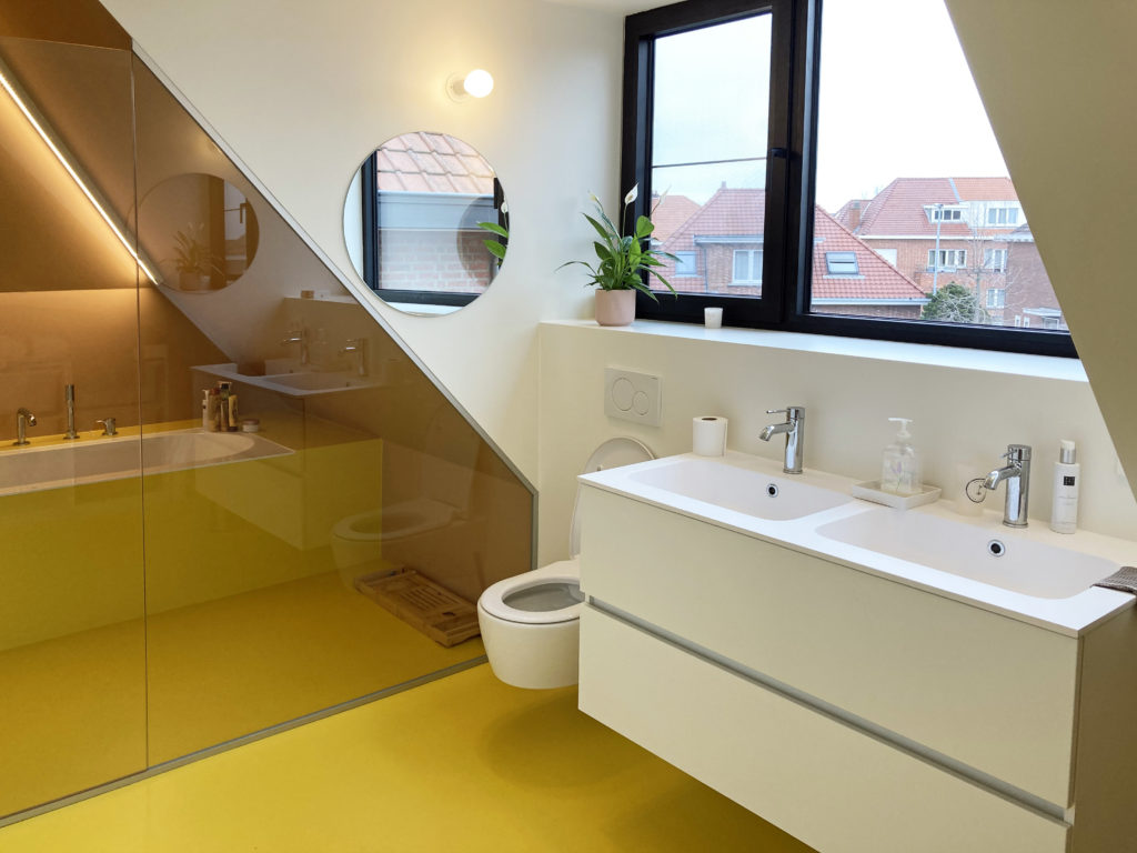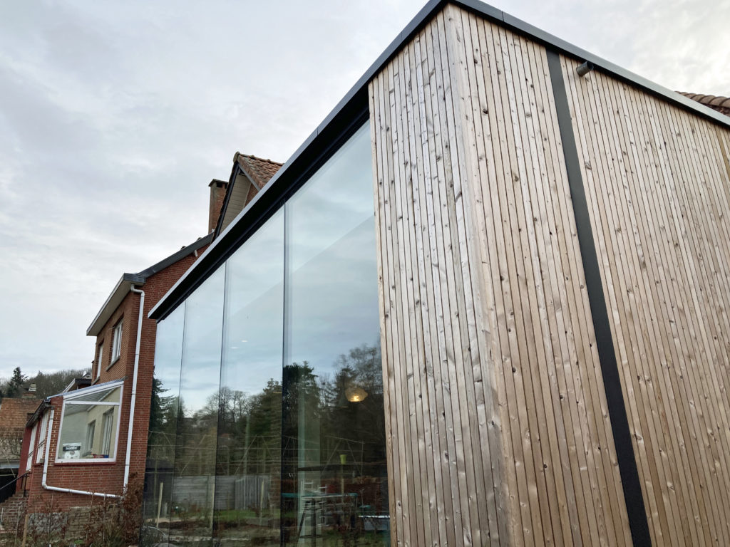 De wc en keldertrap zijn weggebroken om een centrale as te bekomen in het verlengde van de voordeur. Een kleine maar brede en volledig beglaasde uitbouw brengt licht, groen en ruimte in de nieuwe leefkeuken. Heel wat binnenmuren gaan er aan zodat keuken en ‘salon’ één vormen. De grote L-vormige woonruimte verenigt oud en nieuw, donker en licht, stemmig hout en gewaagd kleurrijk met het groen van de tuin als verbindend element.