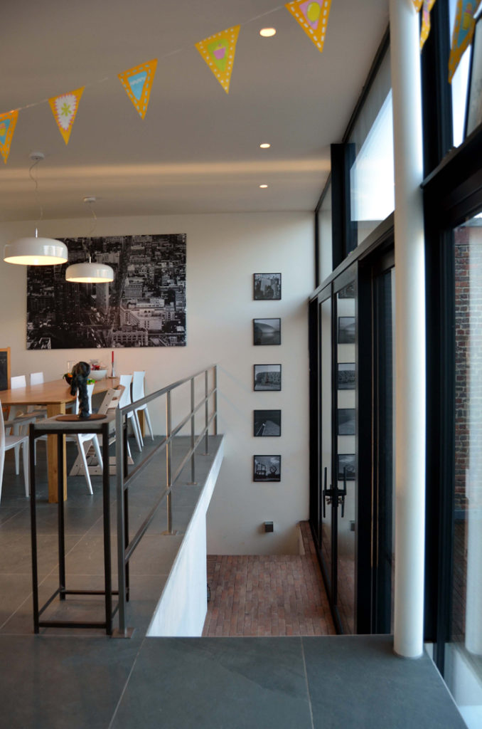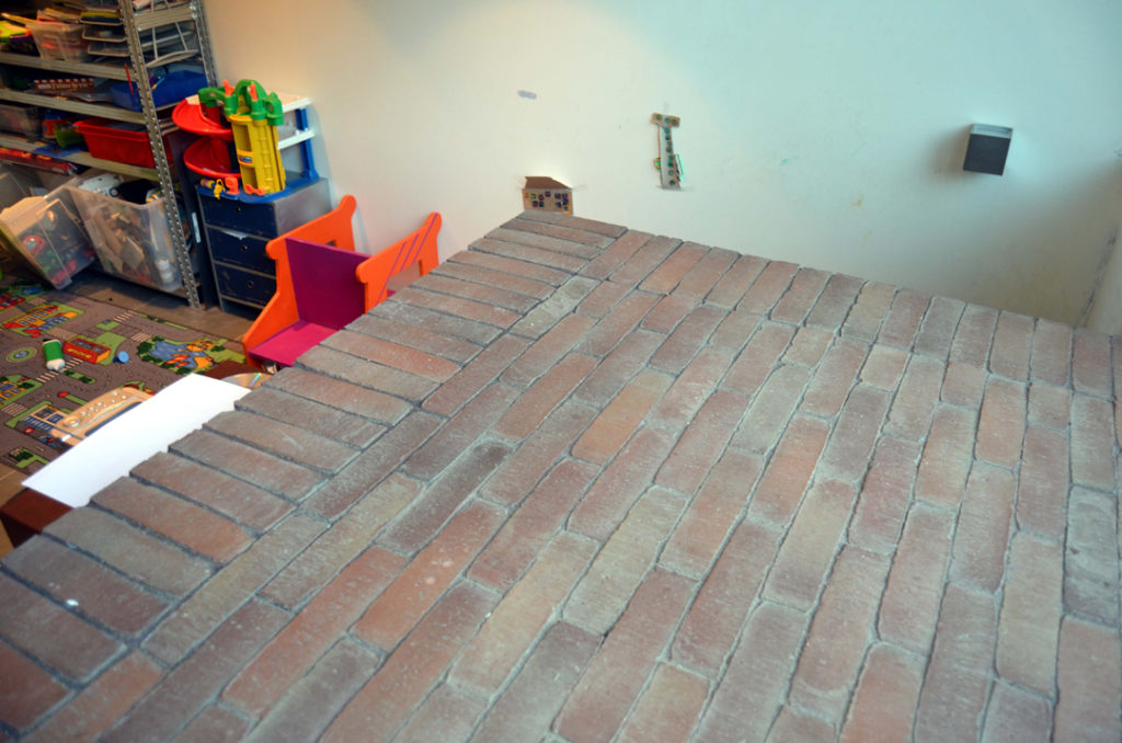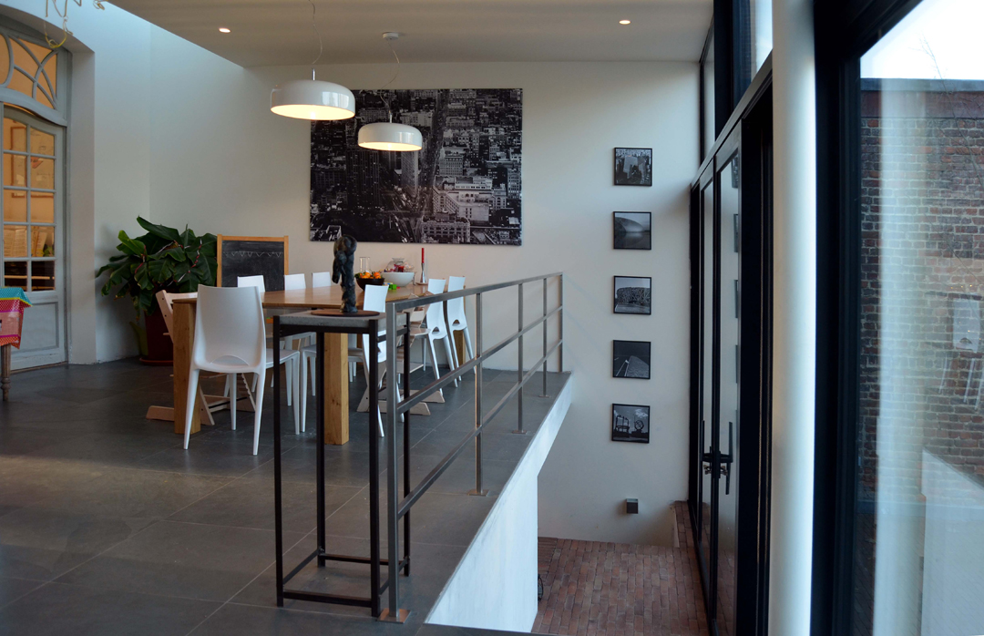 De aanbouw wordt aangezet op een nieuw terras, dat zich positioneert tussen het niveau van de gelijkvloerse verdieping met de leefkeuken en de lager gelegen tuin. Het terras is een stukje in de woning geschoven en is binnen afgewerkt met dezelfde kleiklinkers als buiten. Het doortrekken van een ‘buiten’materiaal naar binnen, versterkt de relatie met buiten. Bovendien legt het tussenniveau de link tussen de leefkeuken en de tuin enerzijds, maar anderzijds ook tussen de leefkeuken en de speelhoek op kelderniveau. Leuk detail: deze speelhoek bevindt zich in de oude regenwaterput.