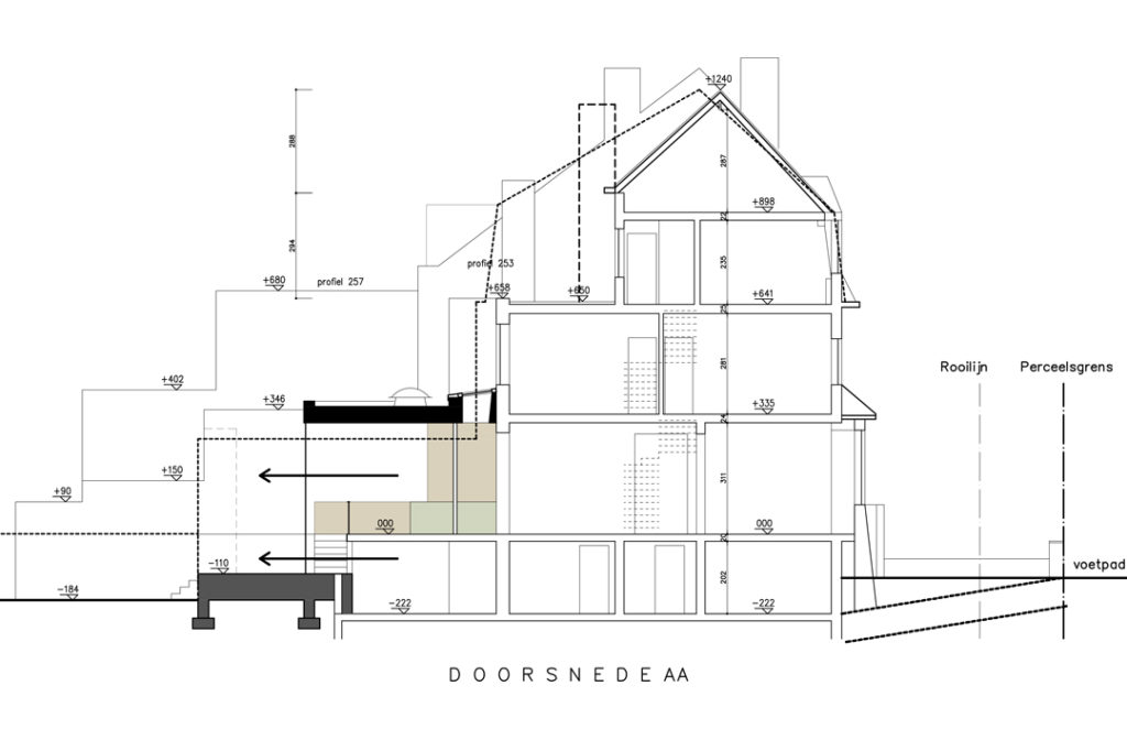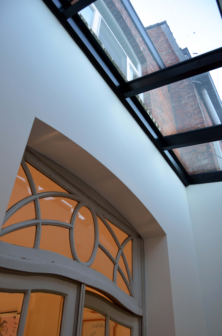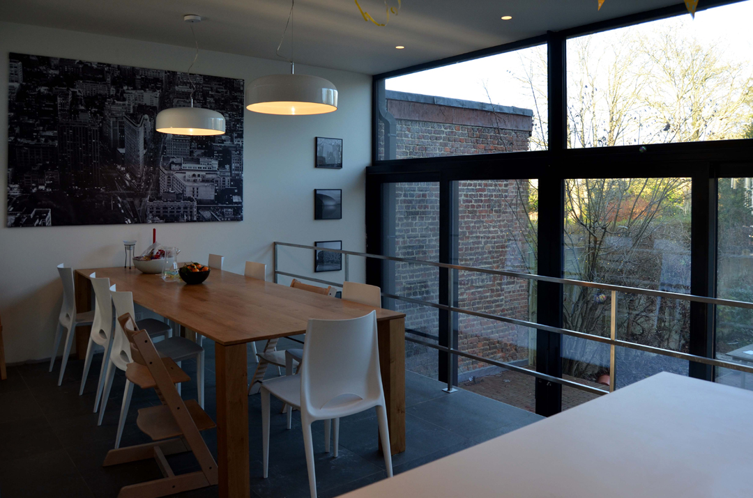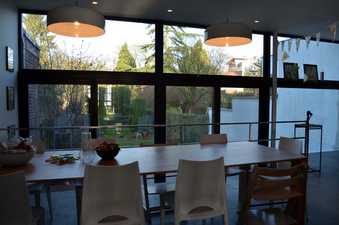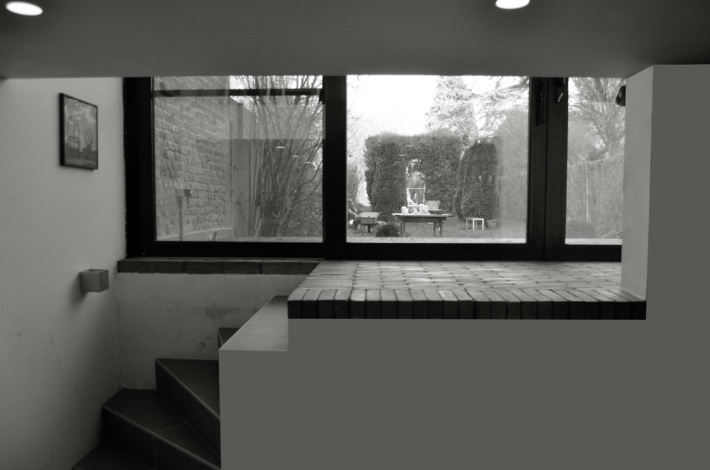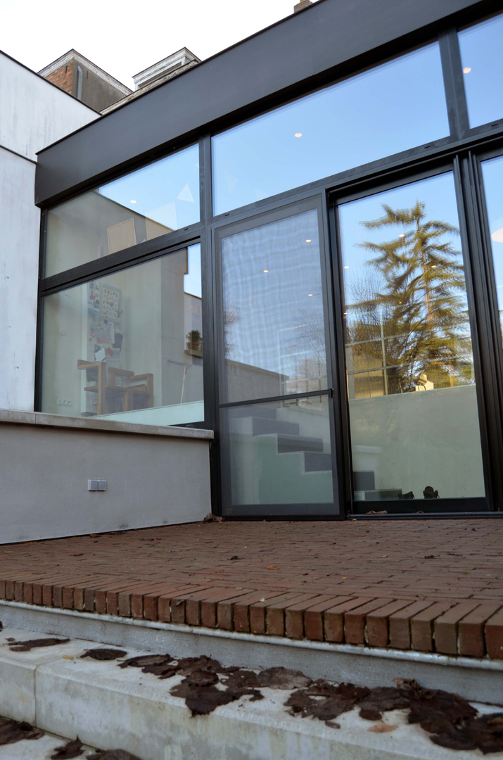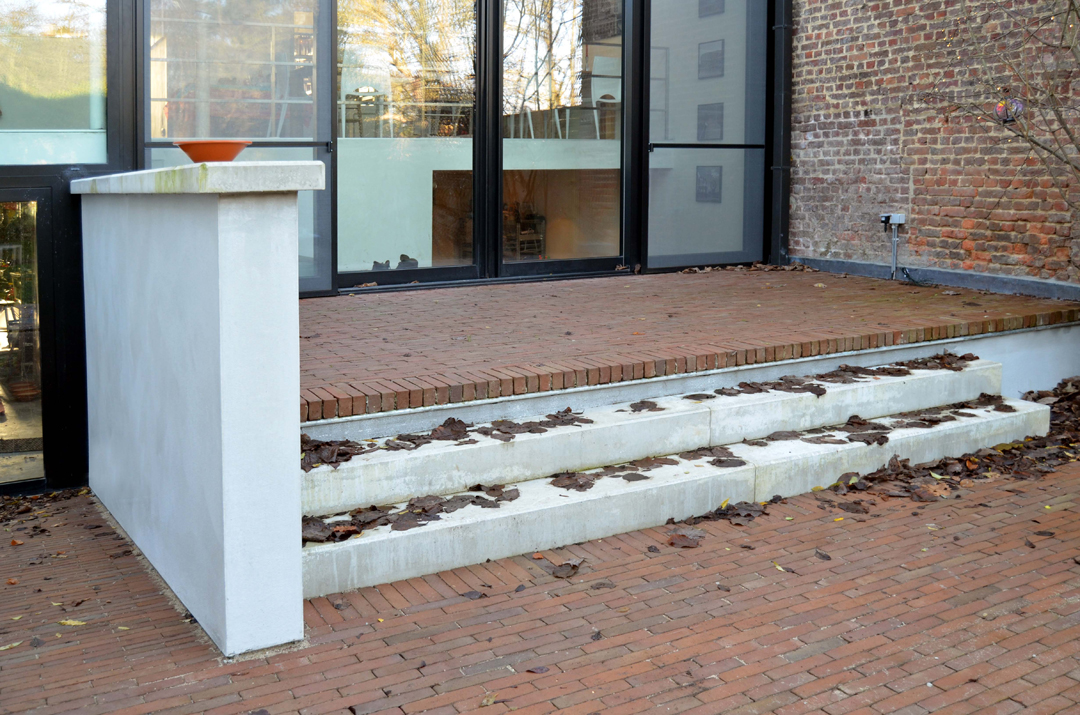 De overgang naar de veel lager gelegen tuin, vormde het grootste obstakel. Het zicht op de prachtige tuin was er wel, maar de toegang via een hoge trap, nodigde niet gauw uit om de tuin in te gaan. Een oude aanbouw, opgevat als een soort wintertuin met een hoge buitentrap en overdekt terrasje, wordt vervangen door een groot beglaasd volume. De raamverdeling met de horizontale lijn verwijst nog naar de oorspronkelijke raamverdeling van de wintertuin.