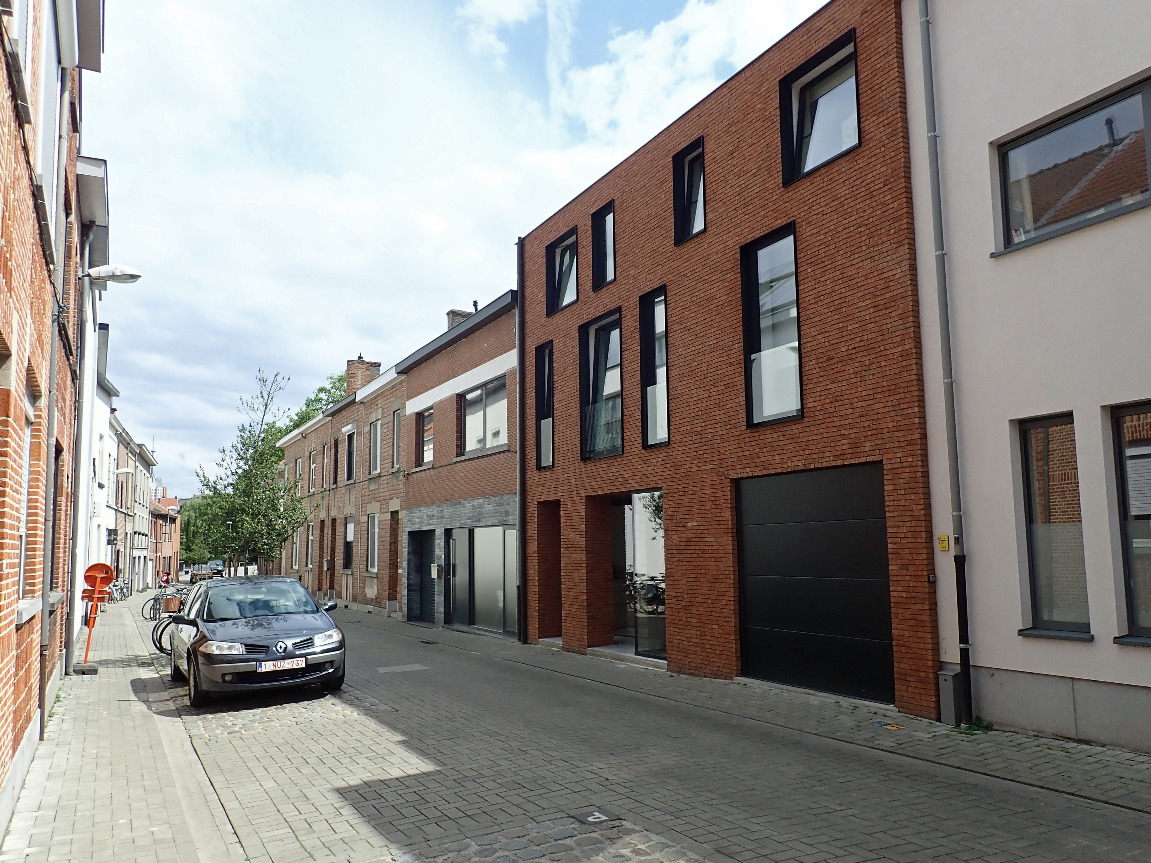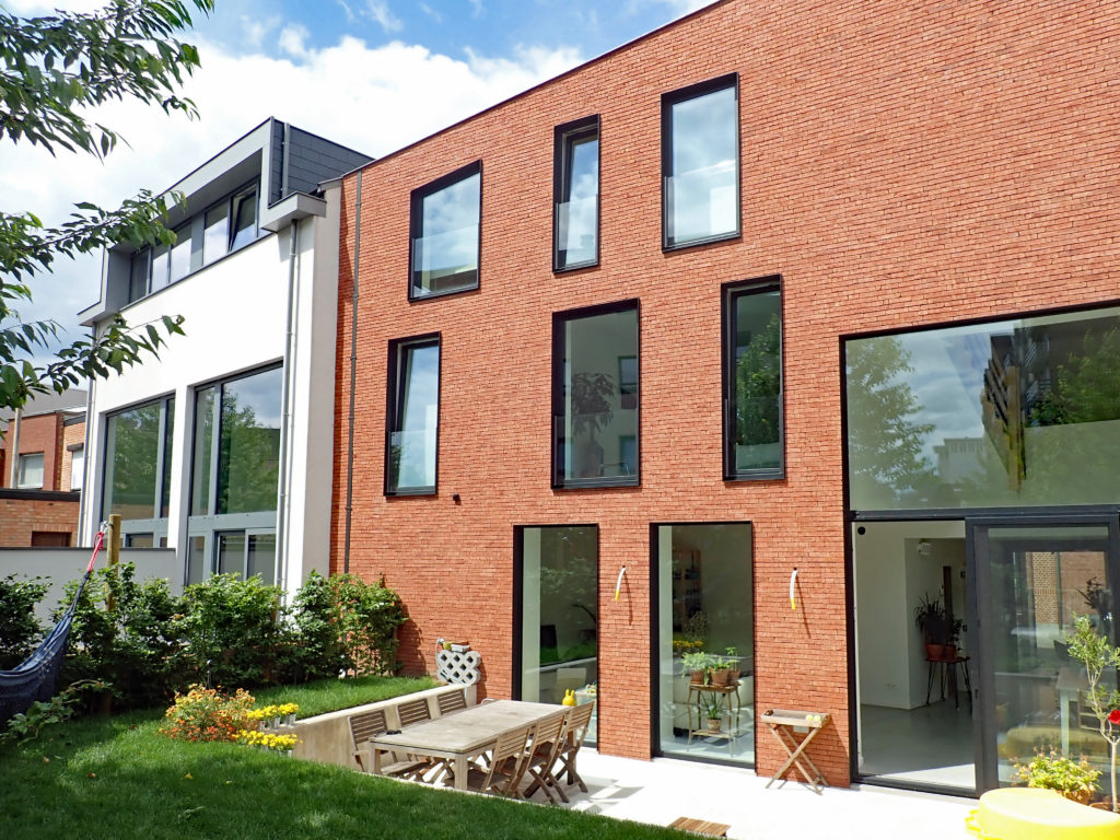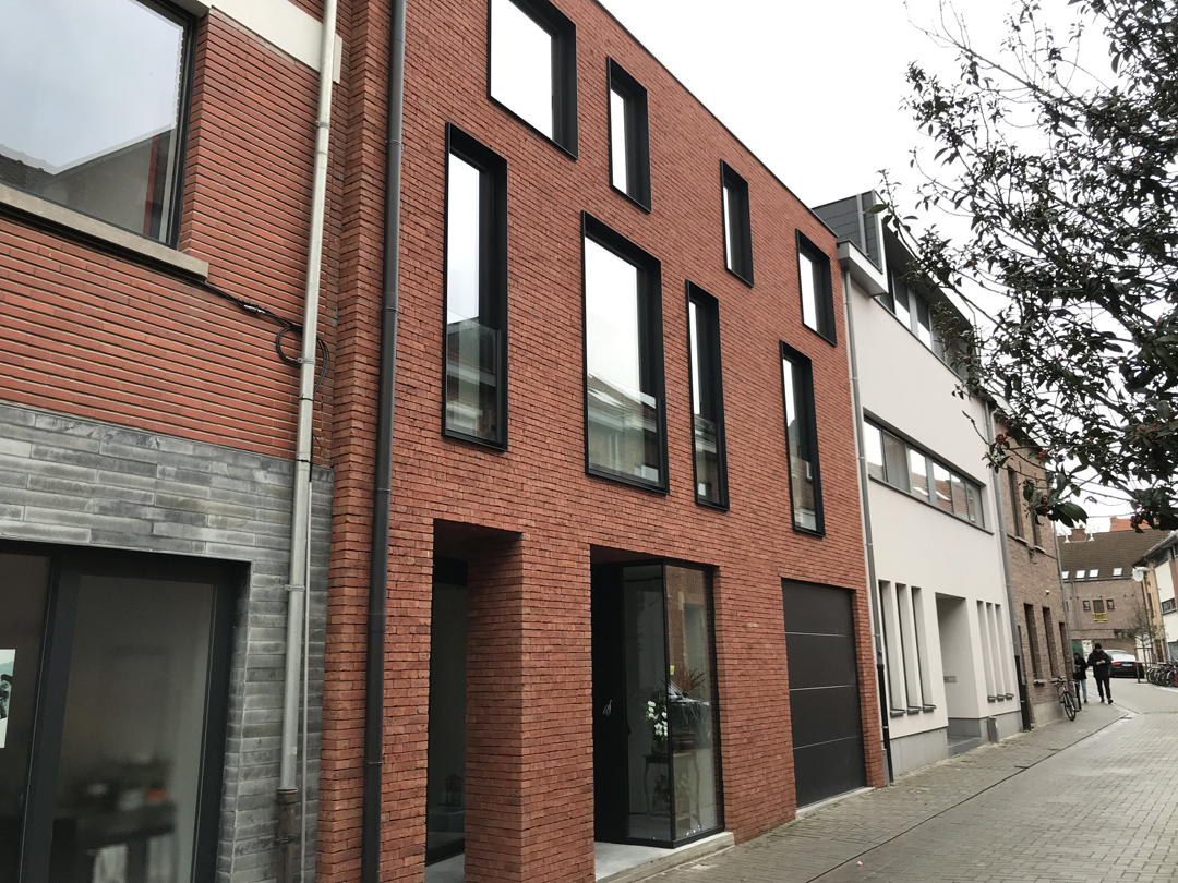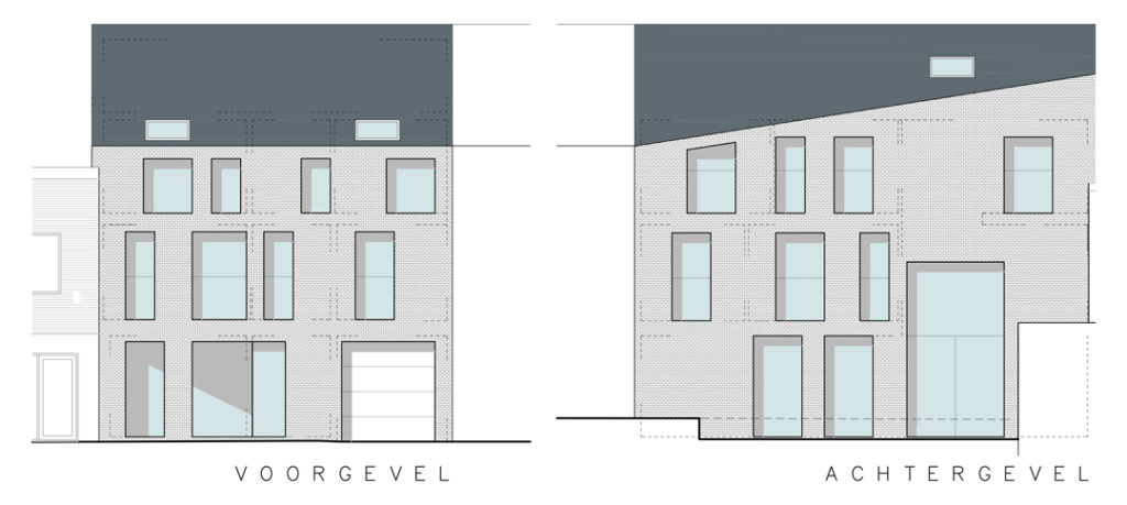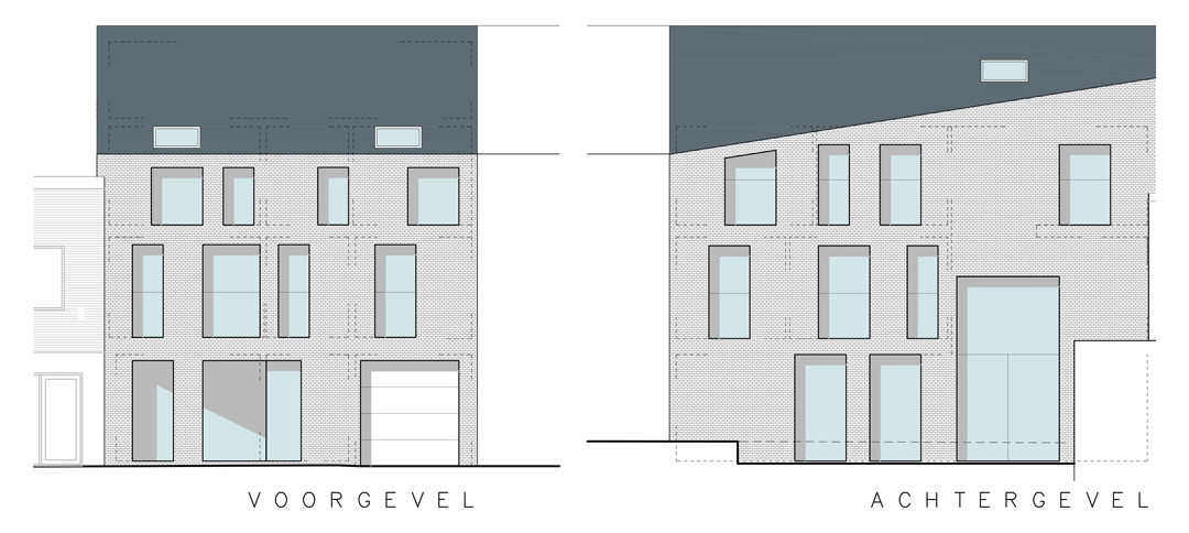 Voortbouwend op de bestaande openingen ontstaat er een nieuwe gevelcompositie. Aan de straatzijde staat het glas een stuk achter de gevelopeningen waardoor de stoep tot in de woning komt. Deze tussenzone vormt een buffer tussen de rustige straat en het interieur. Met het raam open kook je haast op de stoep. De achtergevel heeft een groot raam over meerdere verdiepingen. Van op de straat zie je door de huis het groene parkje achteraan. Op die manier geven we een stukje privé-terrein terug aan de buurt.