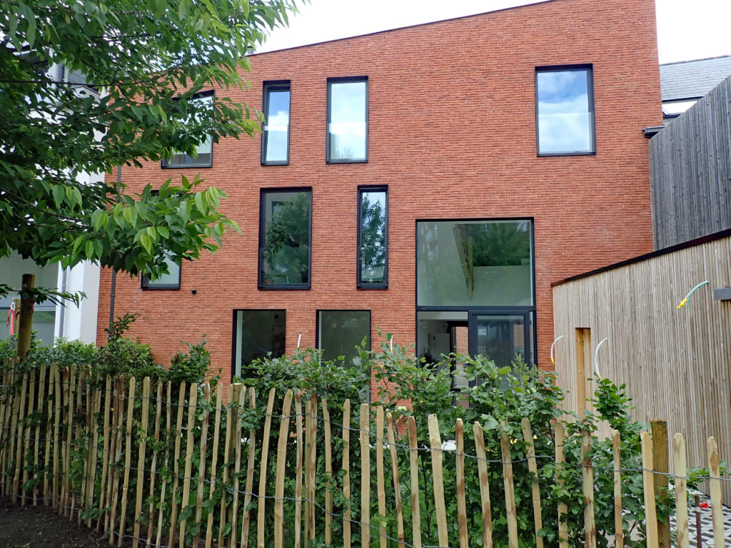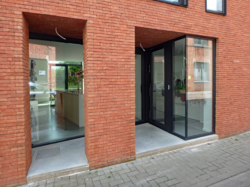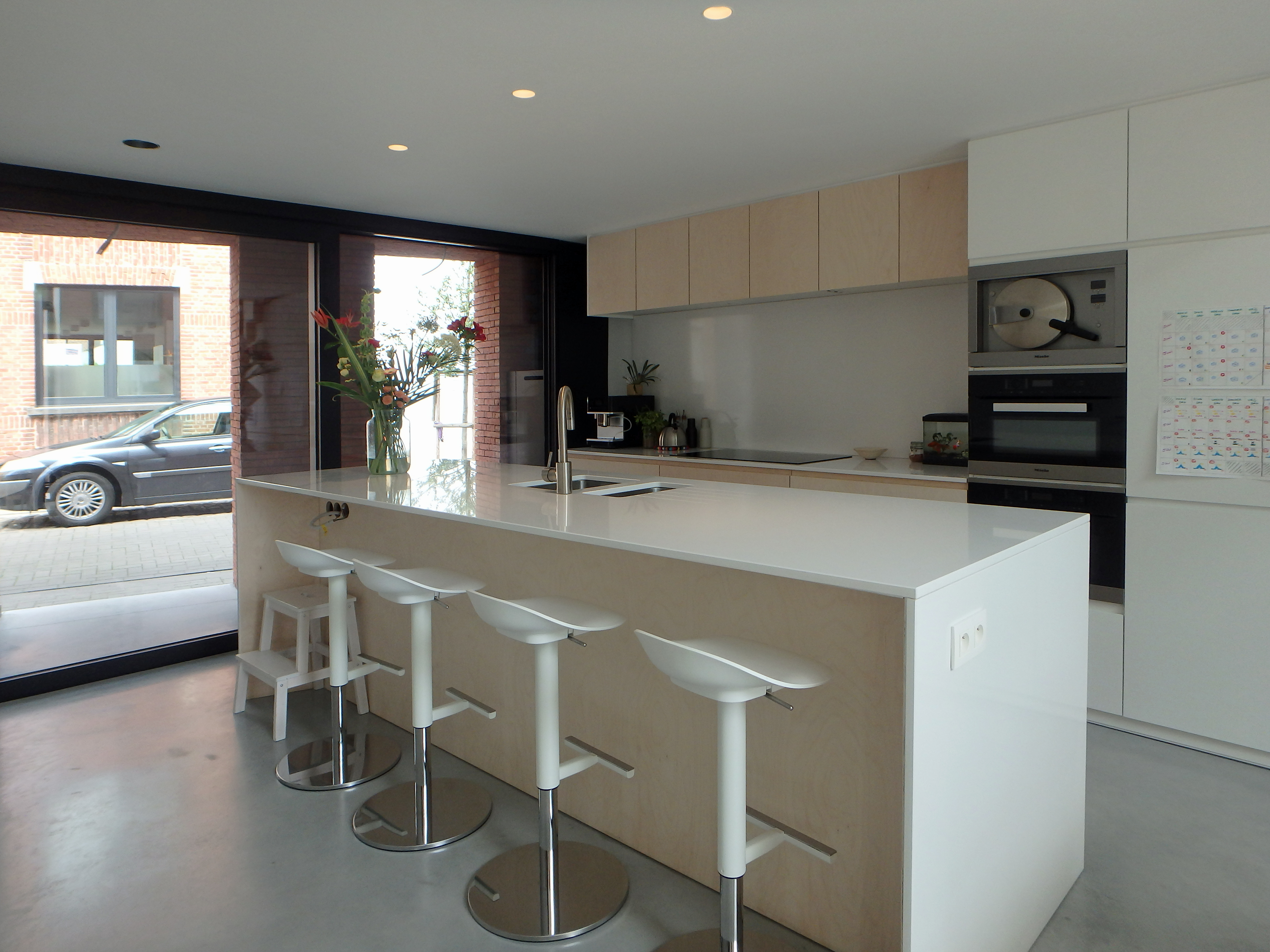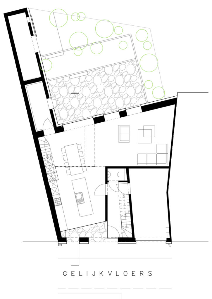 Voortbouwend op de bestaande openingen ontstaat er een nieuwe gevelcompositie. Aan de straatzijde staat het glas een stuk achter de gevelopeningen waardoor de stoep tot in de woning komt. Deze tussenzone vormt een buffer tussen de rustige straat en het interieur. Met het raam open kook je haast op de stoep. De achtergevel heeft een groot raam over meerdere verdiepingen. Van op de straat zie je door de huis het groene parkje achteraan. Op die manier geven we een stukje privé-terrein terug aan de buurt.