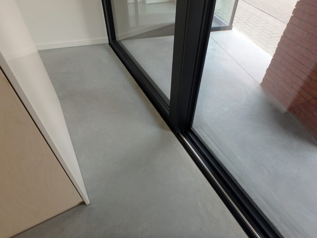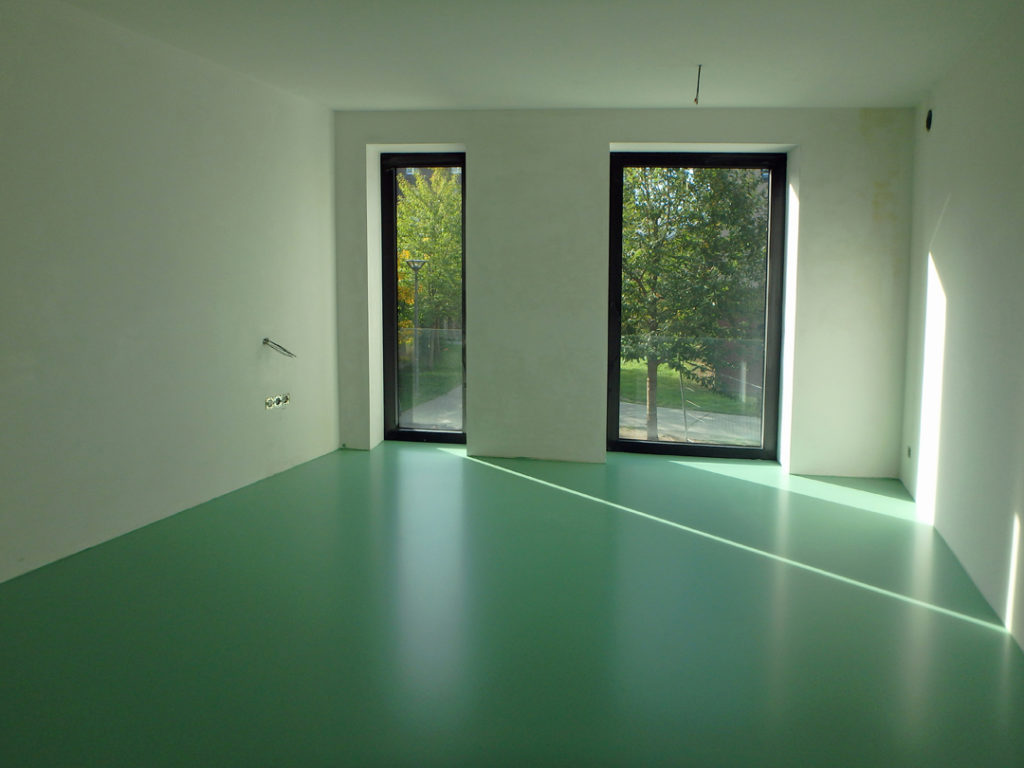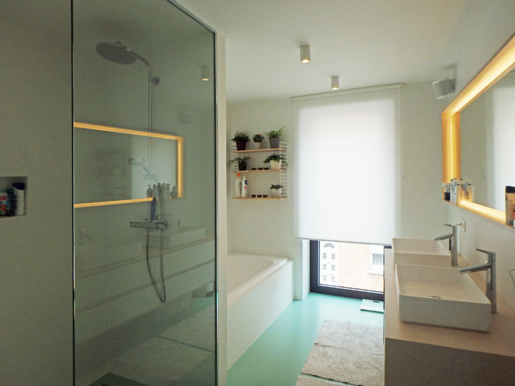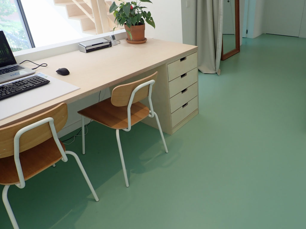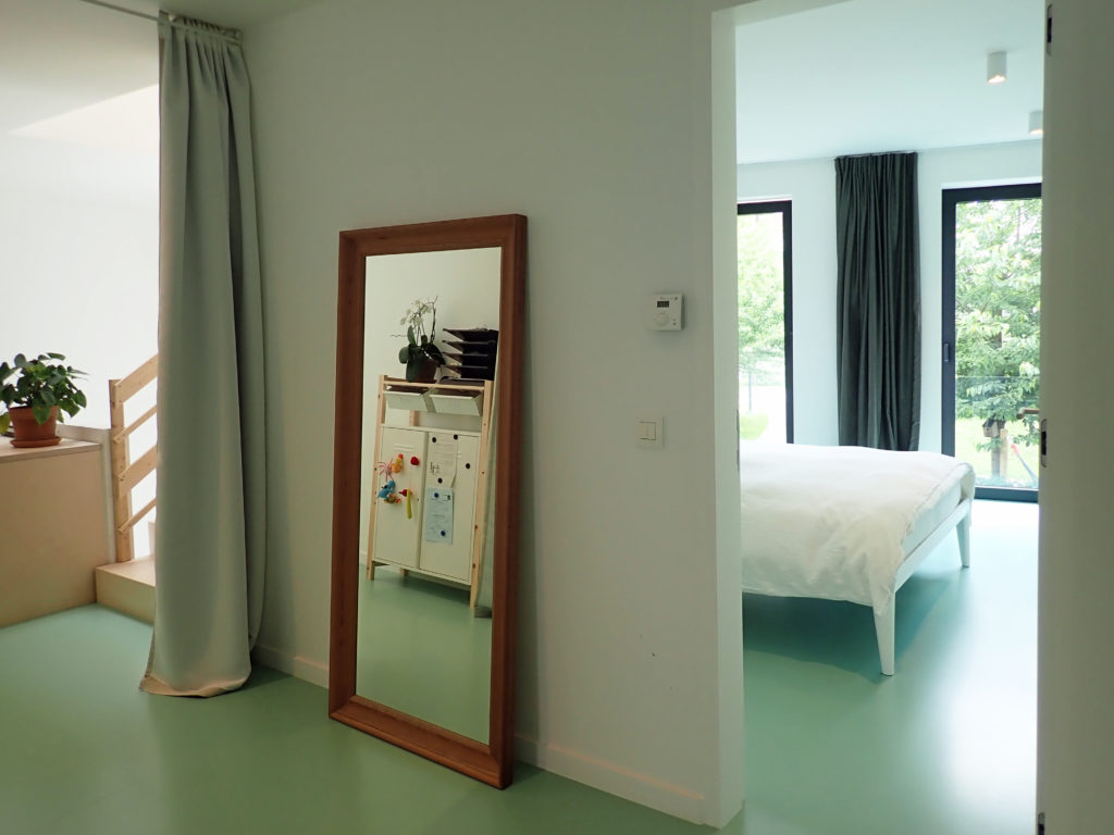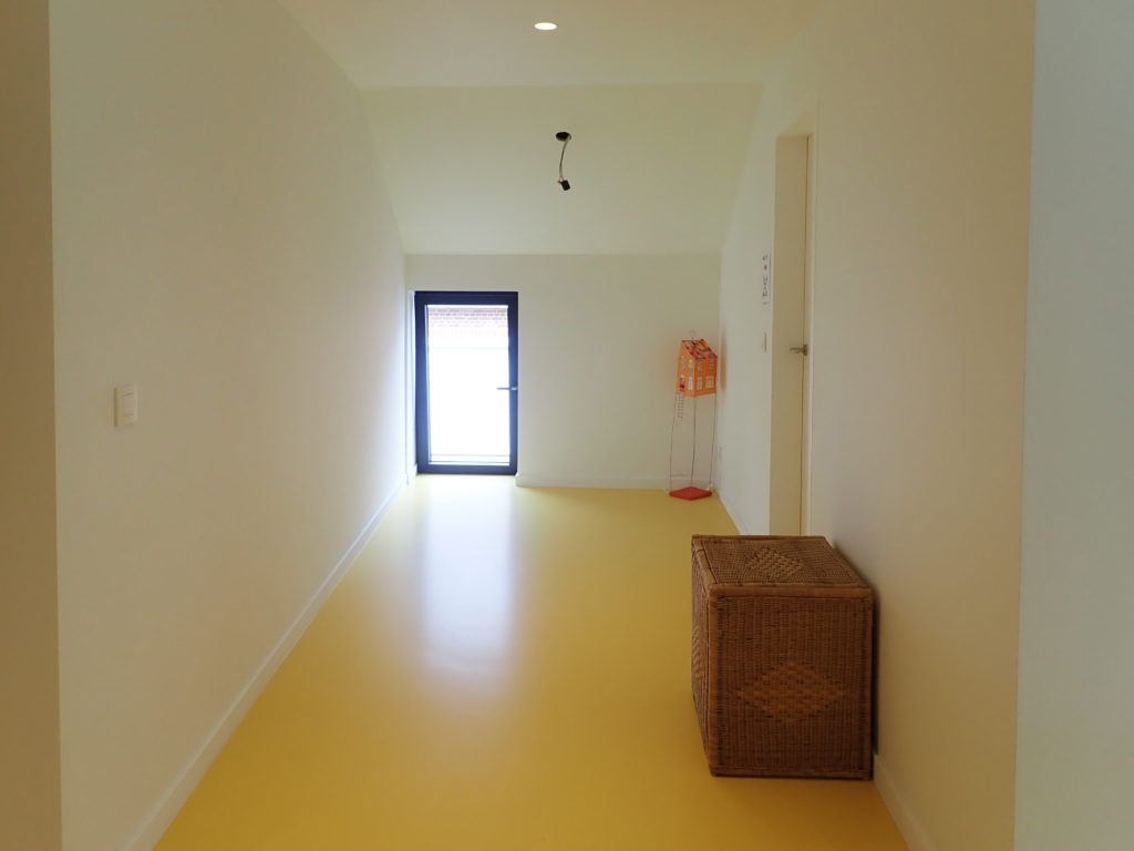 Gepolierde betonvloeren contrasteren met het zacht schrijnwerk in berkenmultiplex. De gietvloeren op de verdiepingen in warm geel en muntgroen refereren naar het kleurenpalet van Le Corbusier. Het wisselend zonlicht dat via het grote raam en de vide in heel de woning doordringt, heeft vrij spel op de witte muren.