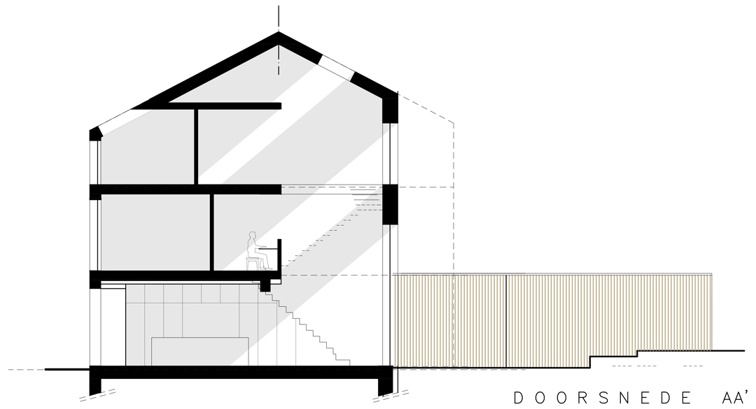 Binnen de contouren van de bestaande bebouwing en met respect voor de basisstructuur, ontstaat een nieuwe indeling. Door een verdieping met zadeldak toe te voegen, kan een gezin met kinderen er comfortabel wonen. Tegelijkertijd laat het ontwerp toe dat bewoners, met een kleine ingreep, enkele studentenkamers kunnen inrichten, conform de geldende regels en met eigen trap, sanitair en keuken.