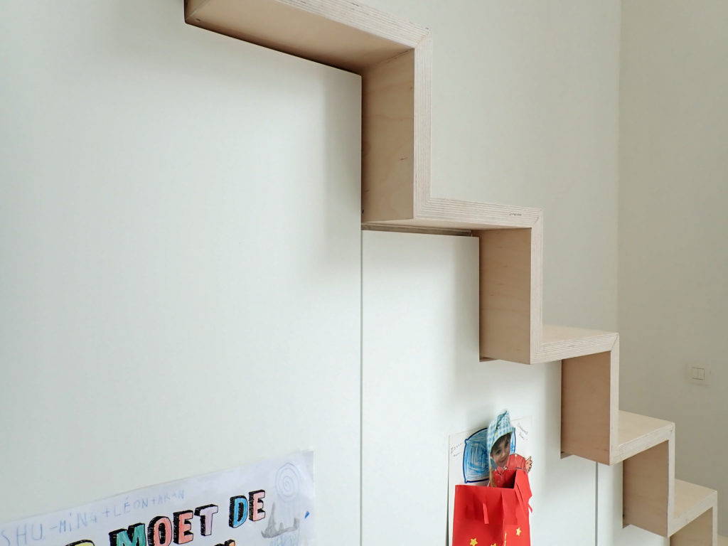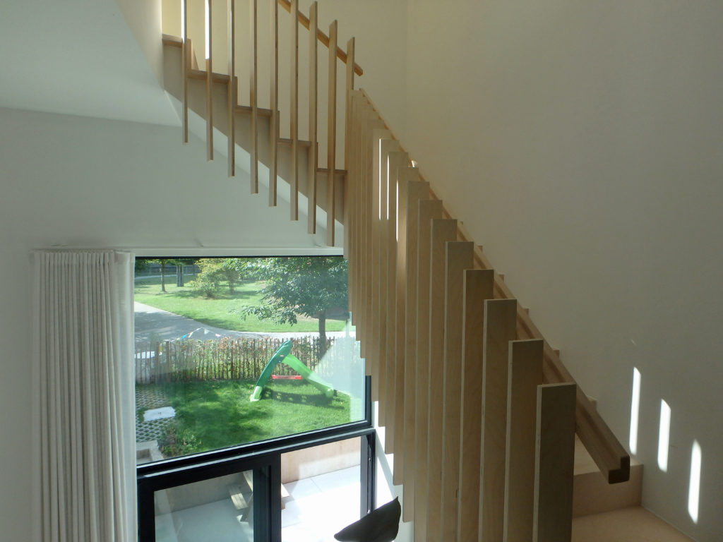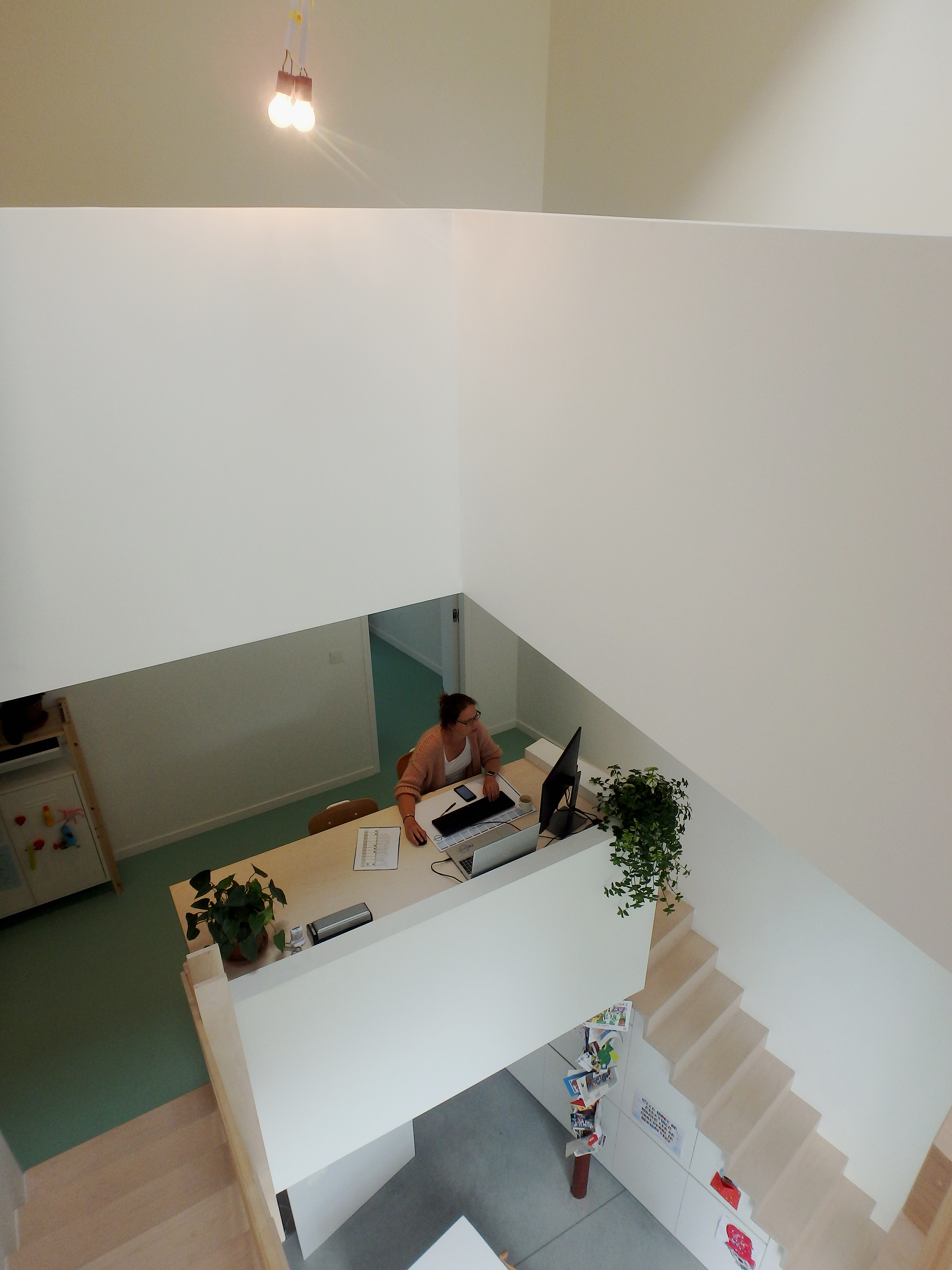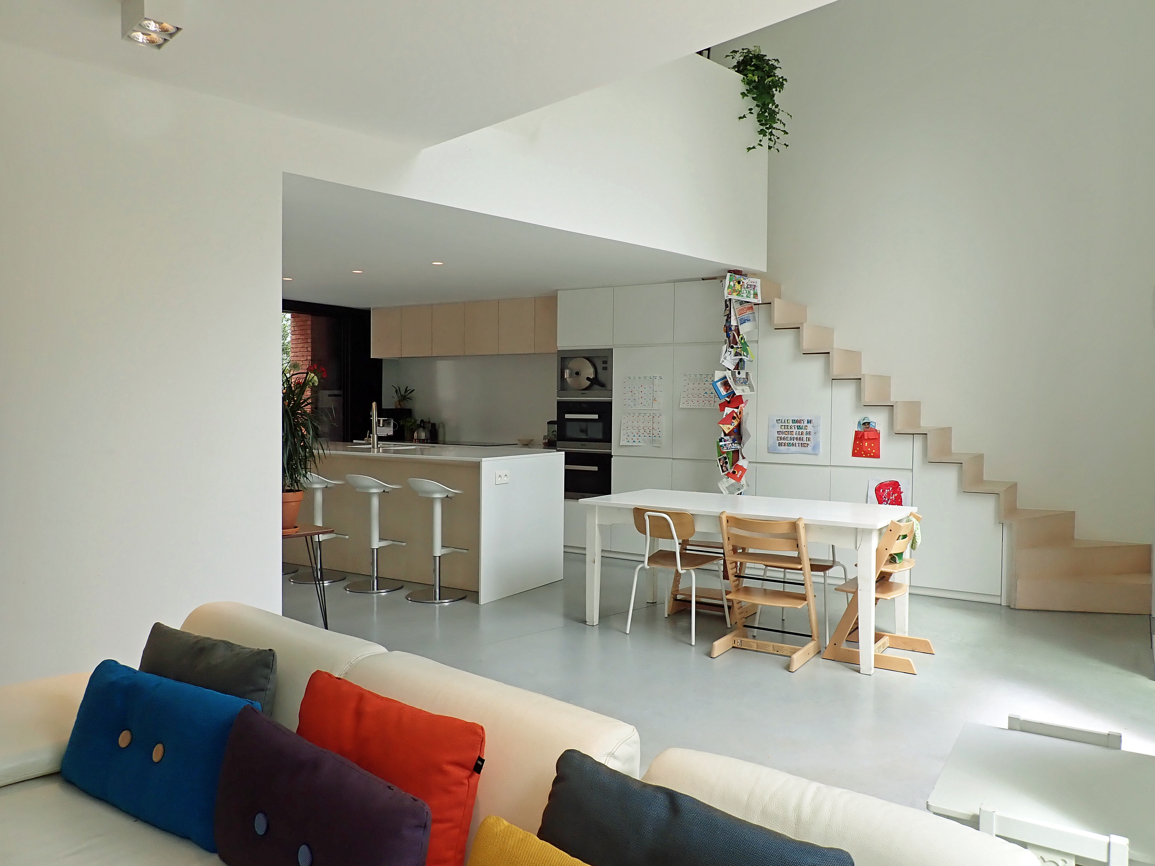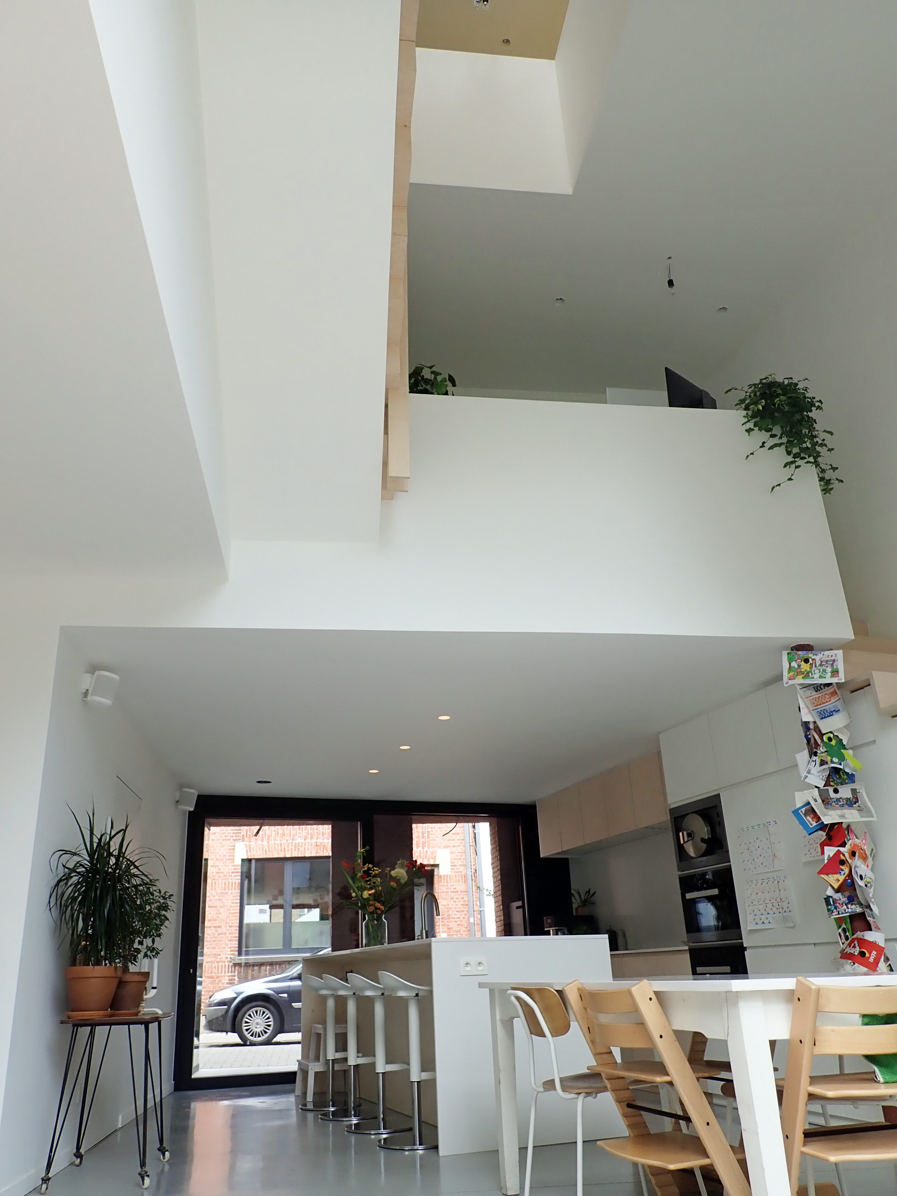 In de leefruimte start een trap die via een enorme vide door het hele huis slingert. Op elke verdieping zijn er ruime bordessen die telkens een eigen invulling krijgen maar altijd in relatie staan met de centrale leefruimte. Het hoge raam maakt van de vide een lichtschacht maar biedt ook van op elke plek een zicht naar het achterliggende groen en de stad.
