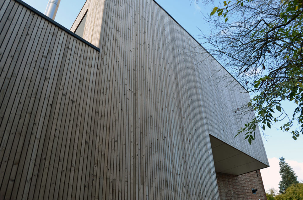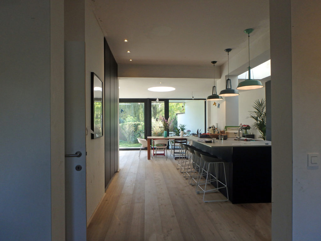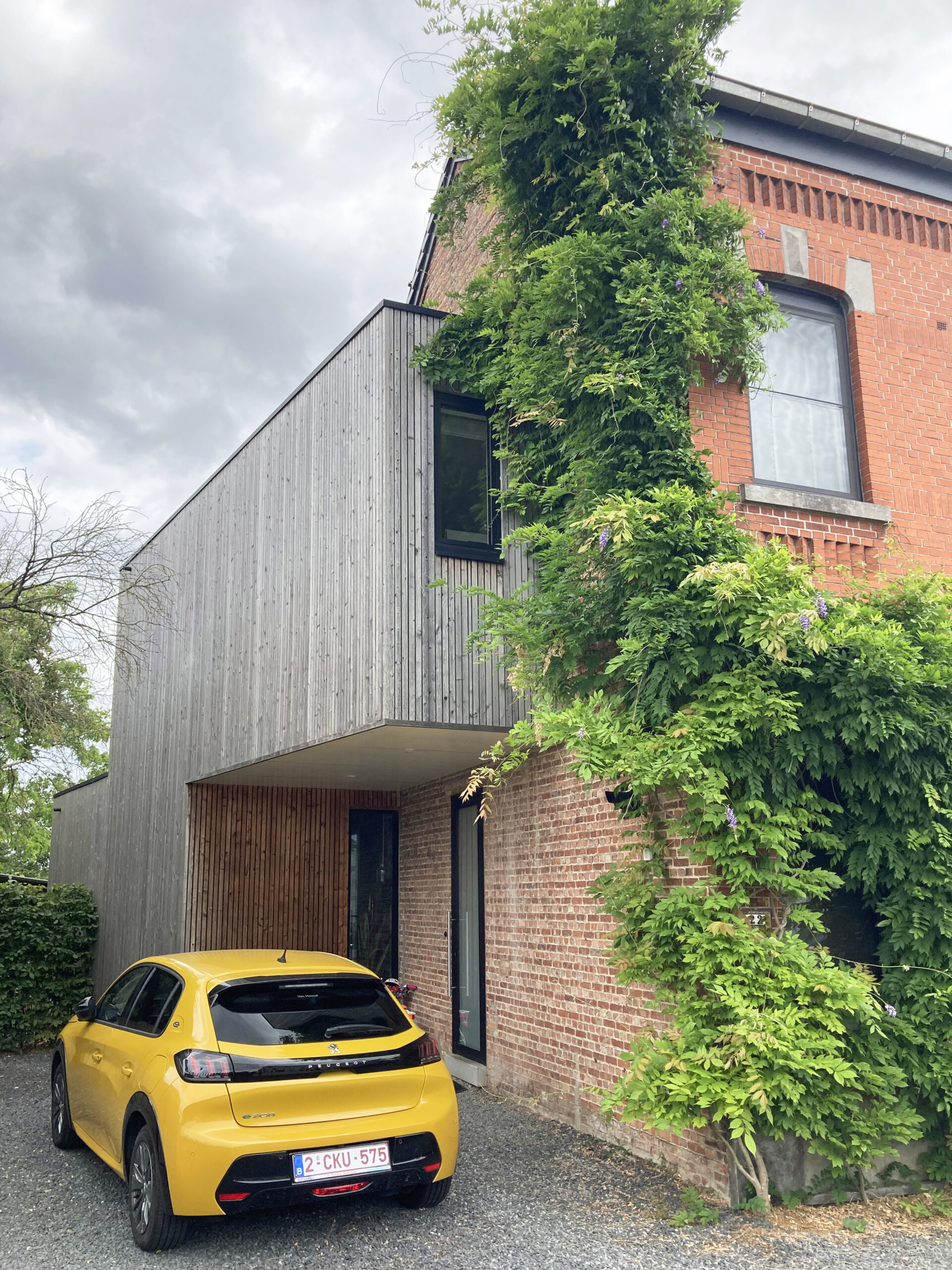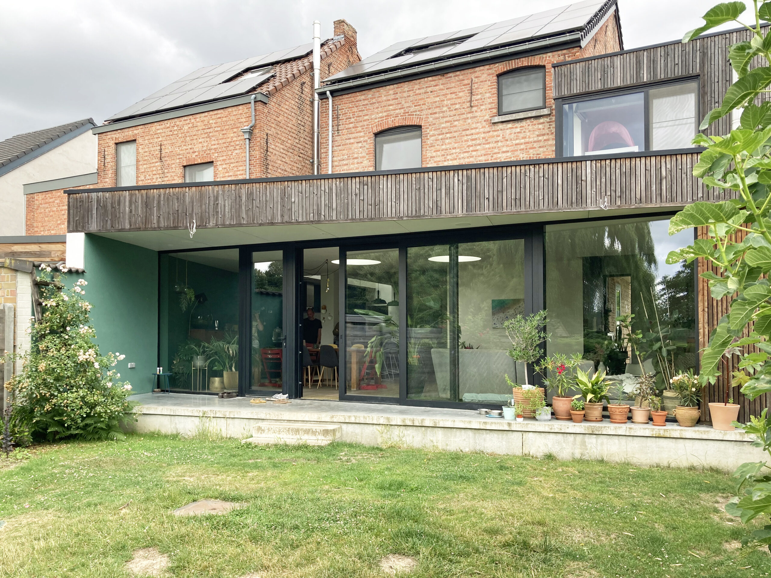 De conclusie was gemaakt: de recente aanbouw slopen en een nieuw uniform volume ontwerpen dat de tuin mooi ontsluit, functioneel en hedendaags opgevat is en waarin volop ‘geleefd’ mag worden. Het resultaat is een langgerekt volume dat rondom de woning krult als een slang. De kop start boven de voordeur in de zijgevel en vormt een overdekte inkom/carport. De huid als verticaal geplaatste latten plooit om de achtergevel en opent zich naar de tuin. Het schuifraam is naar binnen geduwd en zorgt voor een overdekt terras. De slang krult verder tussen 2 wachtgevels en eindigt in een berging aan de straatkant. Het dak is opengemaakt met een lichtstraat en twee ronde koepels.