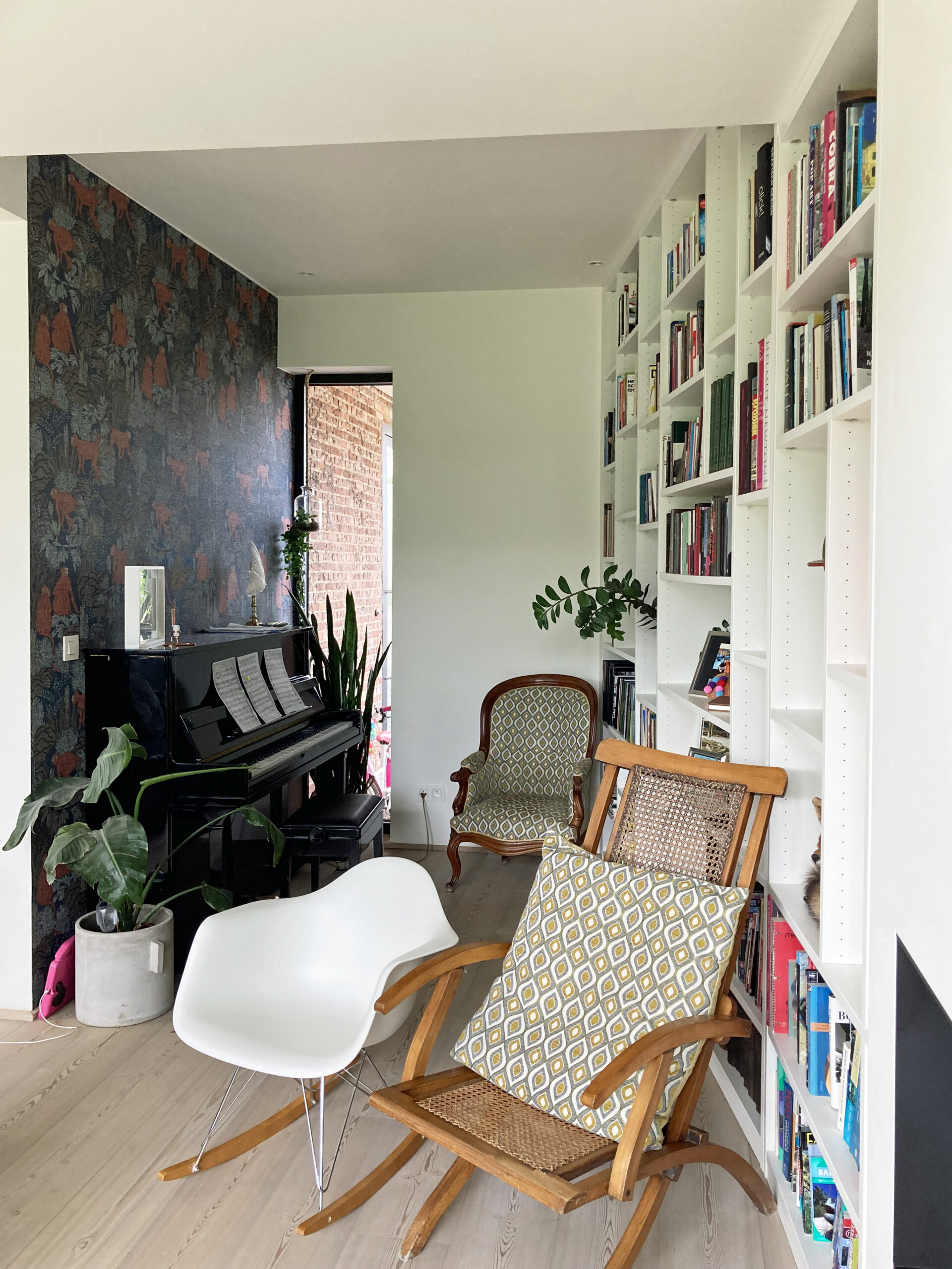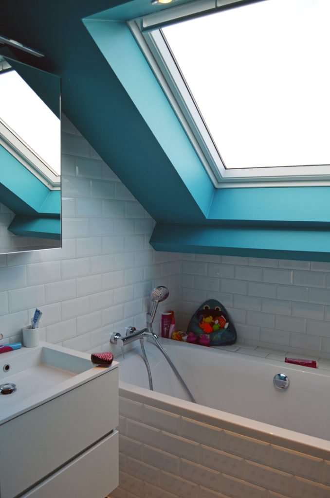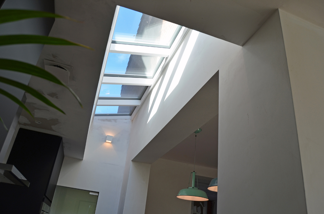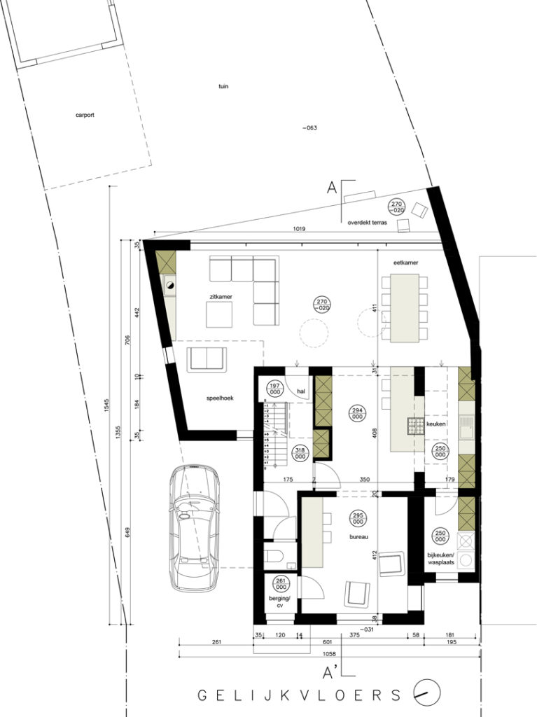De conclusie was gemaakt: de recente aanbouw slopen en een nieuw uniform volume ontwerpen dat de tuin mooi ontsluit, functioneel en hedendaags opgevat is en waarin volop ‘geleefd’ mag worden. Het resultaat is een langgerekt volume dat rondom de woning krult als een slang. De kop start boven de voordeur in de zijgevel en vormt een overdekte inkom/carport. De huid als verticaal geplaatste latten plooit om de achtergevel en opent zich naar de tuin. Het schuifraam is naar binnen geduwd en zorgt voor een overdekt terras. De slang krult verder tussen 2 wachtgevels en eindigt in een berging aan de straatkant. Het dak is opengemaakt met een lichtstraat en twee ronde koepels.