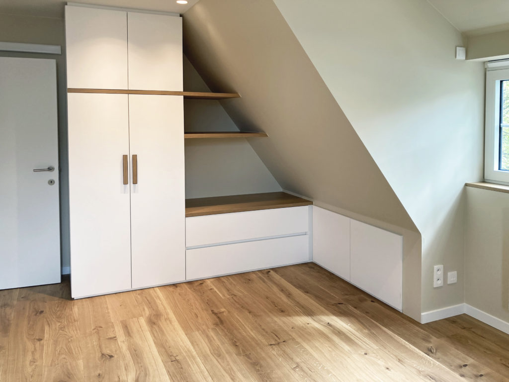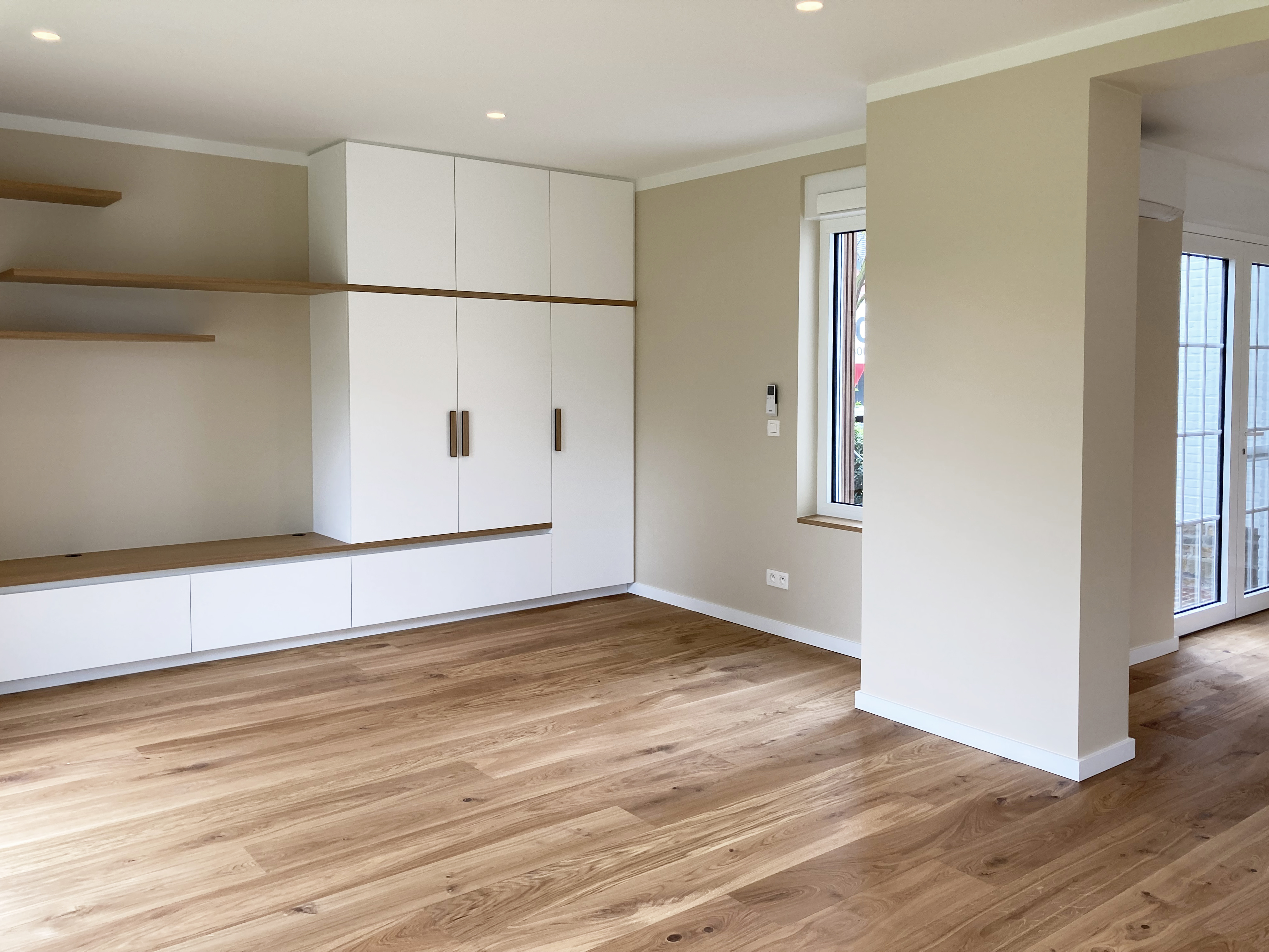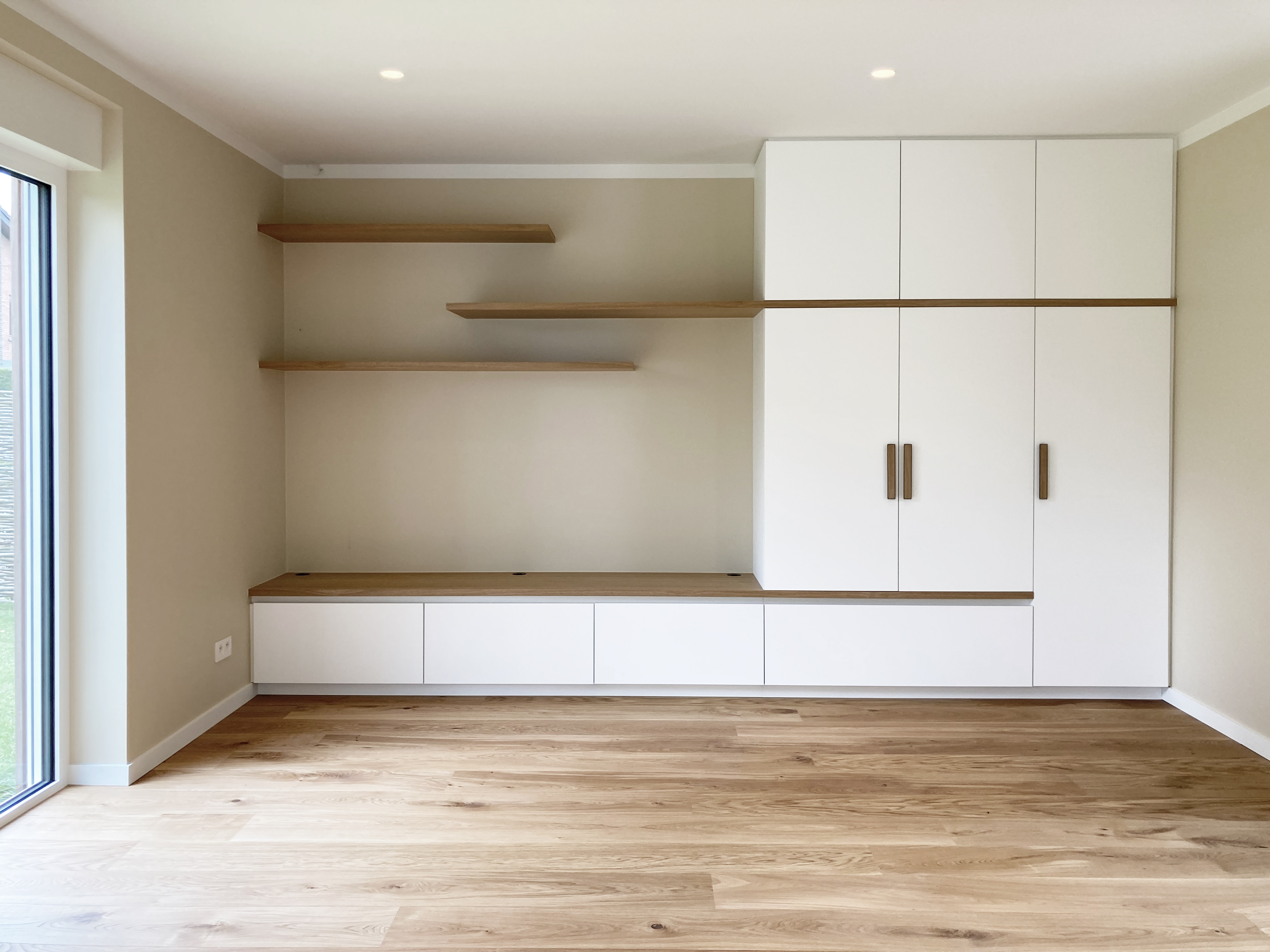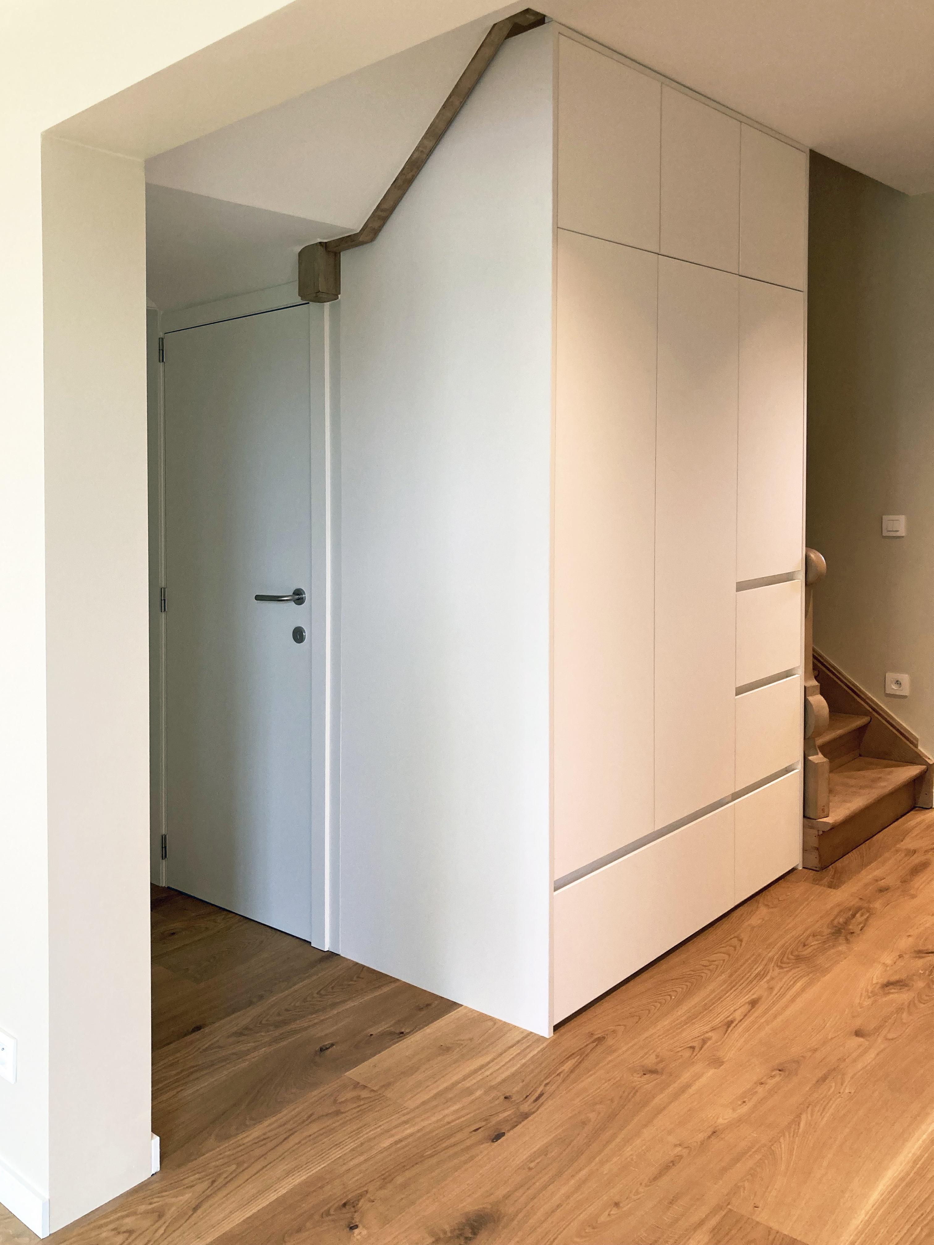 Het ontwerp van het vast meubilair dat overal in de woning dezelfde vormentaal hanteert, smeedt het geheel aan mekaar.