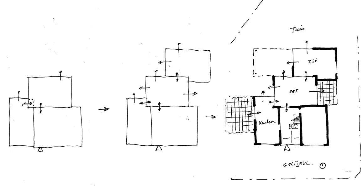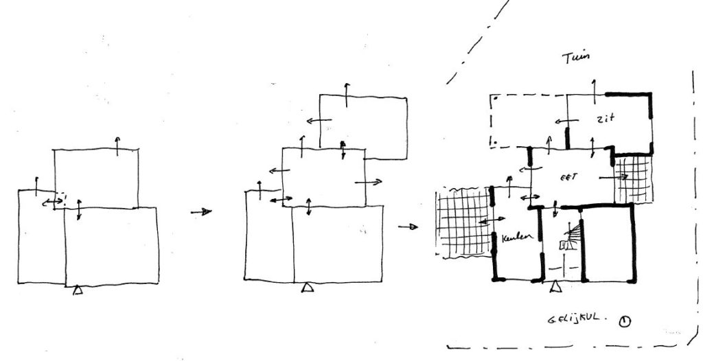 Het grondplan vormt een schakeling van in elkaar hakende ruimten. De uitbreiding zet deze trant verder richting tuin. Er ontstaat een parcours met verrassende doorzichten, intieme hoekjes en zonnige patio’s.