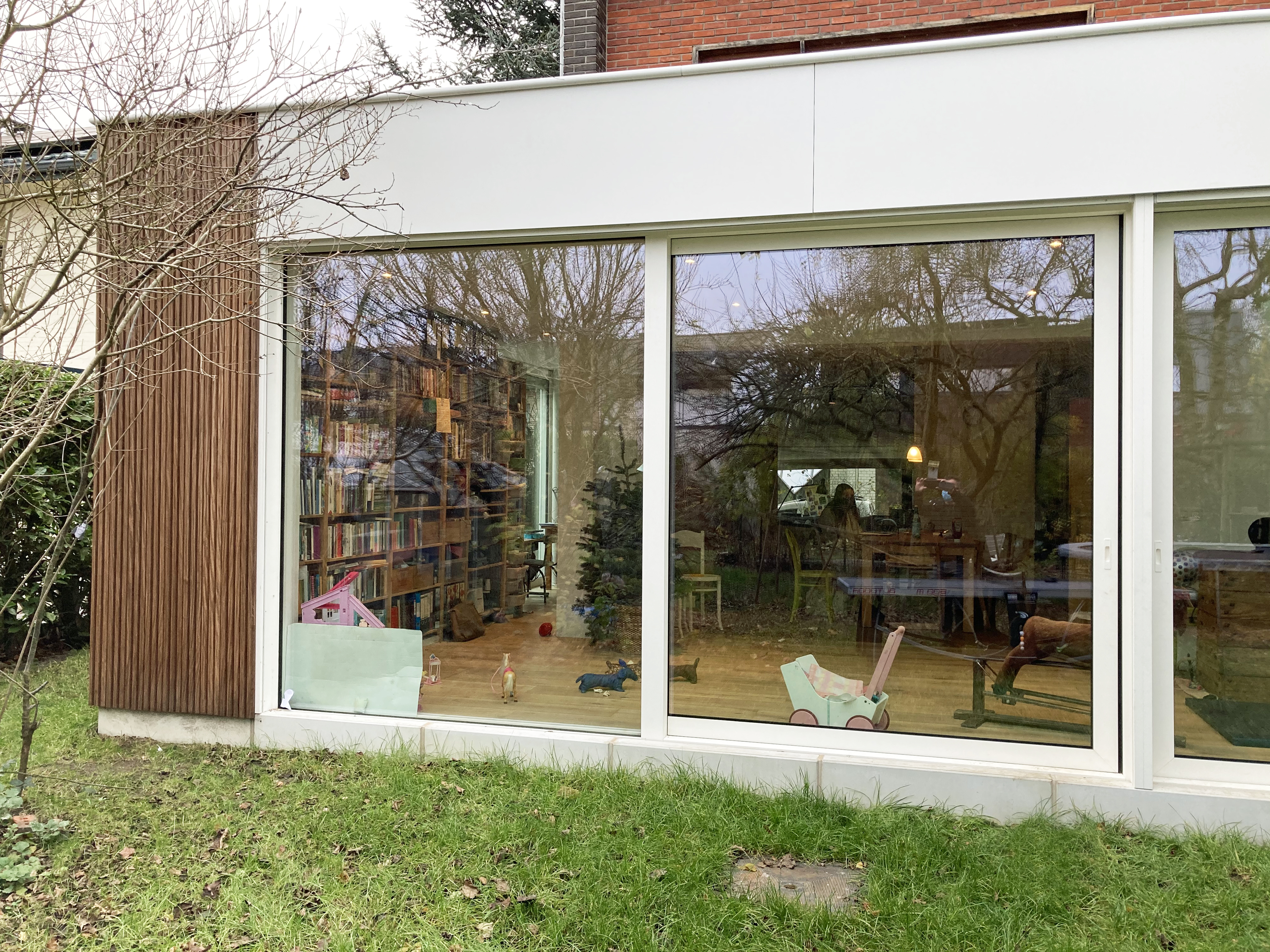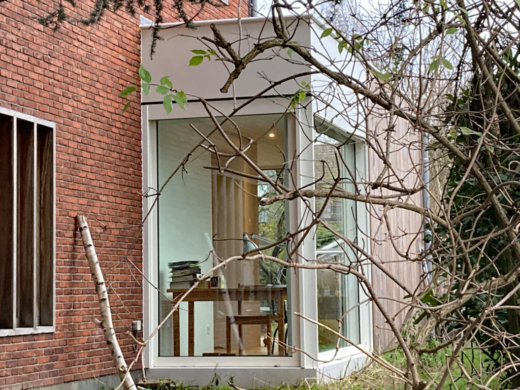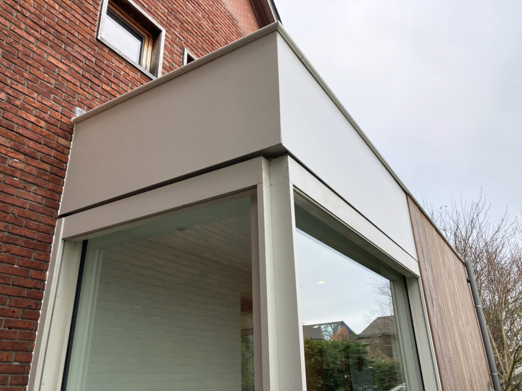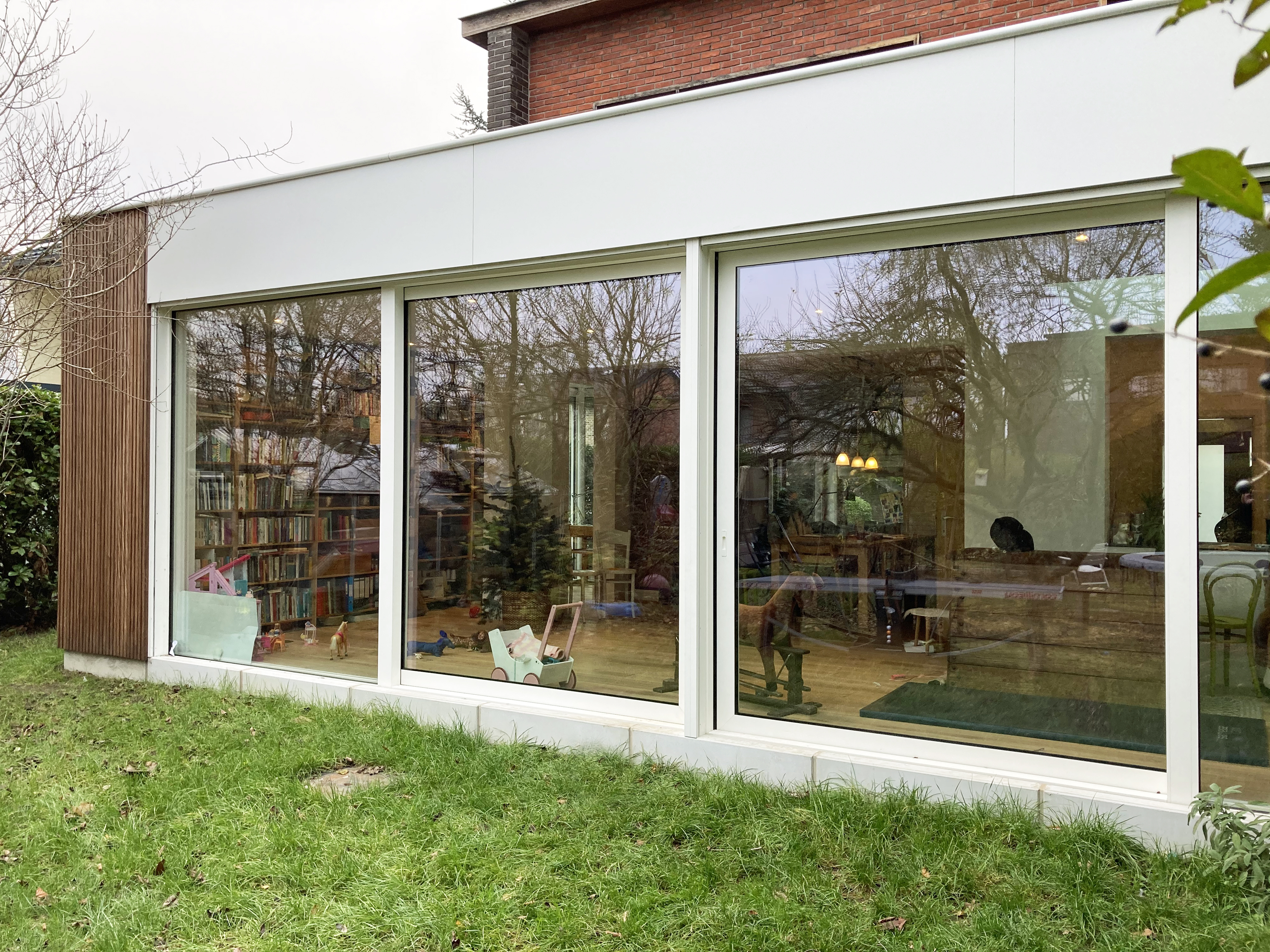 Wit gelakt aluminium, hout en glas zijn de gevelmaterialen die consequent zijn toegepast. Ze omarmen de massieve woning in rode baksteen en vormen een licht en transparant tegengewicht.