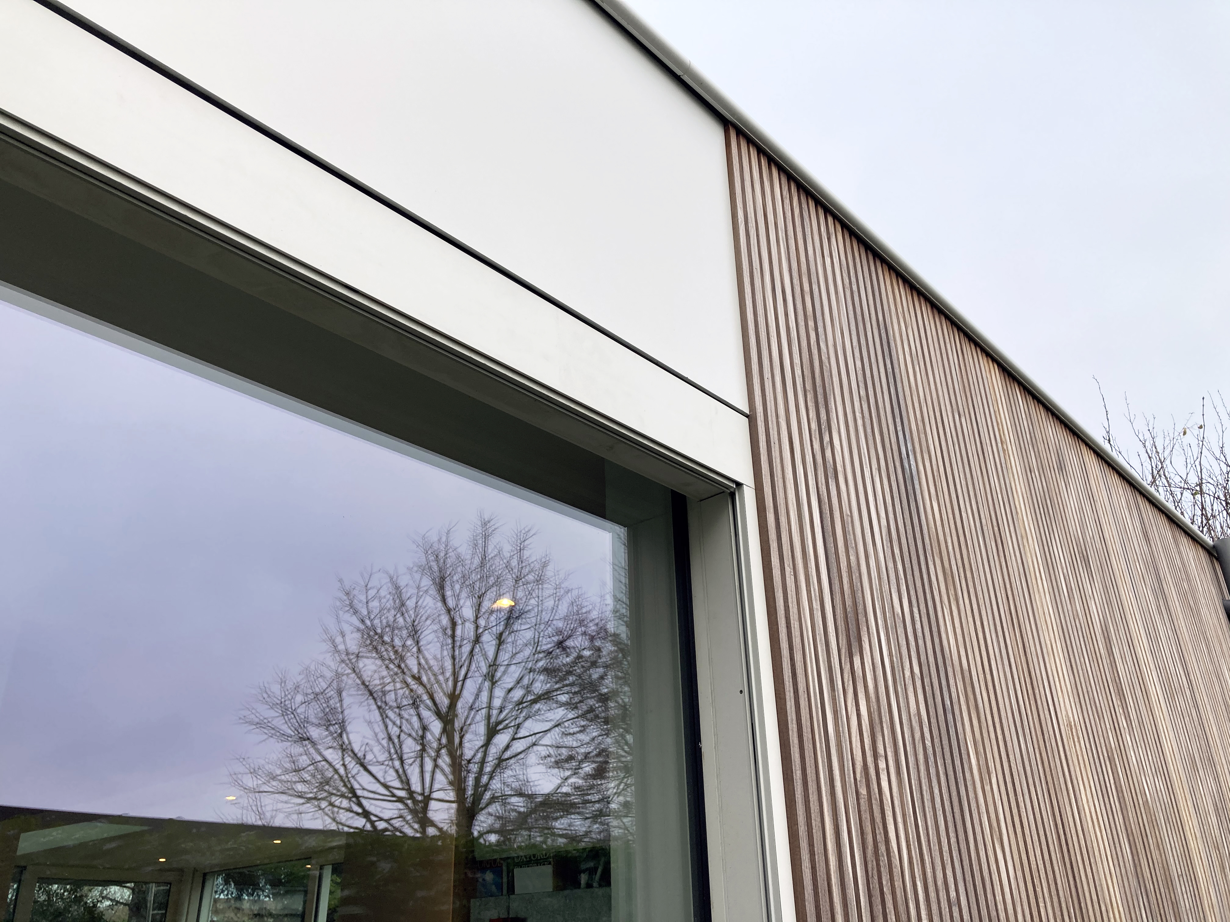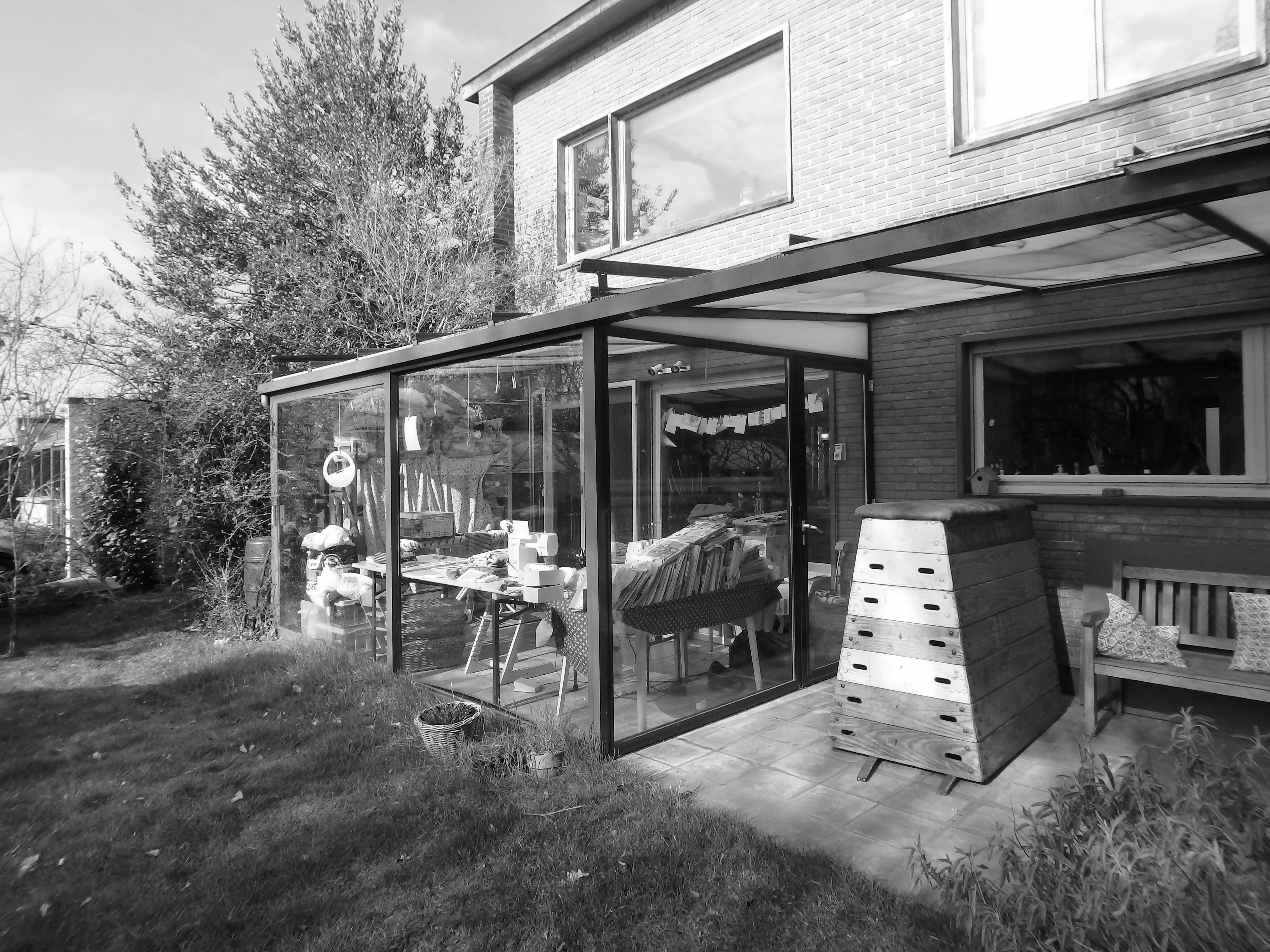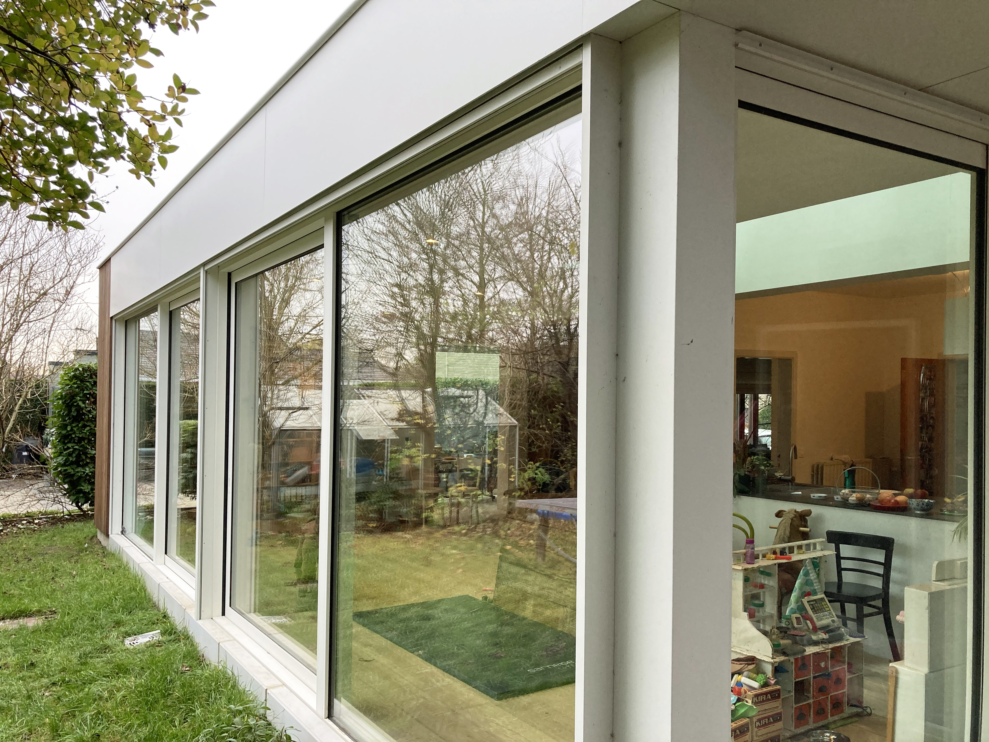 Wit gelakt aluminium, hout en glas zijn de gevelmaterialen die consequent zijn toegepast. Ze omarmen de massieve woning in rode baksteen en vormen een licht en transparant tegengewicht.