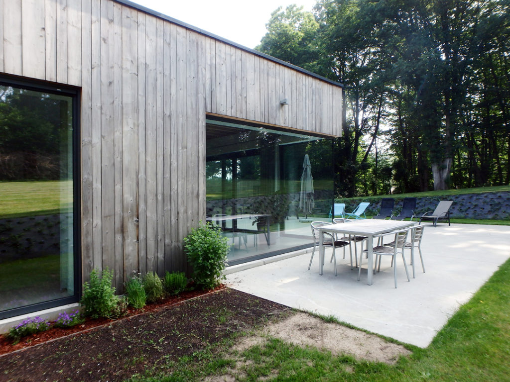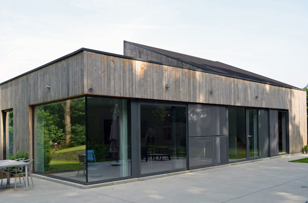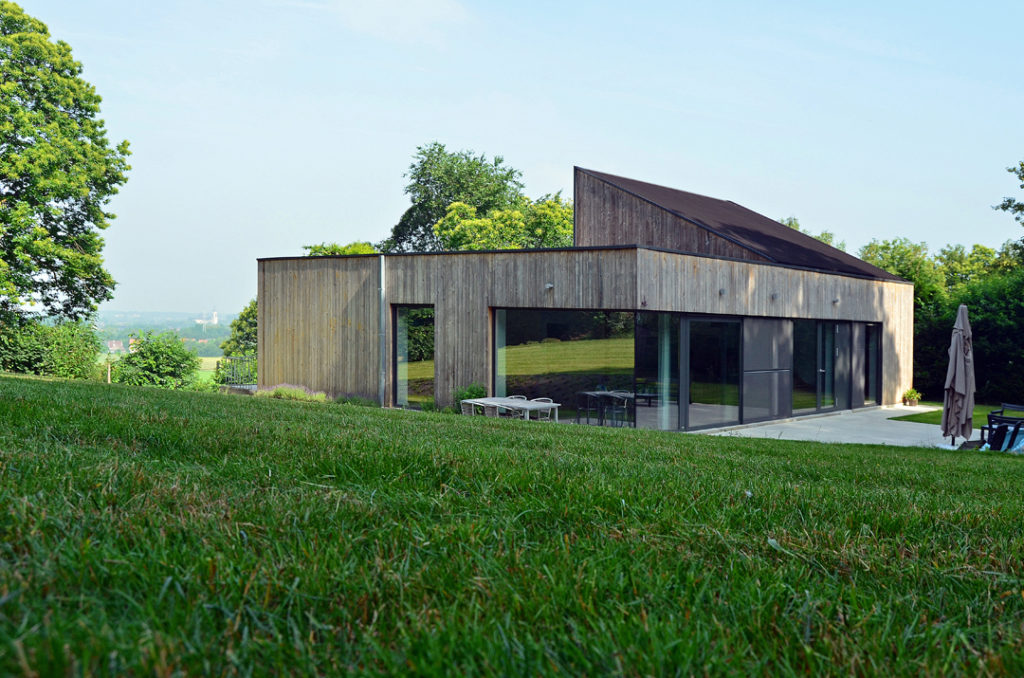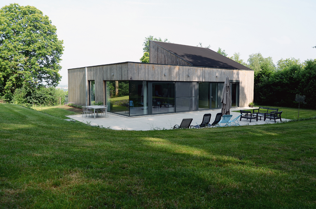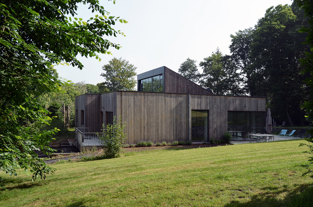 De gevelbekleding in grijs hout refereert naar de bosrijke omgeving. Het verticaal geplaatste hout, het lage volume en het spel van vlak en hellend dak laten de woning op een zo natuurlijk mogelijke wijze integreren in het groene heuvelachtige landschap.