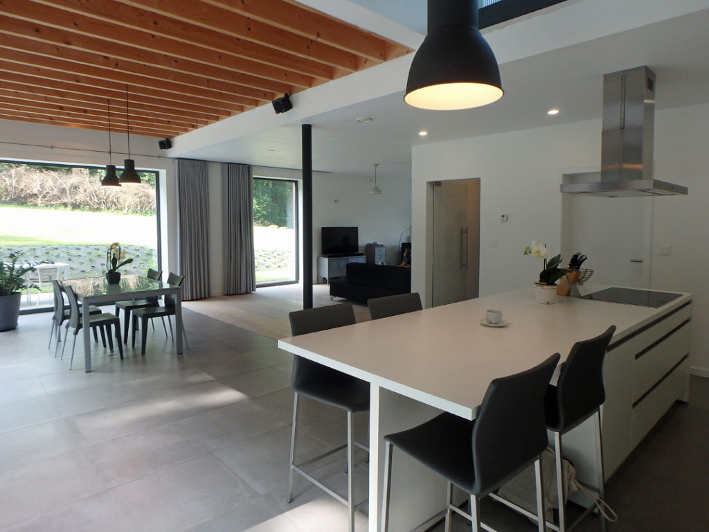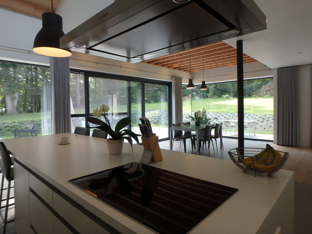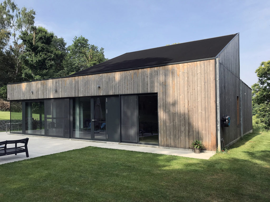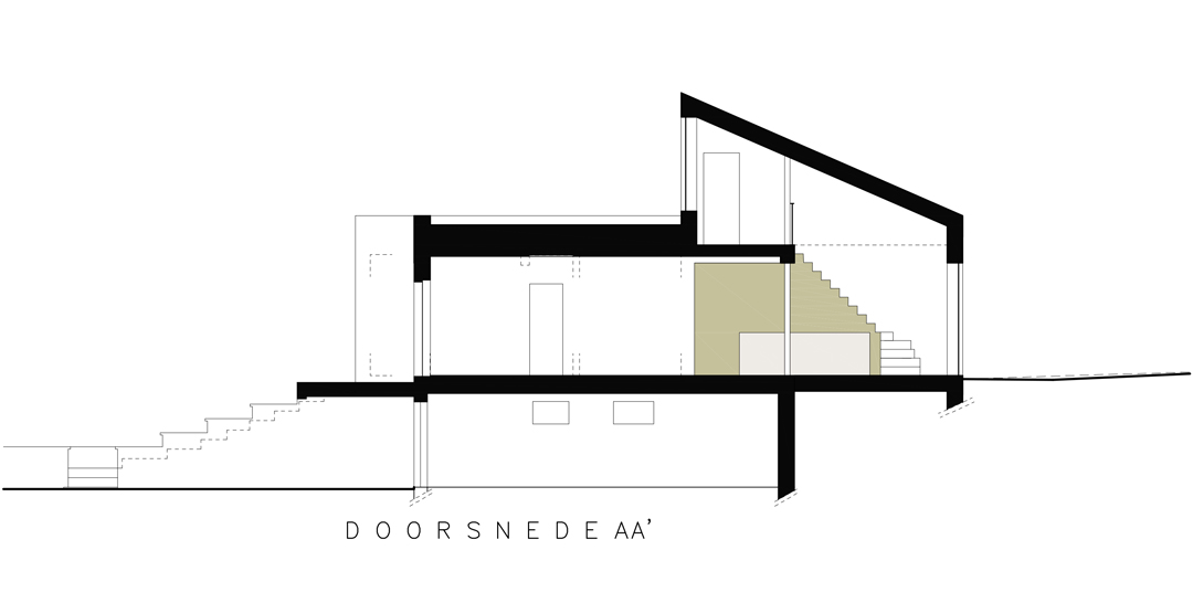 De gevelbekleding in grijs hout refereert naar de bosrijke omgeving. Het verticaal geplaatste hout, het lage volume en het spel van vlak en hellend dak laten de woning op een zo natuurlijk mogelijke wijze integreren in het groene heuvelachtige landschap.