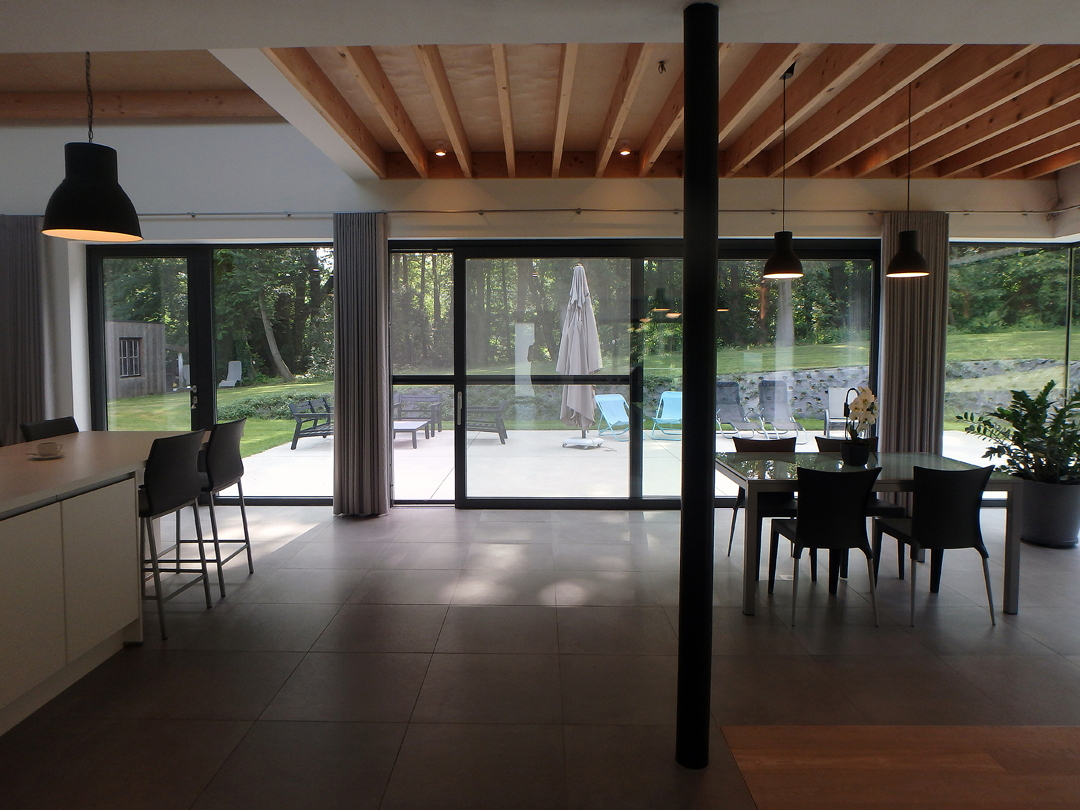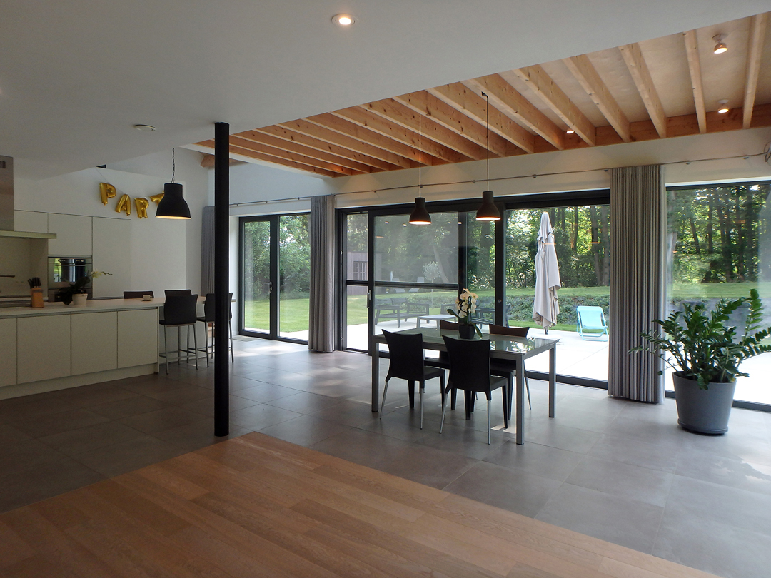 Het hout eist ook haar plek op in het interieur: de roosteringen van de daken van de uitbreidingen zijn uitgevoerd in geschaafd timmerhout en berkenmultiplex. Het hout contrasteert met het witte lichte interieur. Ook als de gordijnen gesloten zijn, zijn de bomen hier nooit ver af.