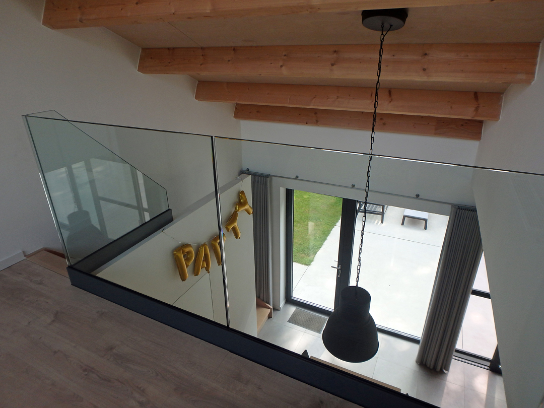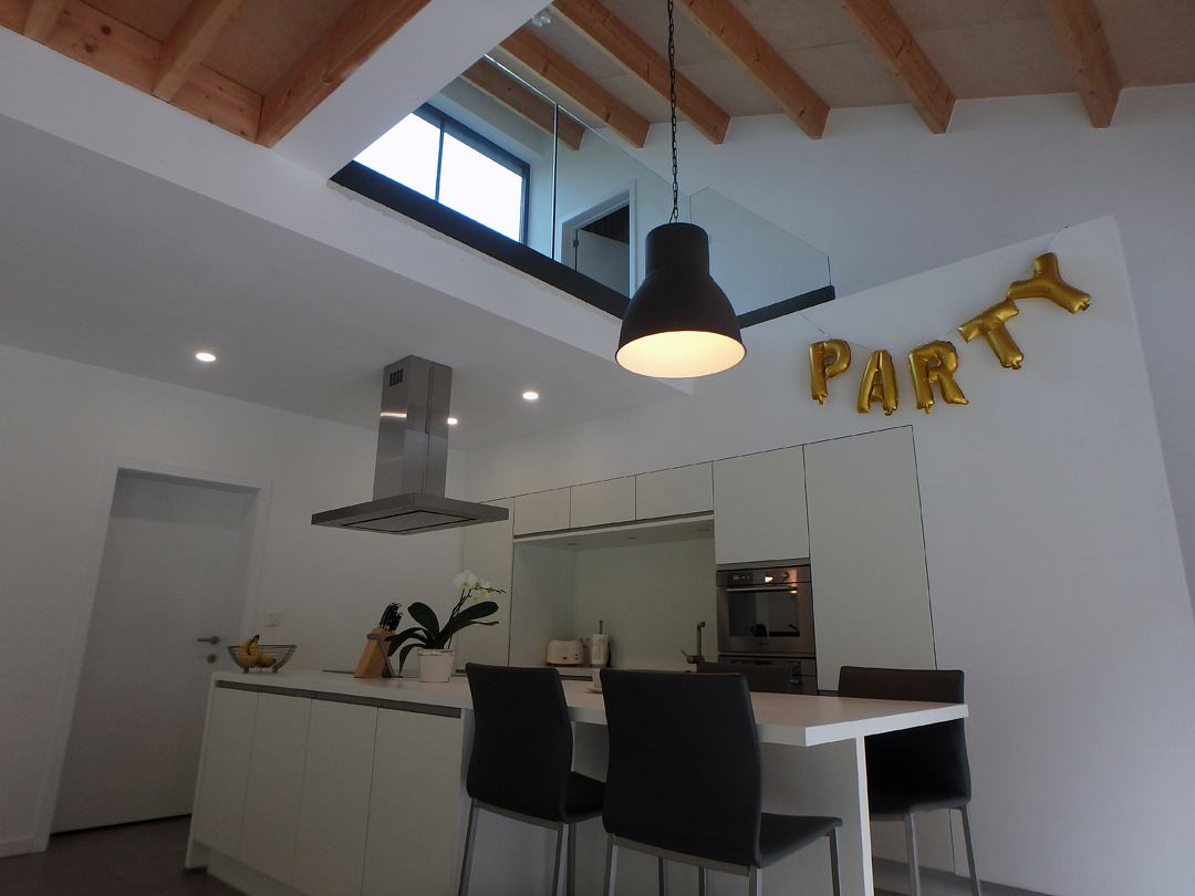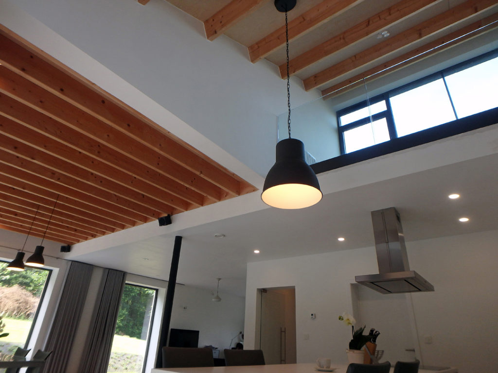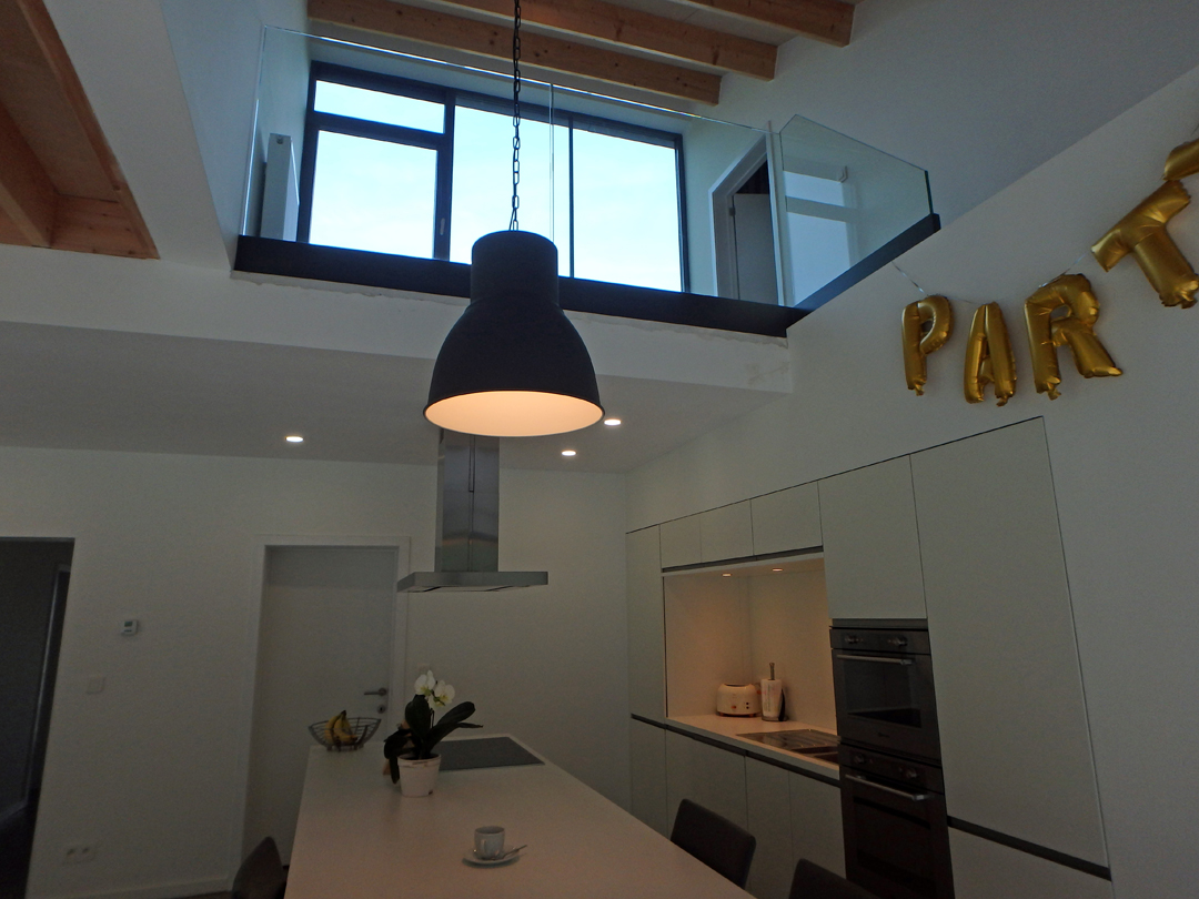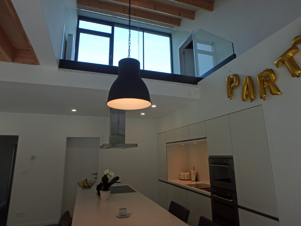Een smalle trap achter de keukenkasten leidt naar het ‘arendsnest’ waar het kamerbrede en -hoge raam een fenomenaal vergezicht biedt over het groen rond Leuven en veel verder…