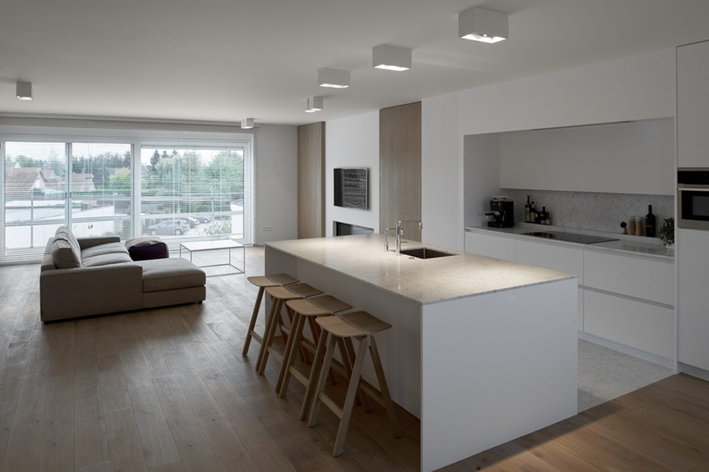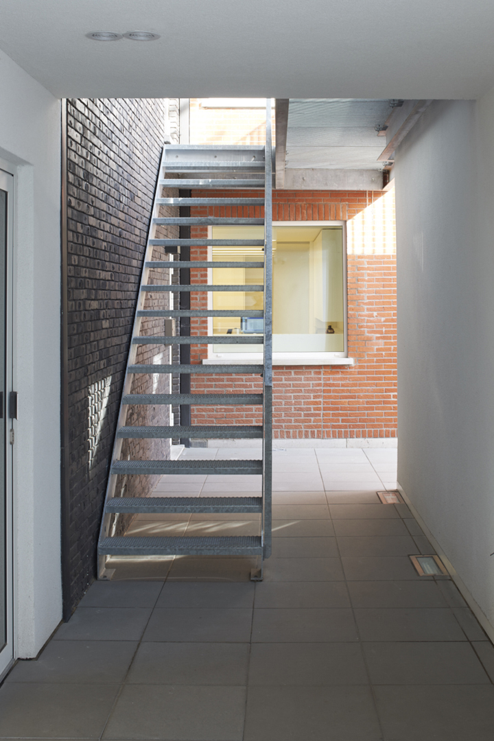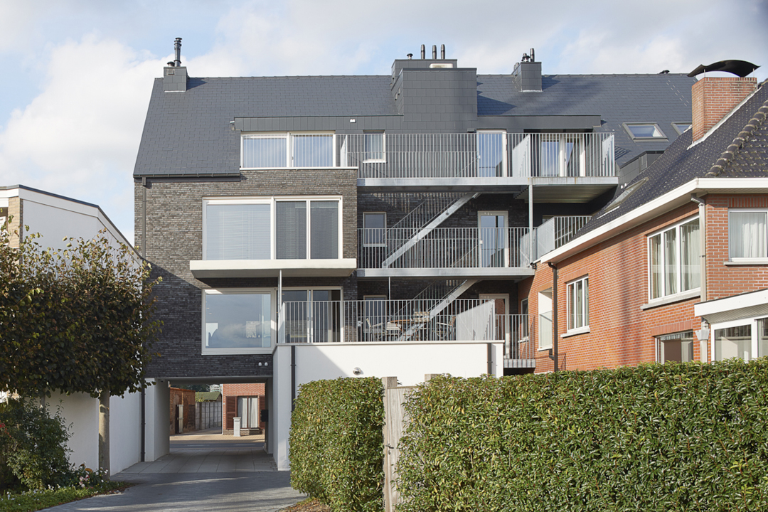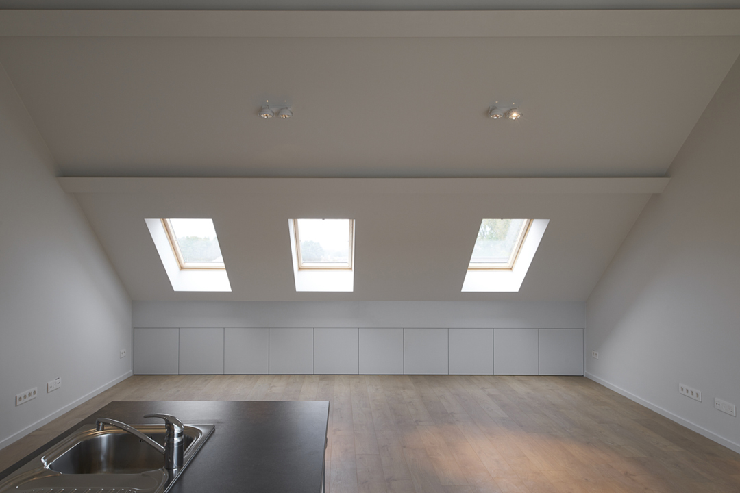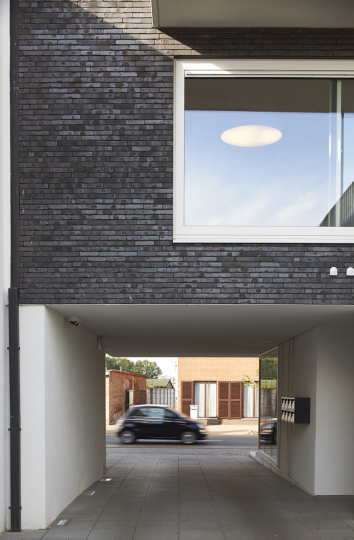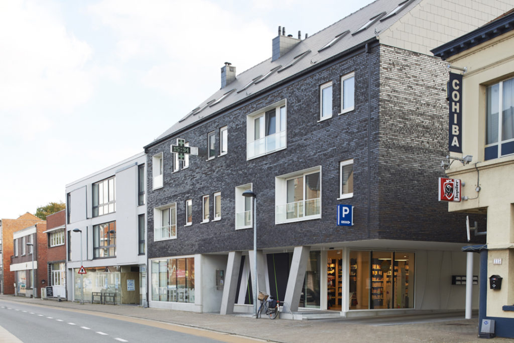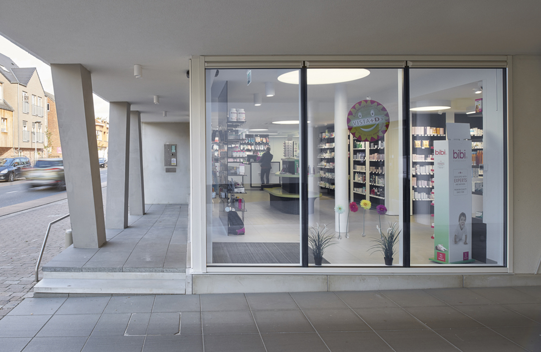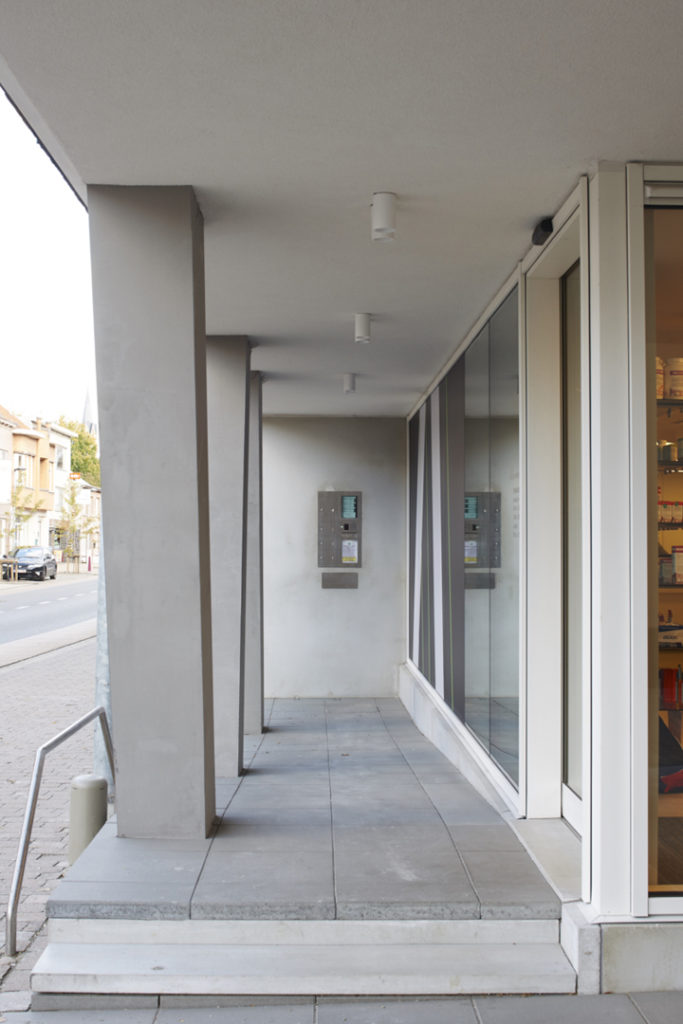 Het woongedeelte is ontworpen als een balk die opgetild wordt. Het publieke karakter van de gelijkvloerse handelsruimte komt zo optimaal tot uiting. Bovendien kan de circulatie, zowel binnen als buiten, op die manier ongehinderd georganiseerd worden. De achterliggende woning, parking en tuin worden op een heldere manier ontsloten.