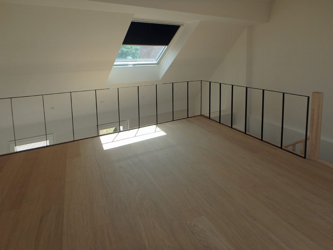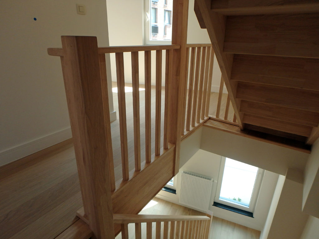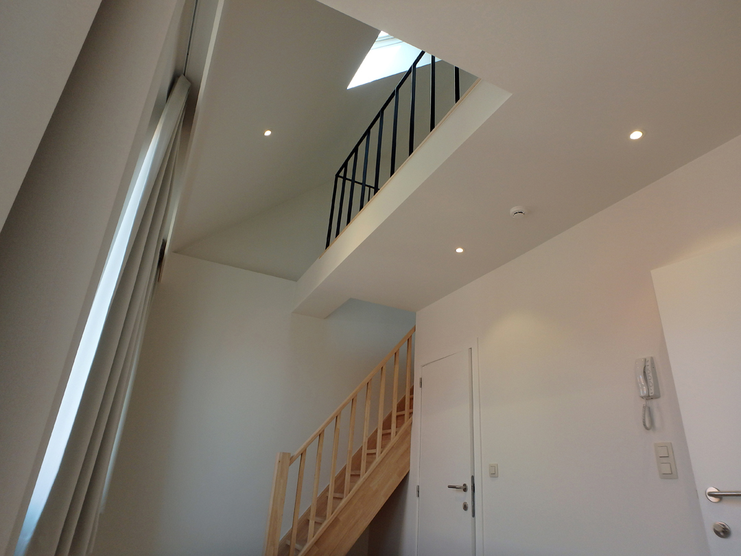 De woonfuncties bevinden zich boven elkaar met op de begane grond een leefkeuken anex patio. Een open trap verbindt de keuken met een zithoek op de verdieping en een slaapkamer. Erboven bevinden zich nog 2 slaapkamers.