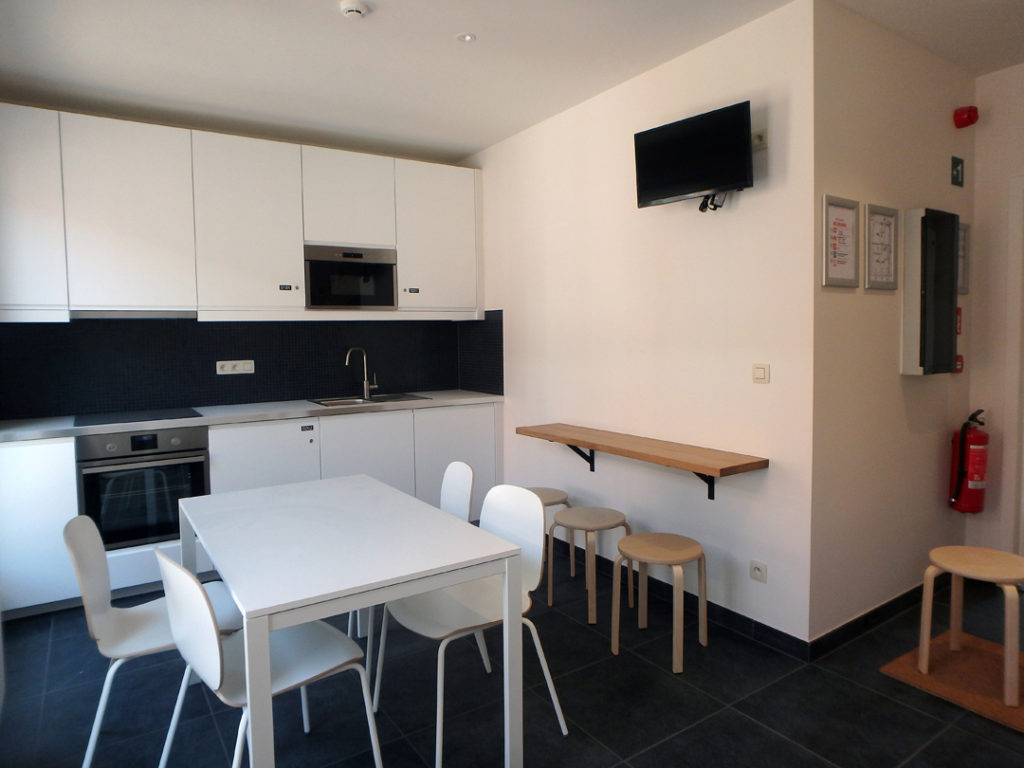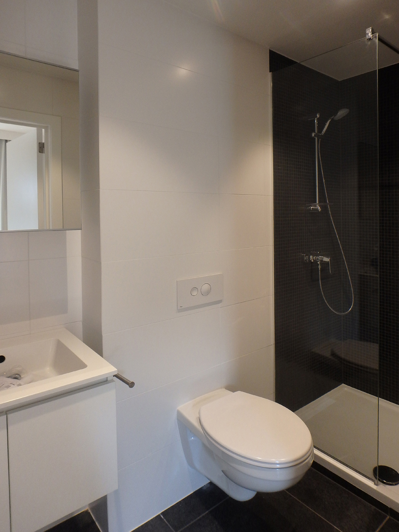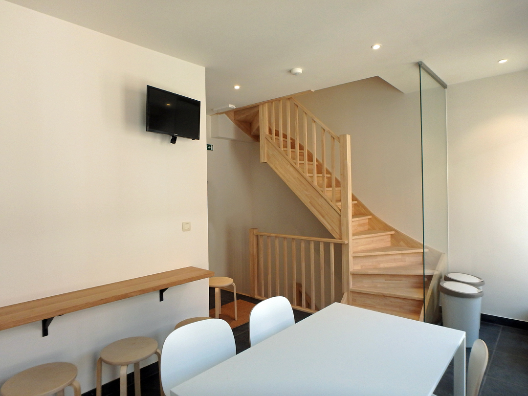 De studentenwoning heeft een afzonderlijke ingang. De 3 kamers hebben een eigen badkamer en een ruime open leefkeuken.