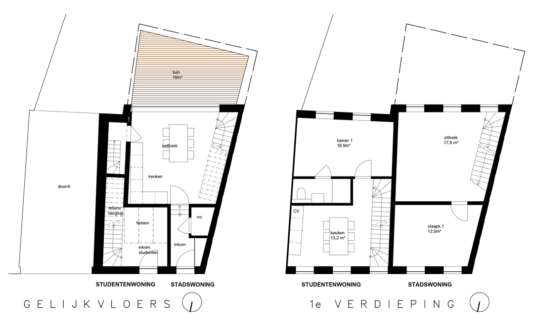 Een verkrotte woning met een ontoegankelijke verdieping boven een doorrit werd deels gesloopt en herbouwd tot een hedendaagse lichte stadswoning met een afzonderlijke studentenwoning met 3 kamers.
