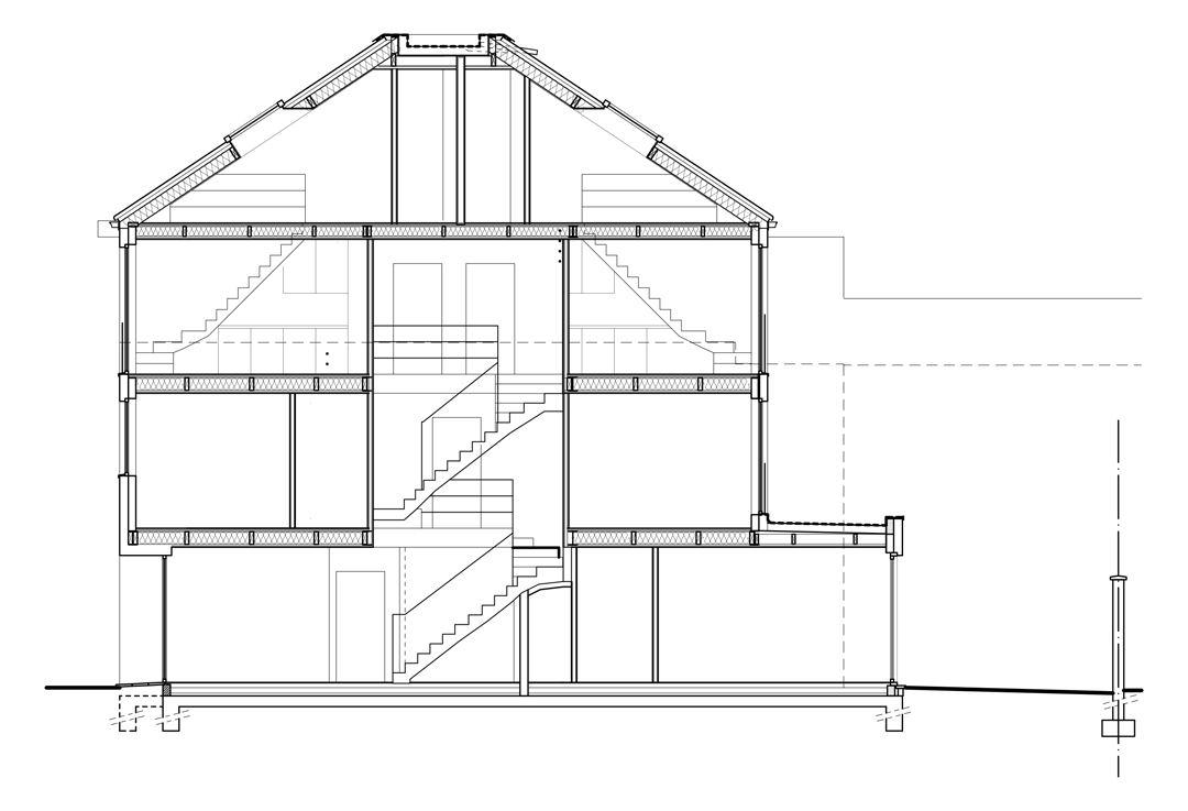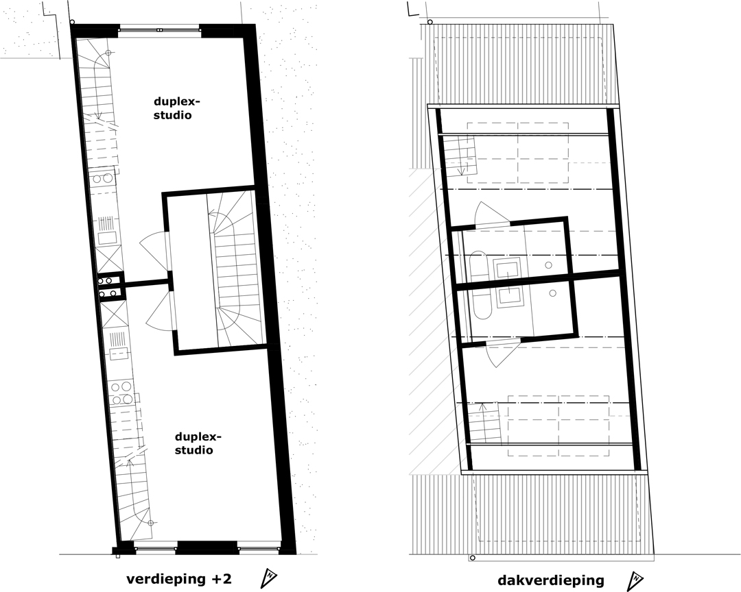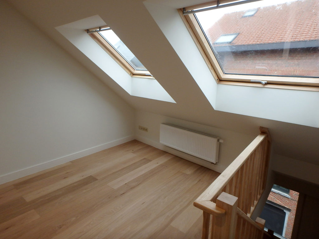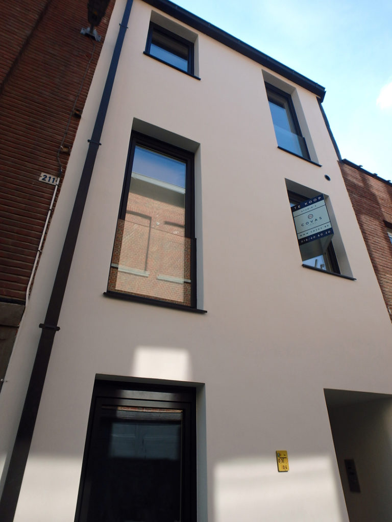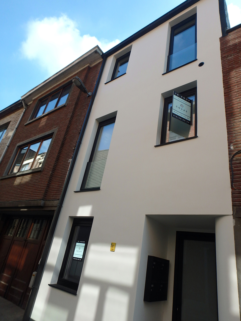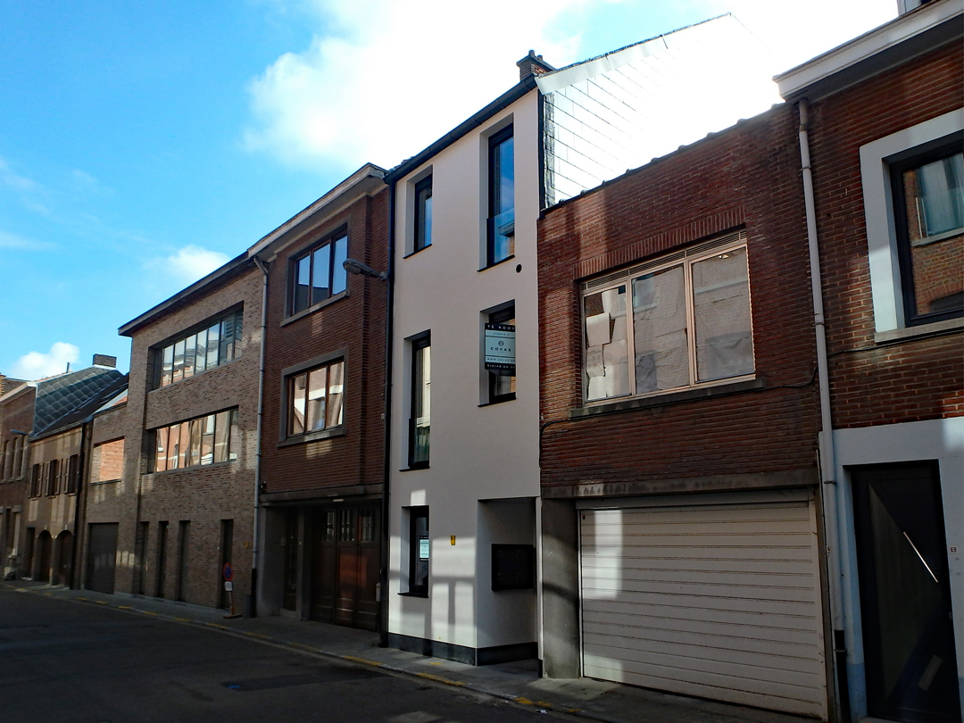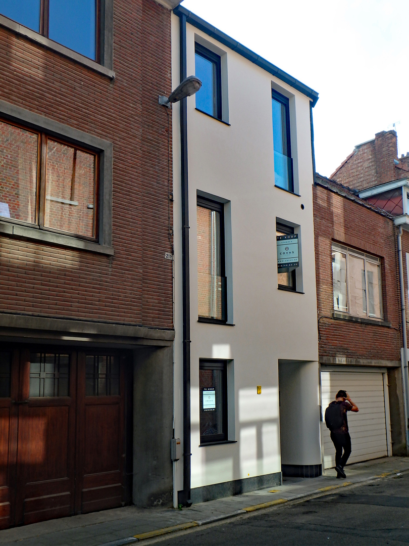 Op een heel smal perceel in het stadscentrum werd een garagebox vervangen door een pand met 4 woonentiteiten. Ondanks de beperkte breedte, geniet elke woning van daglicht en ruimtelijkheid. Het ruimtegevoel komt maximaal tot uiting in de 2 duplexappartementen die zich deels onder het zadeldak bevinden.